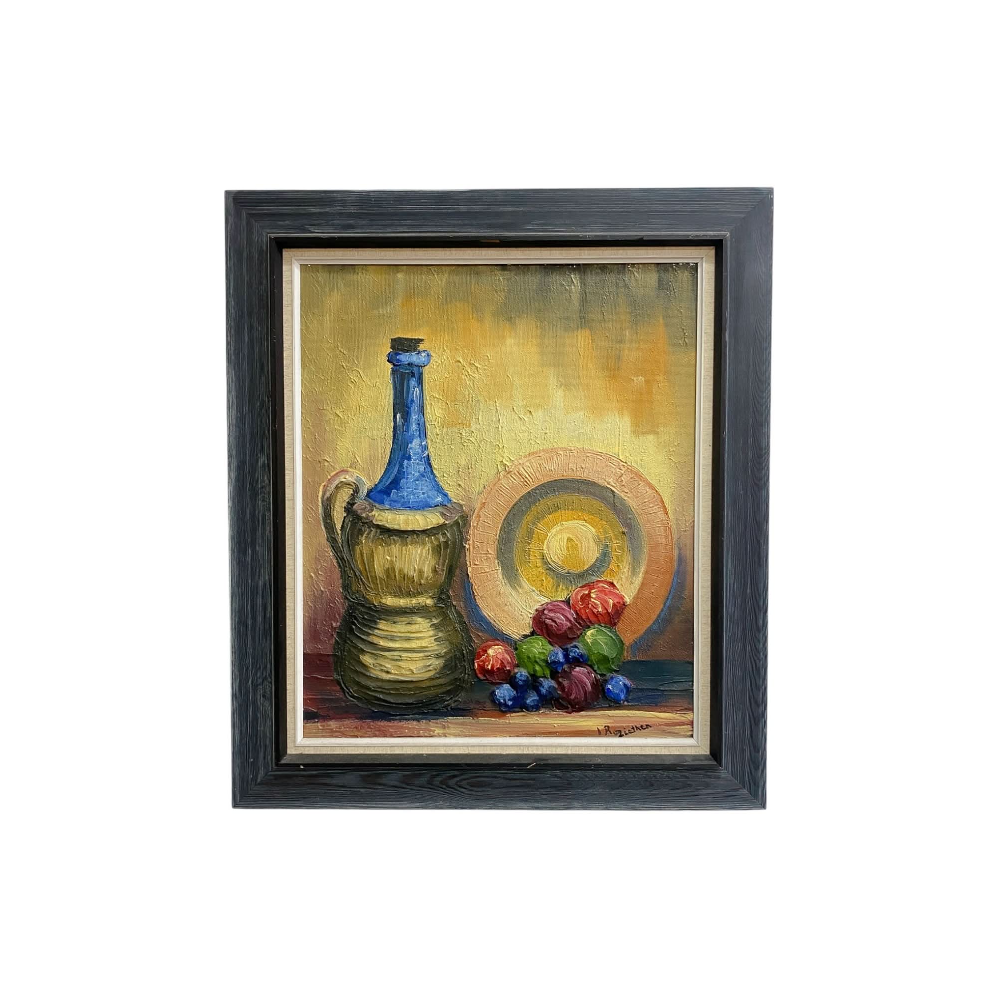 Mid century Danish still life oil painting by R. Ziethen features a tall, blue bottled vessel with an ornate base, a decorative plate with concentric circles, and a rich assortment of grapes and fruit. The warm, golden background contrasts beautifully with the deep blues and earthy tones. Framed in a sleek, dark wood frame.