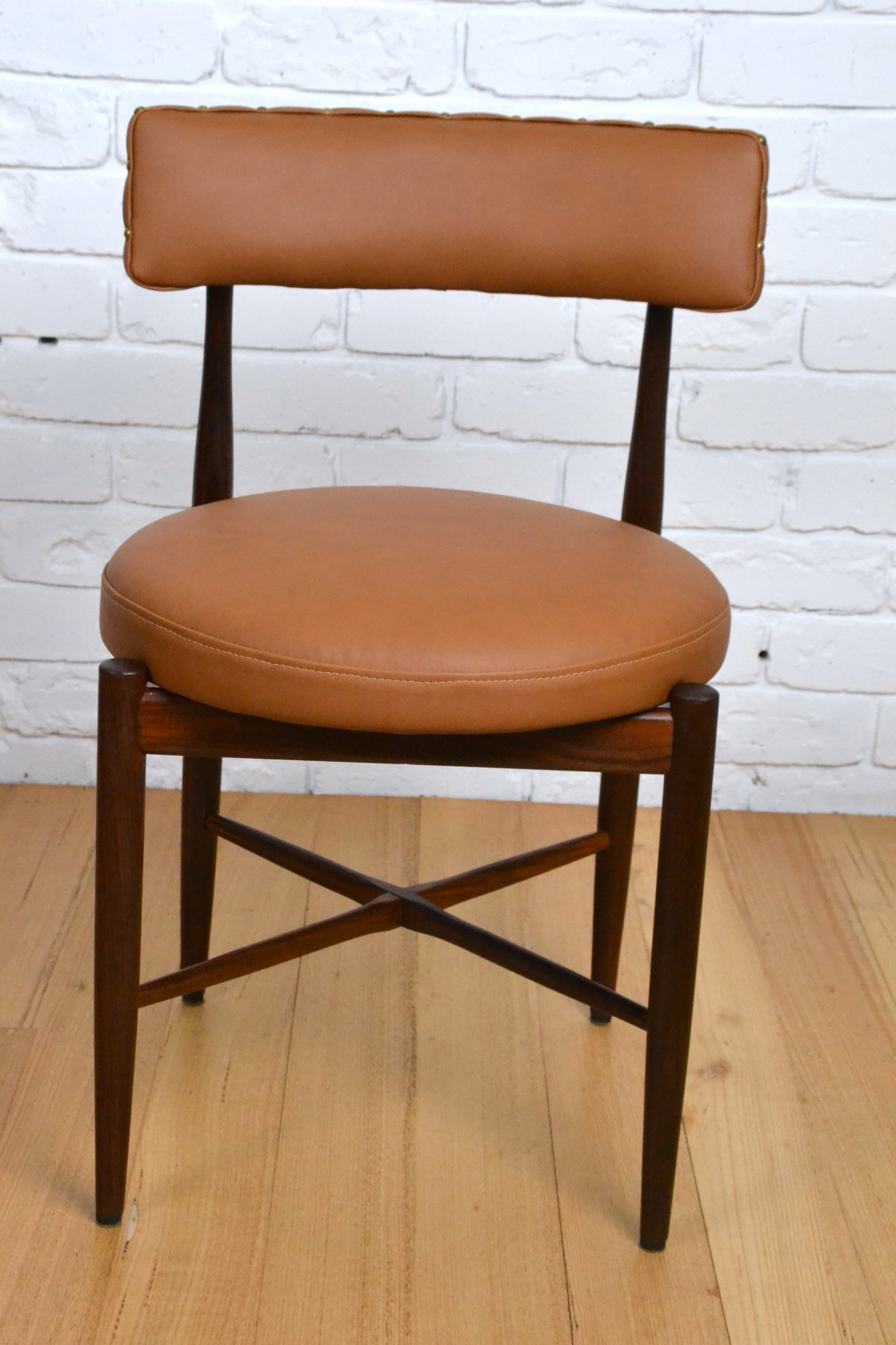 New upholstery in tan vinyl from Worley group. Teak veneer backs with Rosewood frames.