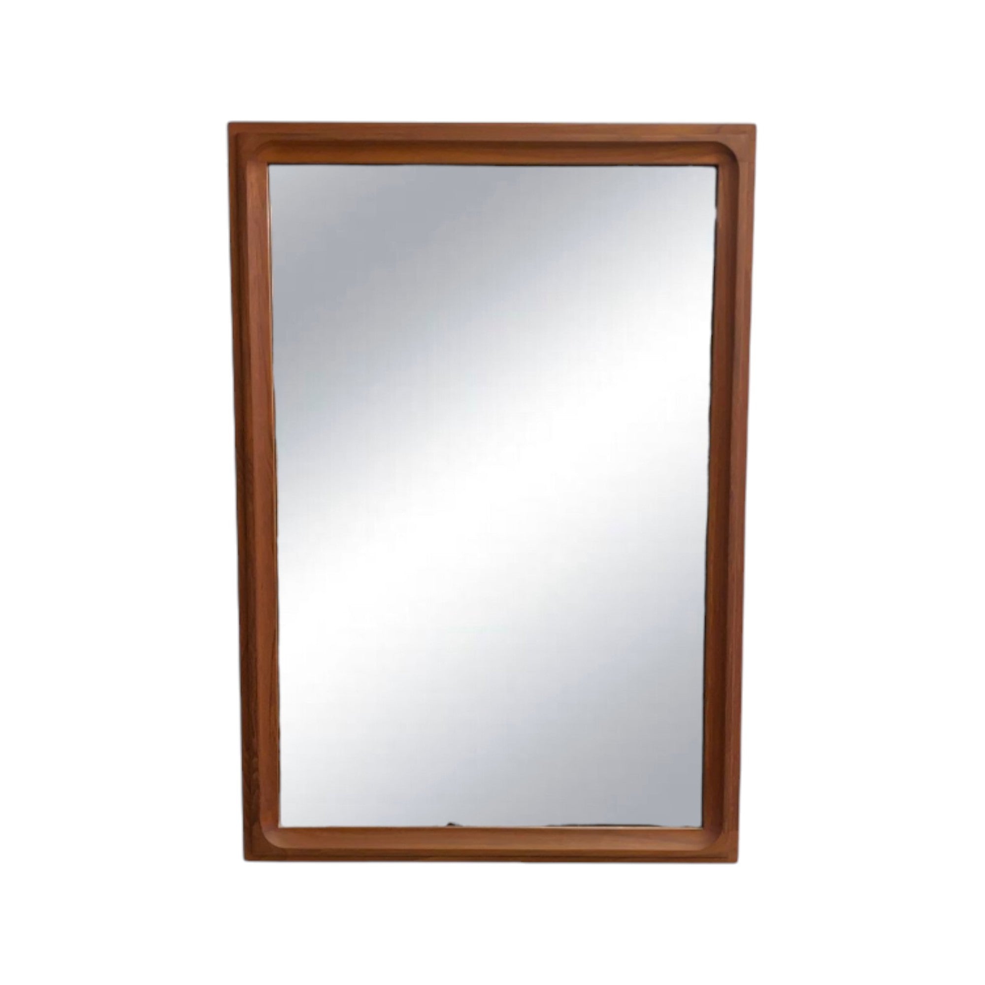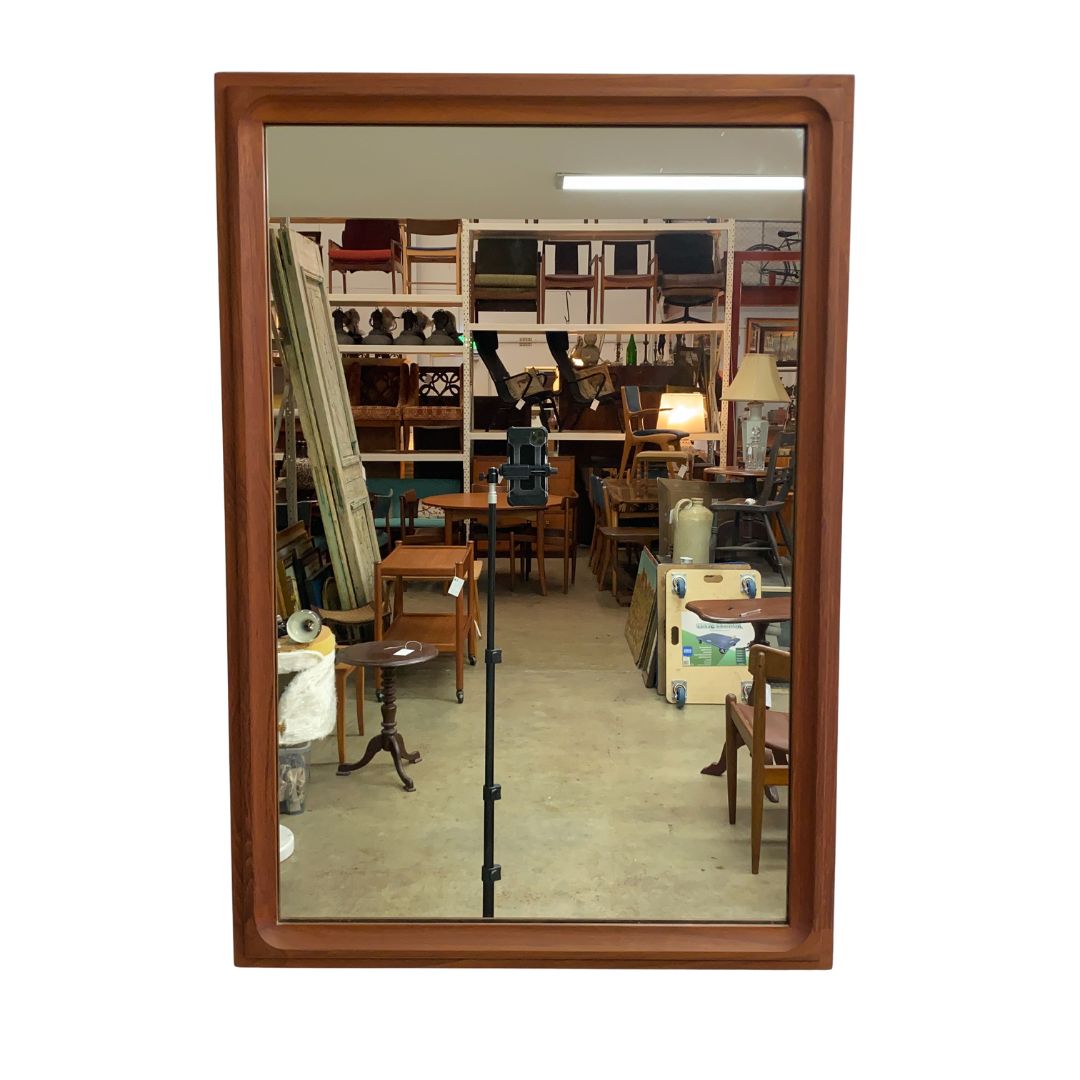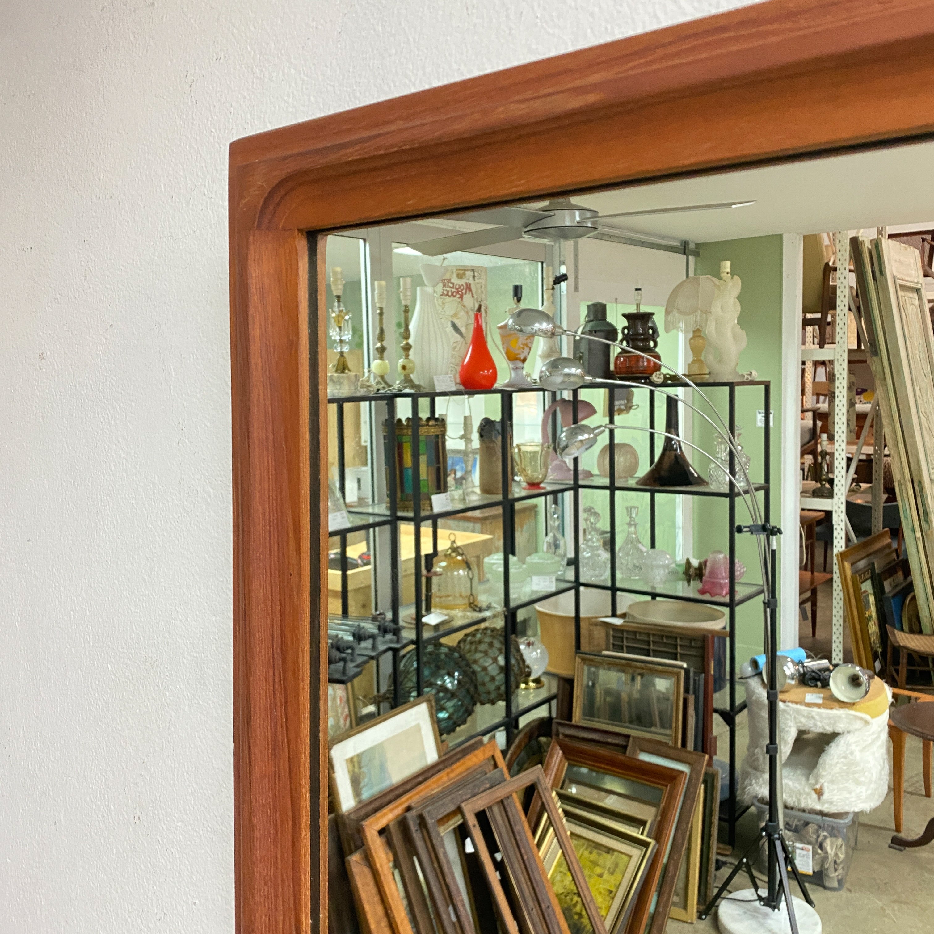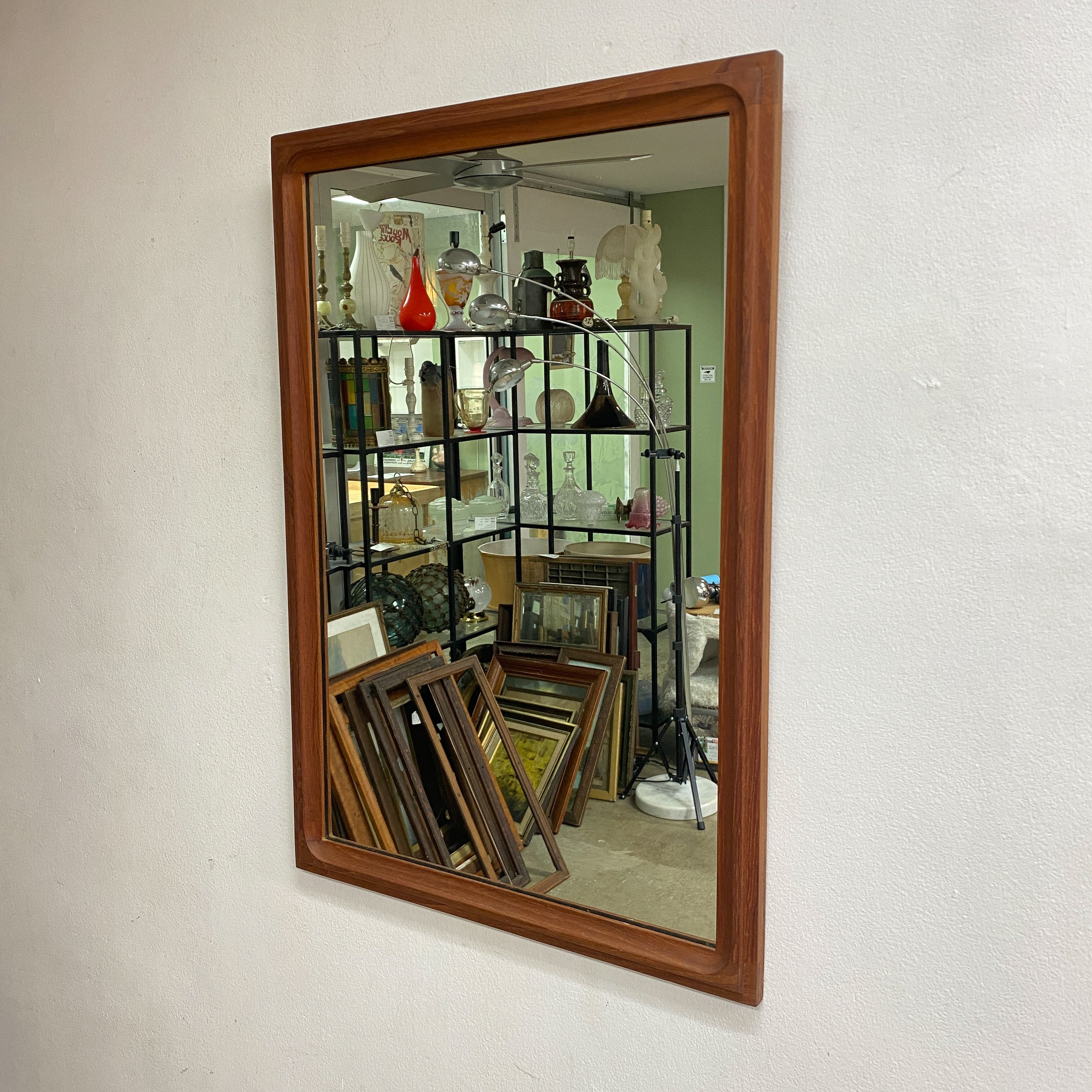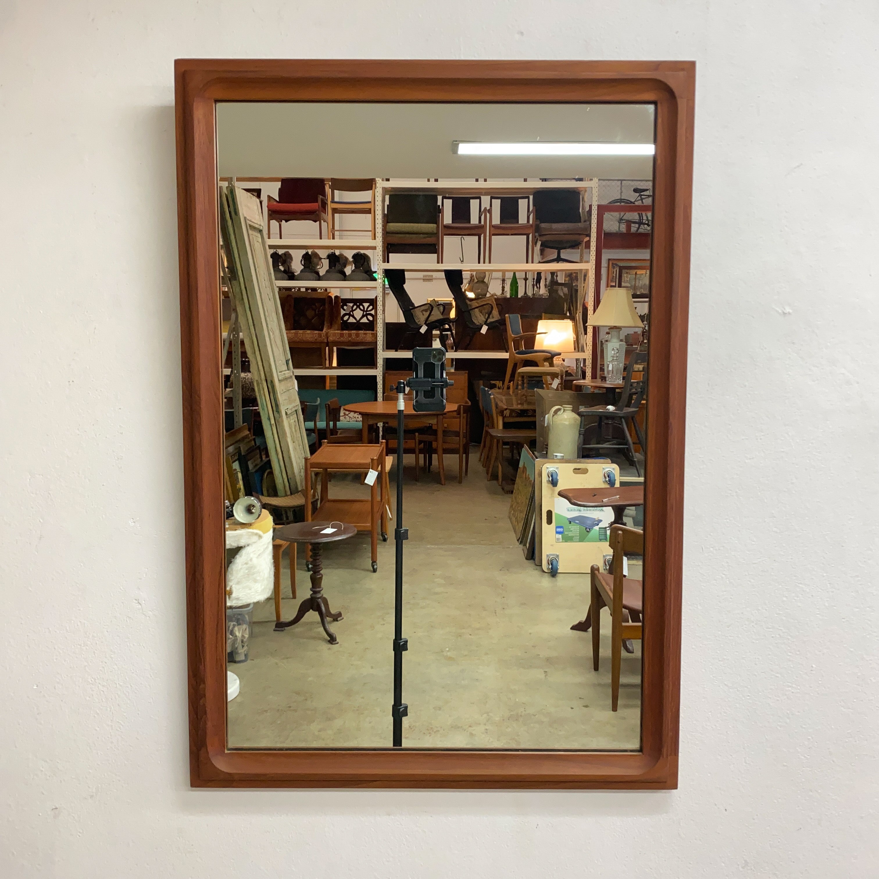 Great mid century modern Parker wall mirror, with beautiful carved teak finger jointed and recessed frame with original hanging chain. In excellent condition with some signs of use commensurate with age.
