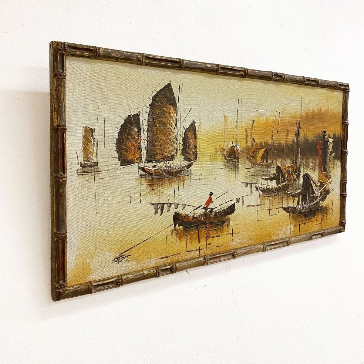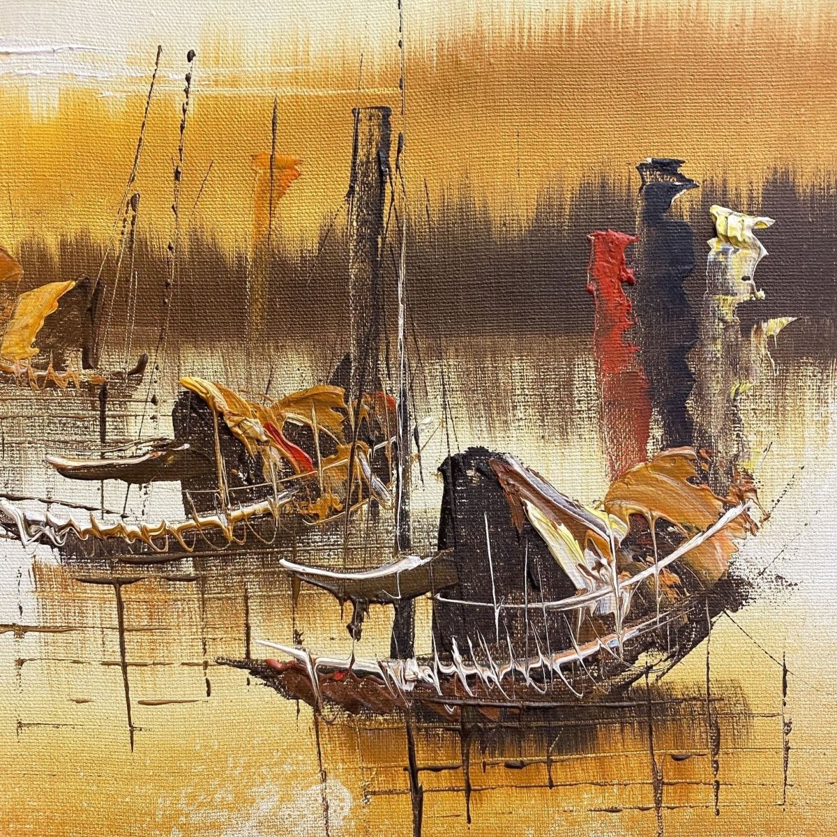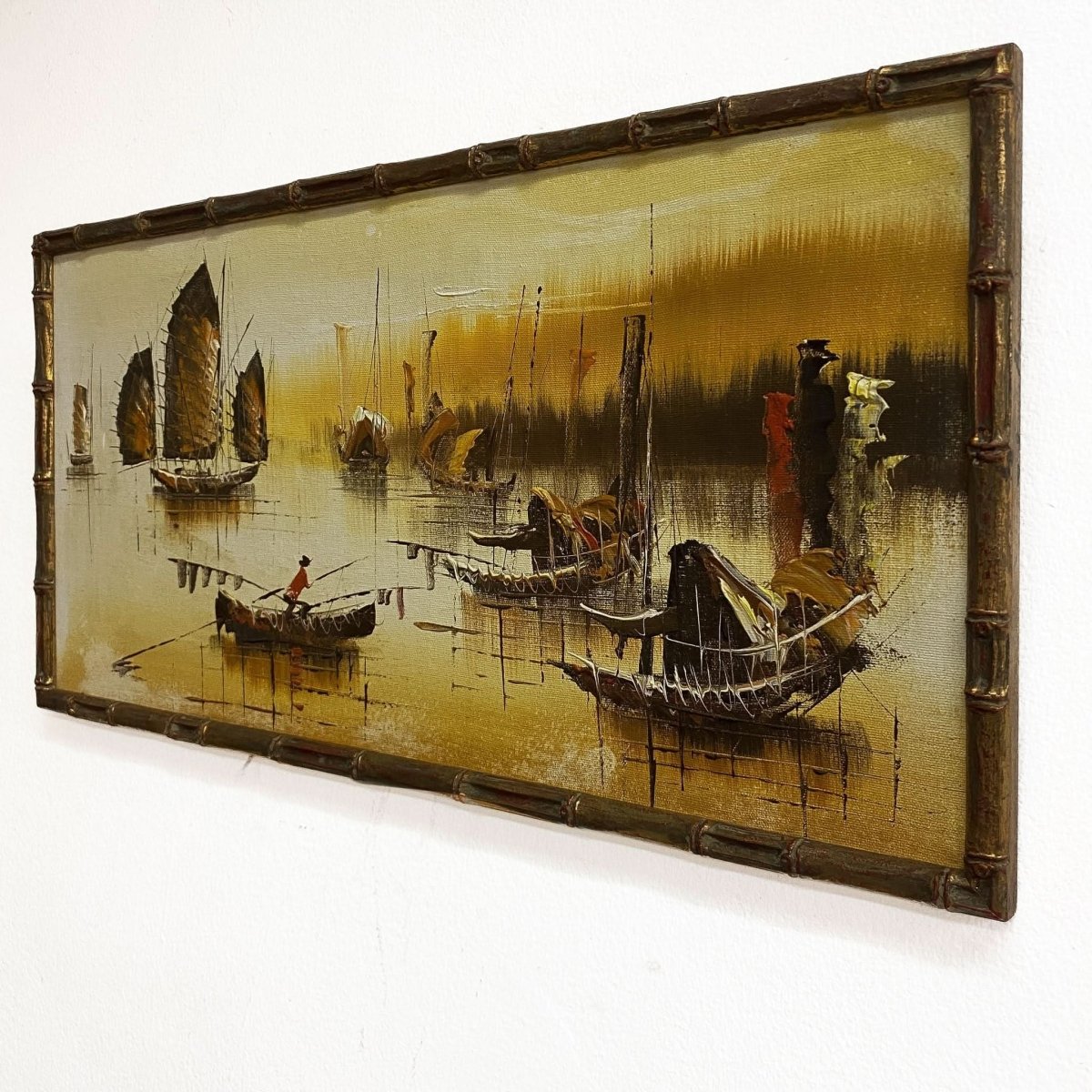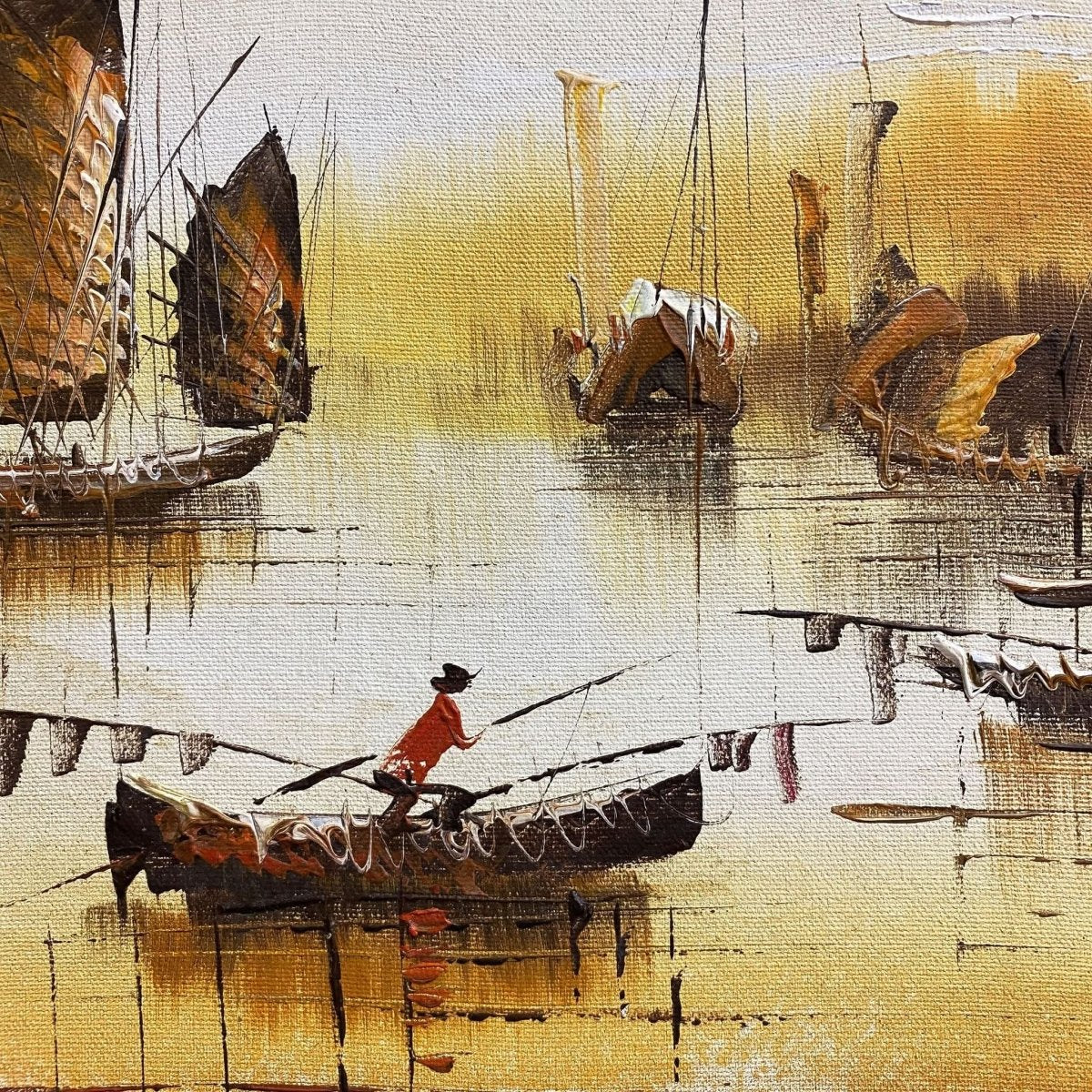 Depicting a serene riverscape with traditional Asian fishing boats and junks. Warm, earthy colour palette with golden hues that create a tranquil and atmospheric scene. Encased in a unique bamboo style frame.