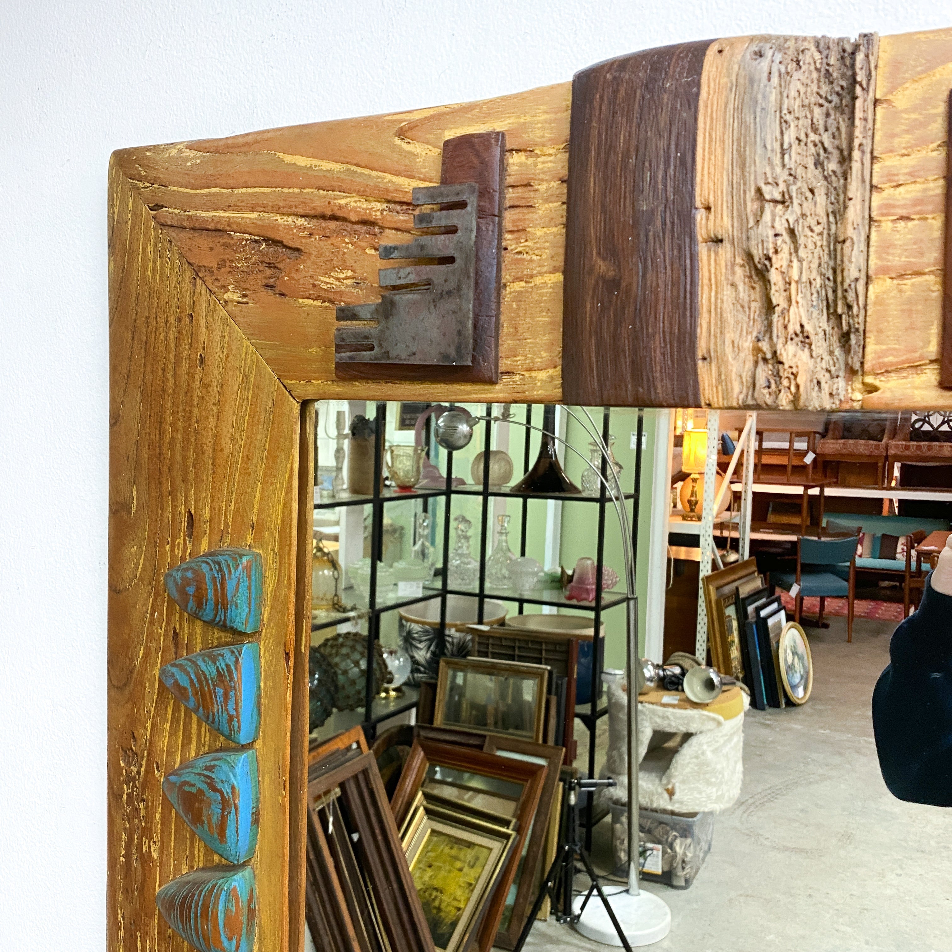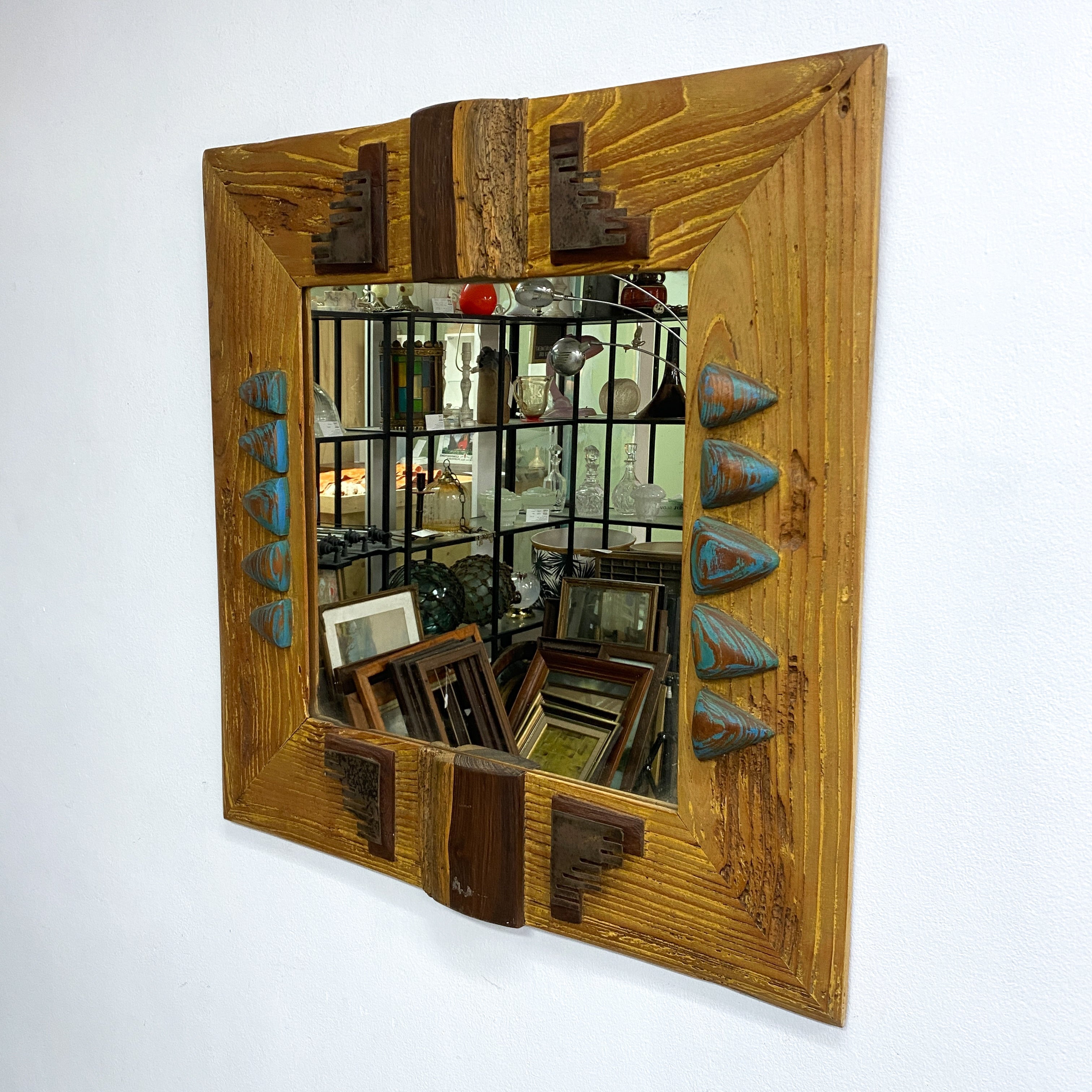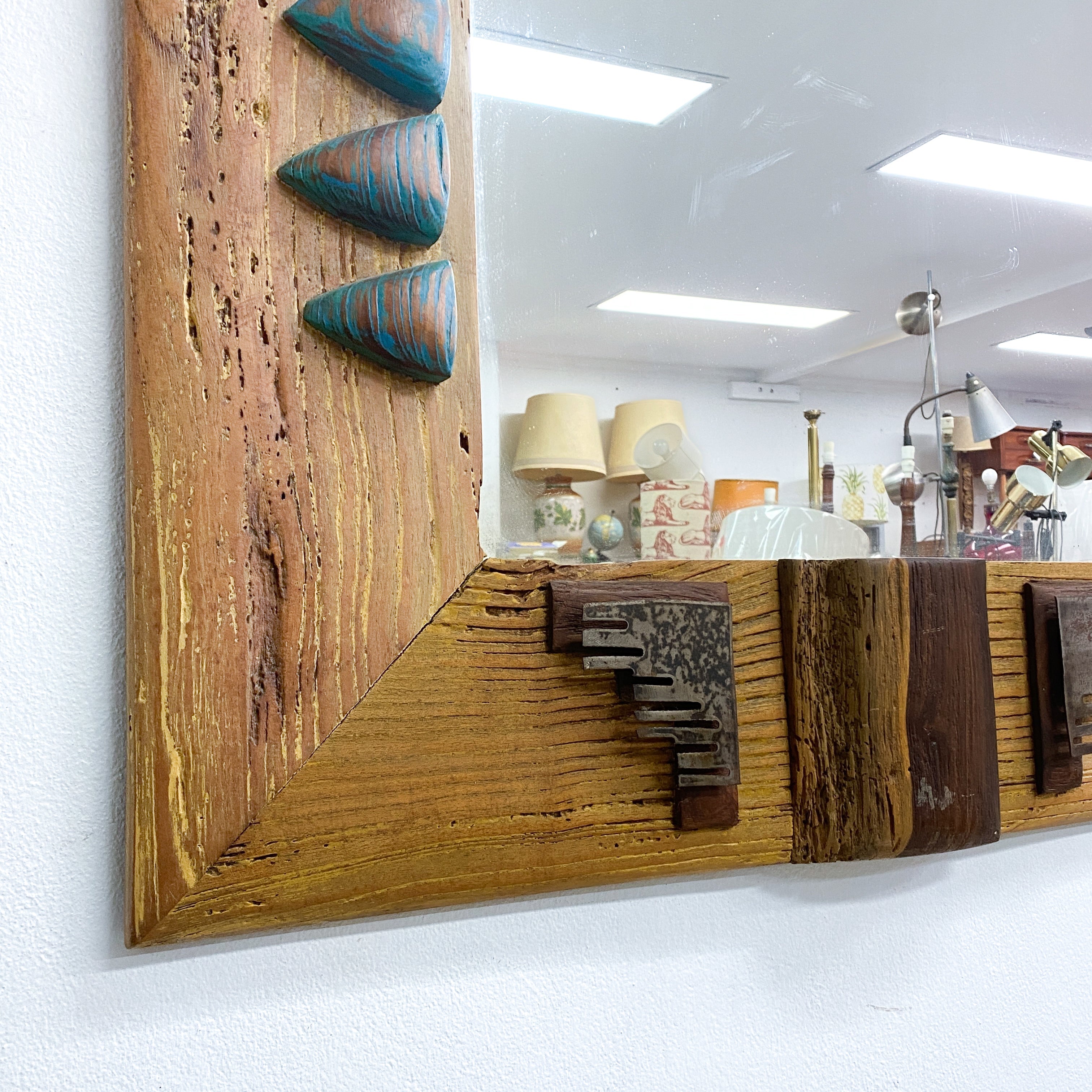 1980s postmodern mirror features a handcrafted wooden frame with Southwestern and brutalist design elements. With sculptural inlays and striking geometric accents, it’s both a functional mirror and a conversation-starting wall piece