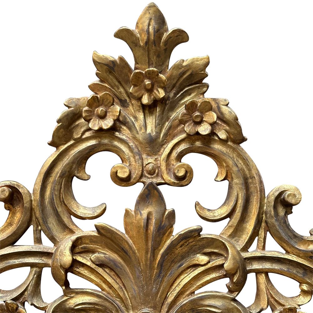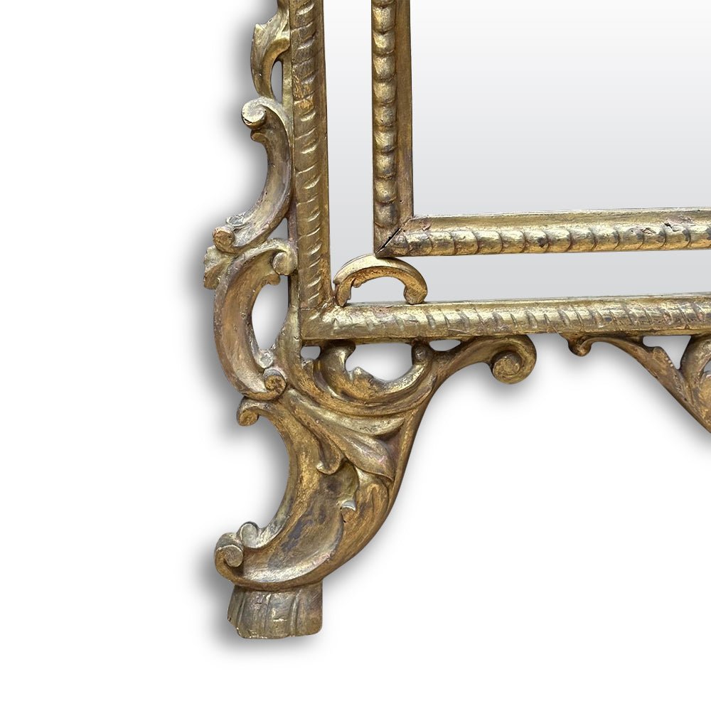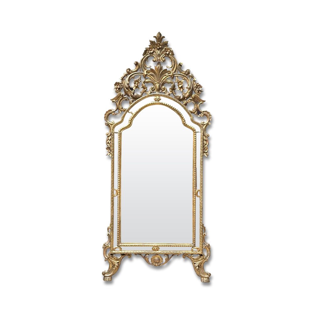This mirror is ornately carved and has been gilt, showing a beautiful original patina. The decorative rococco scrolls come to a point at the top, and at the bottom the mirror rests on two feet. It can either be leant against a wall or hung, as it has a sturdy hanging wire.
