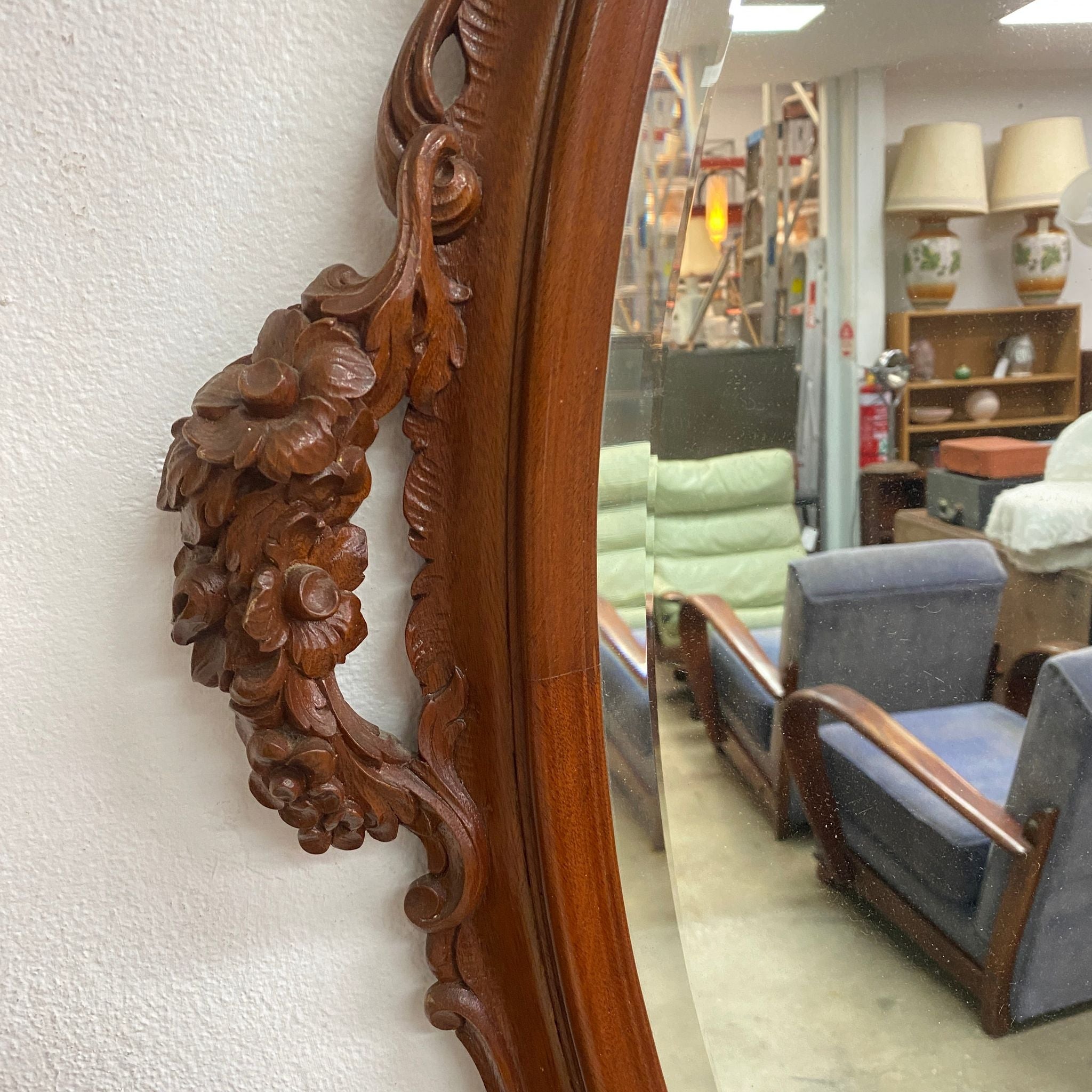 Detailed 20th Century mirror features an intricately carved wooden frame. The oval bevelled glass adds a touch of refinement, making it a stunning statement piece.