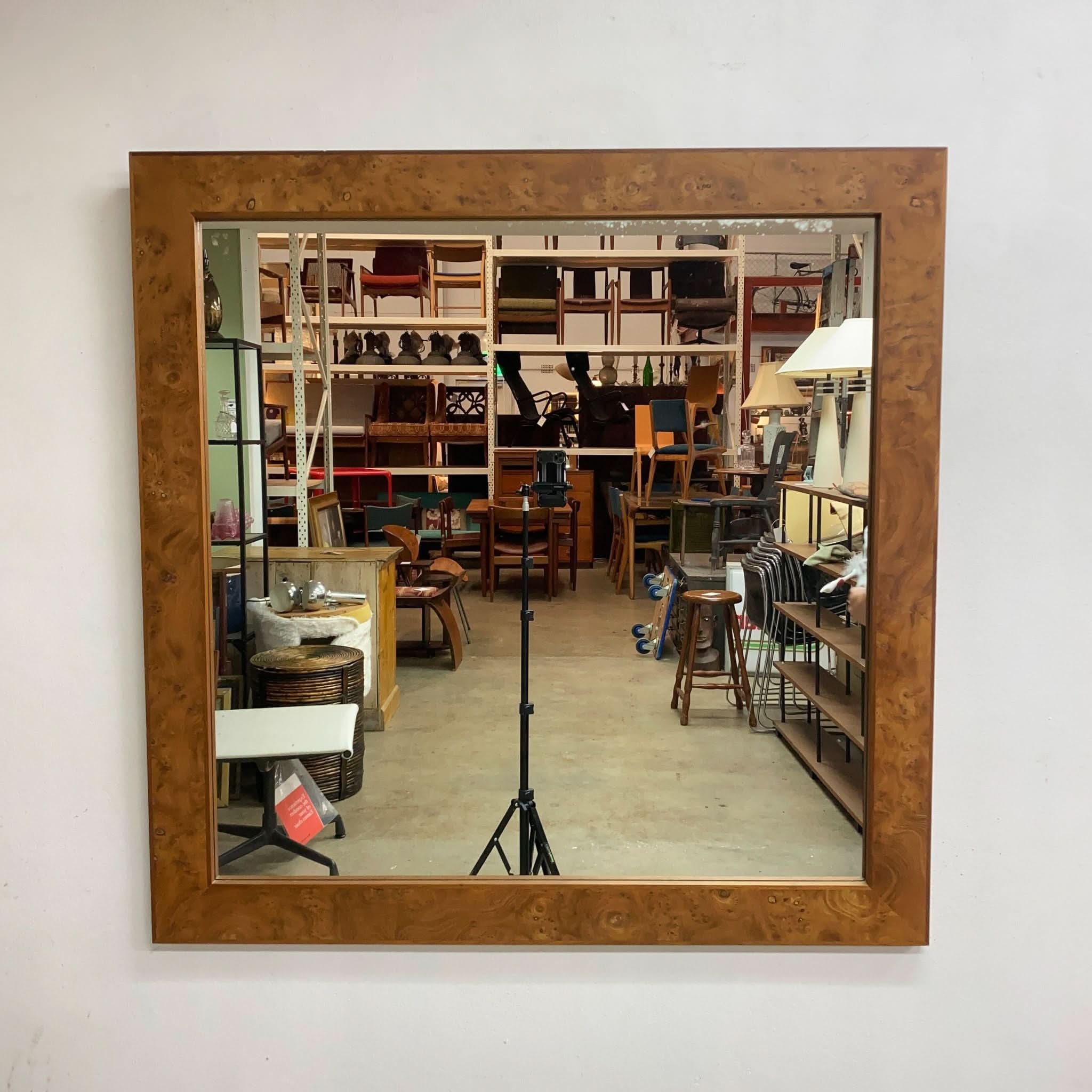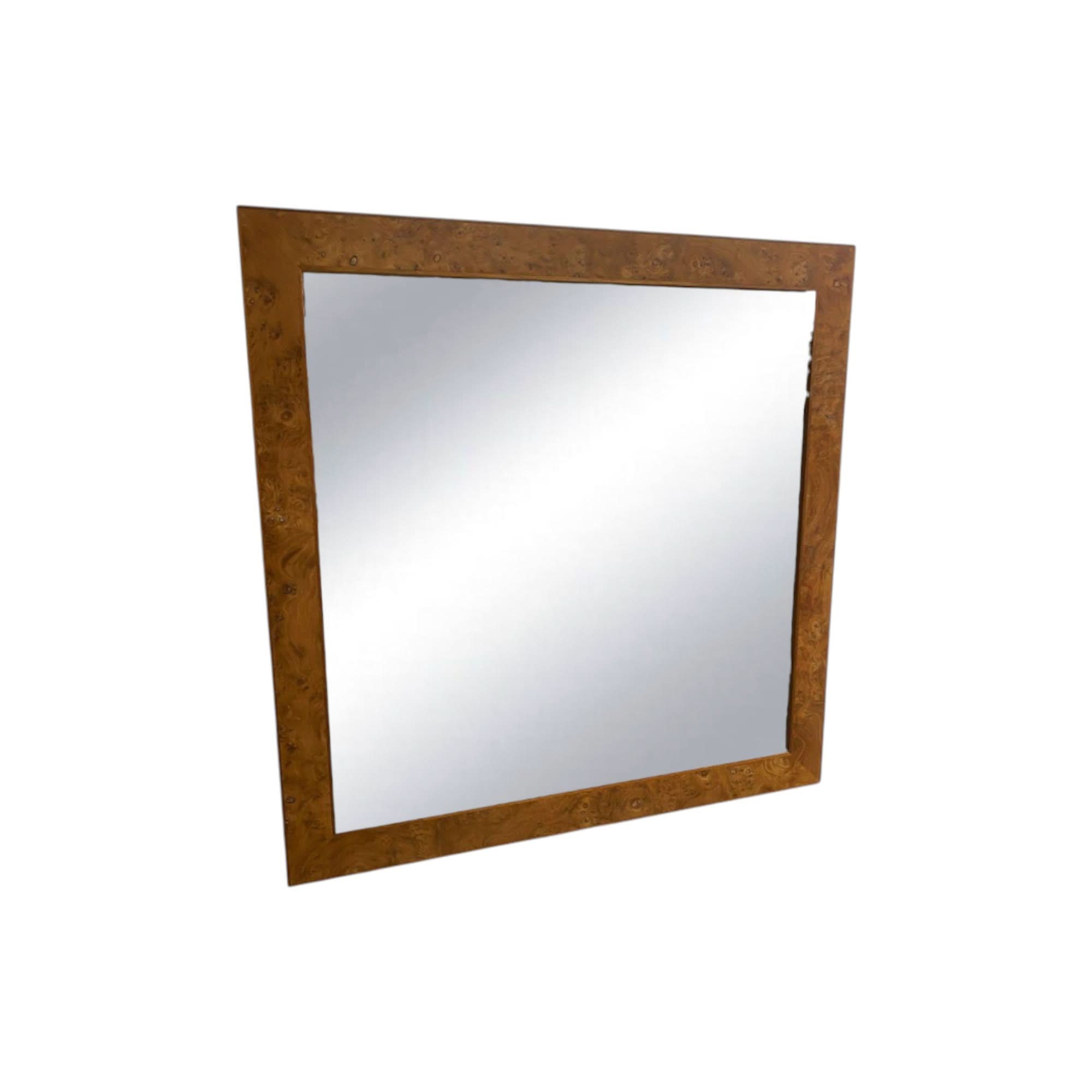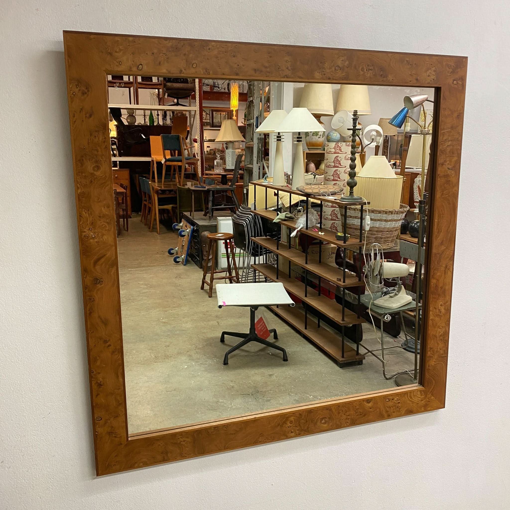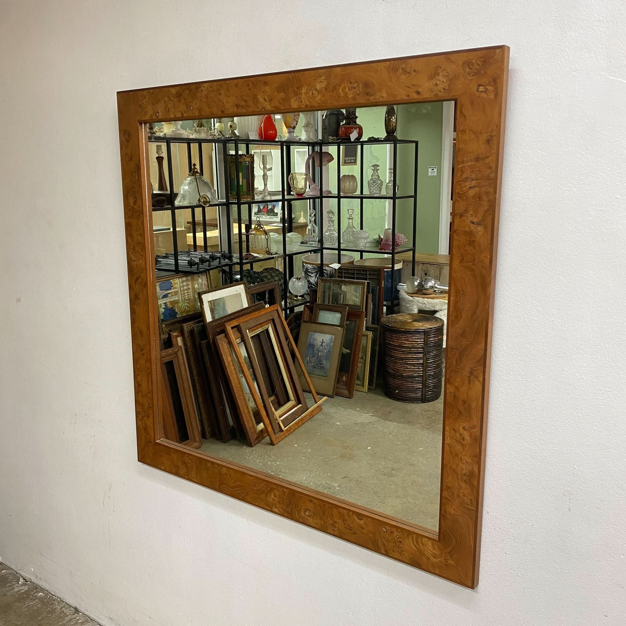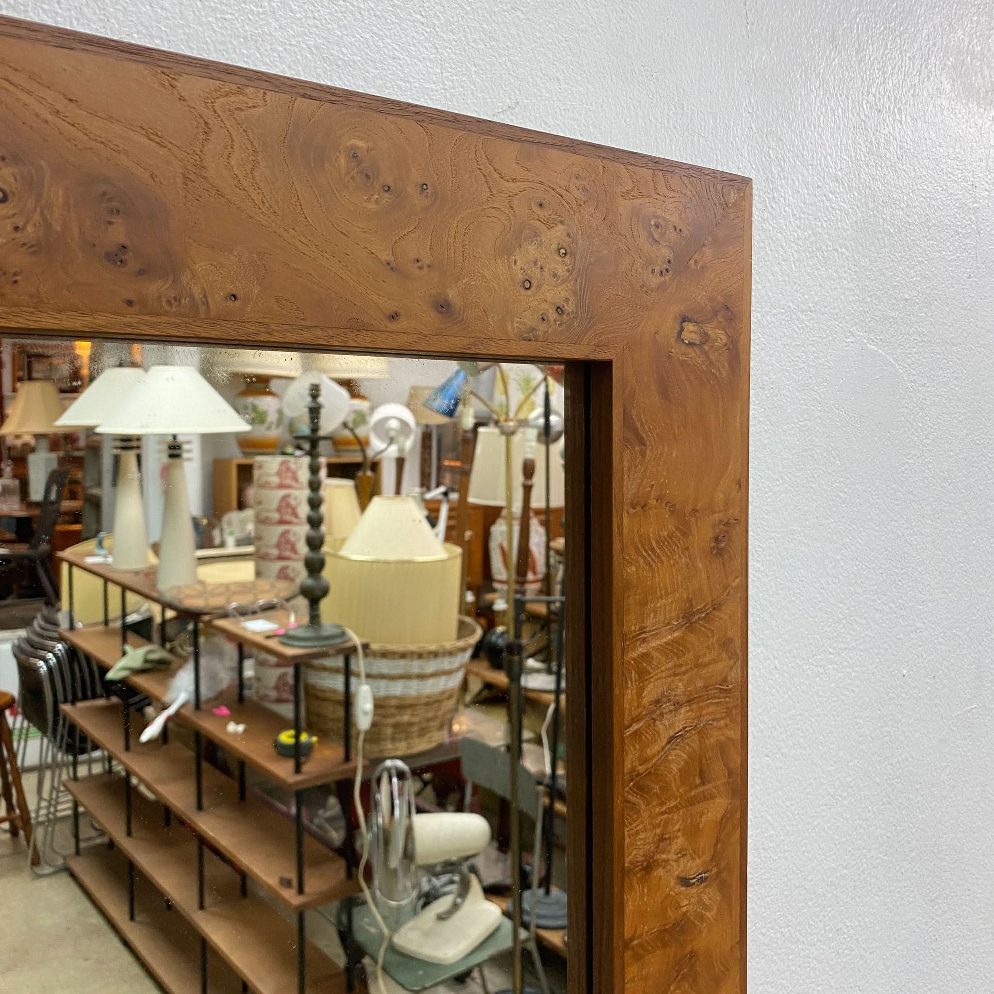 Post modern wall mirror with stunning Australian burl walnut frame, circa 1980s.  An understated yet elegant piece.  In excellent original condition.
