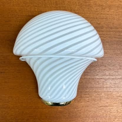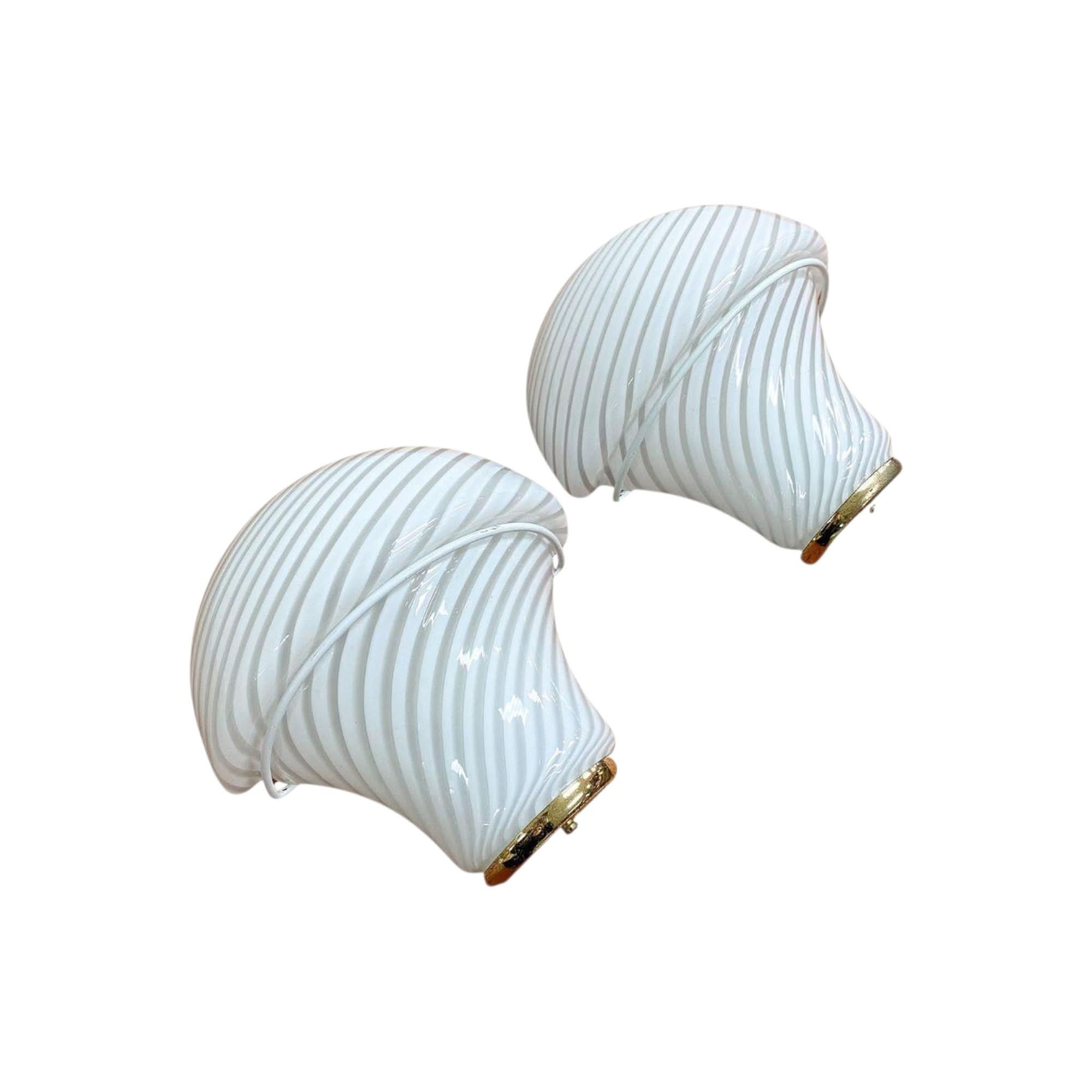 Beautiful pair of Post Modern Italian Murano wall lights/sconces. Iconic mushroom shape, in milky white Murano glass, with clear stripes and gold coloured base. In good vintage condition with some signs of use consistent with age.