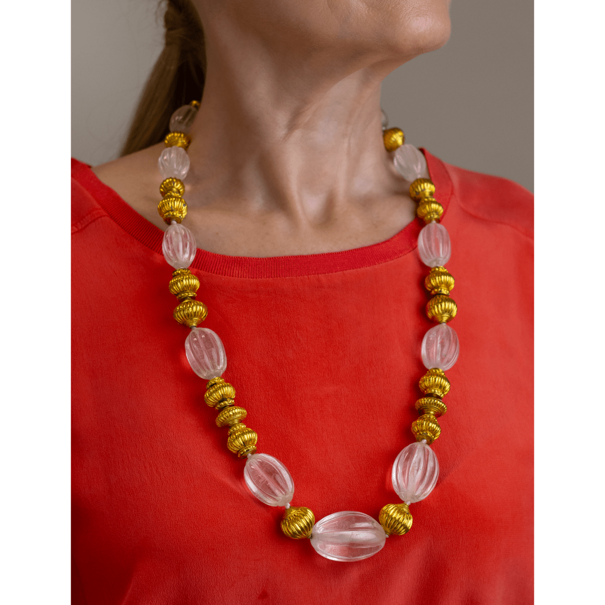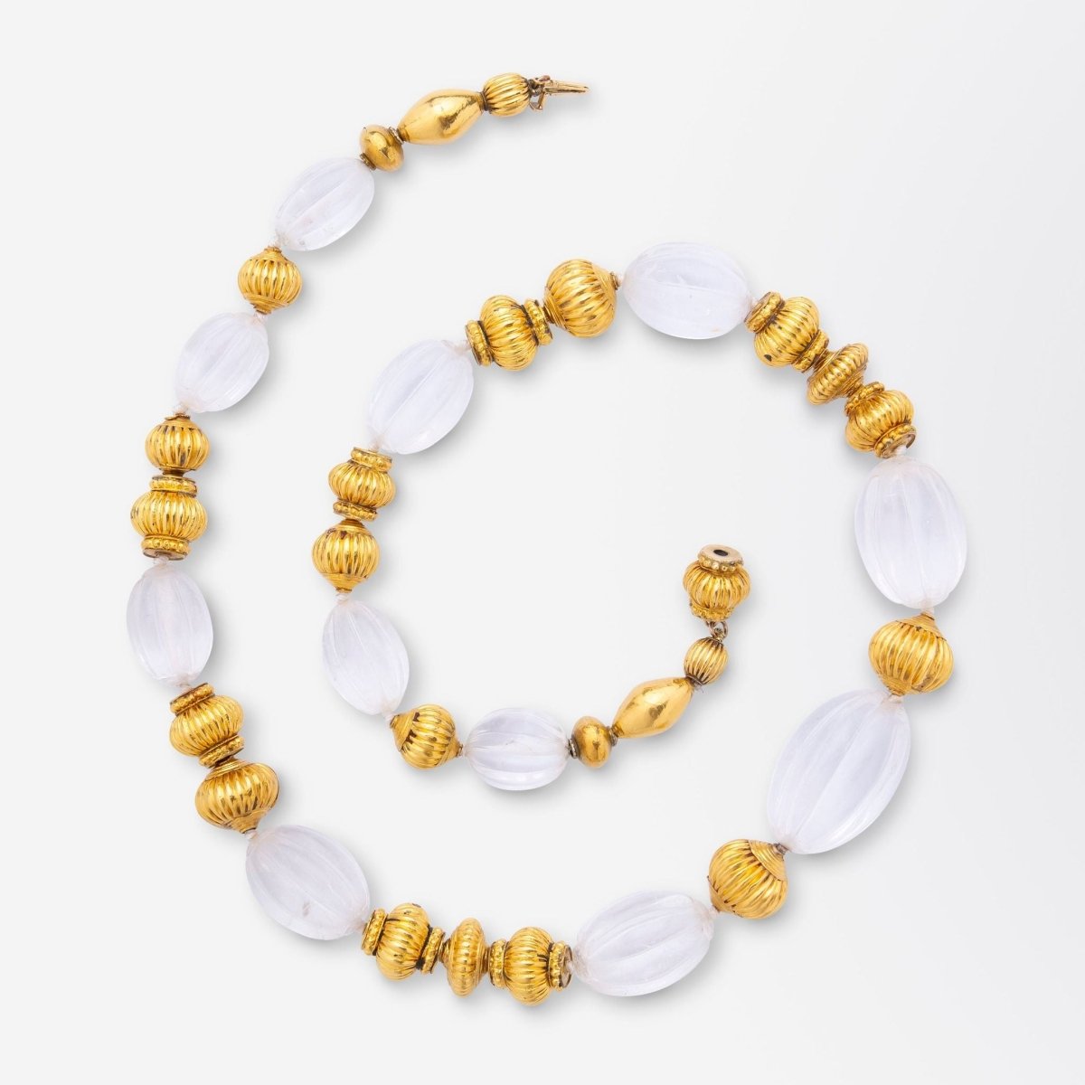 This unusual necklace has been crafted from carved rock crystal beads intercepted by wax filled gold beads, likely of antiquity. The carved rock crystal beads are sometimes referred to as 'melon' shape, and in this necklace are graduated in size centring to the largest bead at the centre front. The gold foil beads have been wax filled and alternate in shape and size and could be referred to as 'lantern' in style. It is likely the gold beads are of antiquity and are very likely Eastern in origin, however it is impossible to be certain. The necklace terminates with a tongue and box clasp which has been integrated into one of the gold foil beads. A really beautiful and highly unusual necklace which is beautiful in its design and its heft when worn.