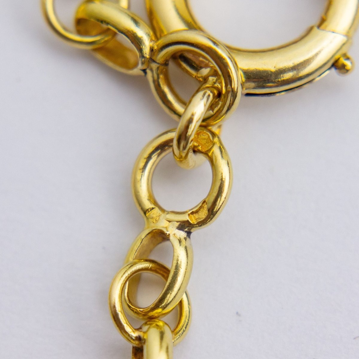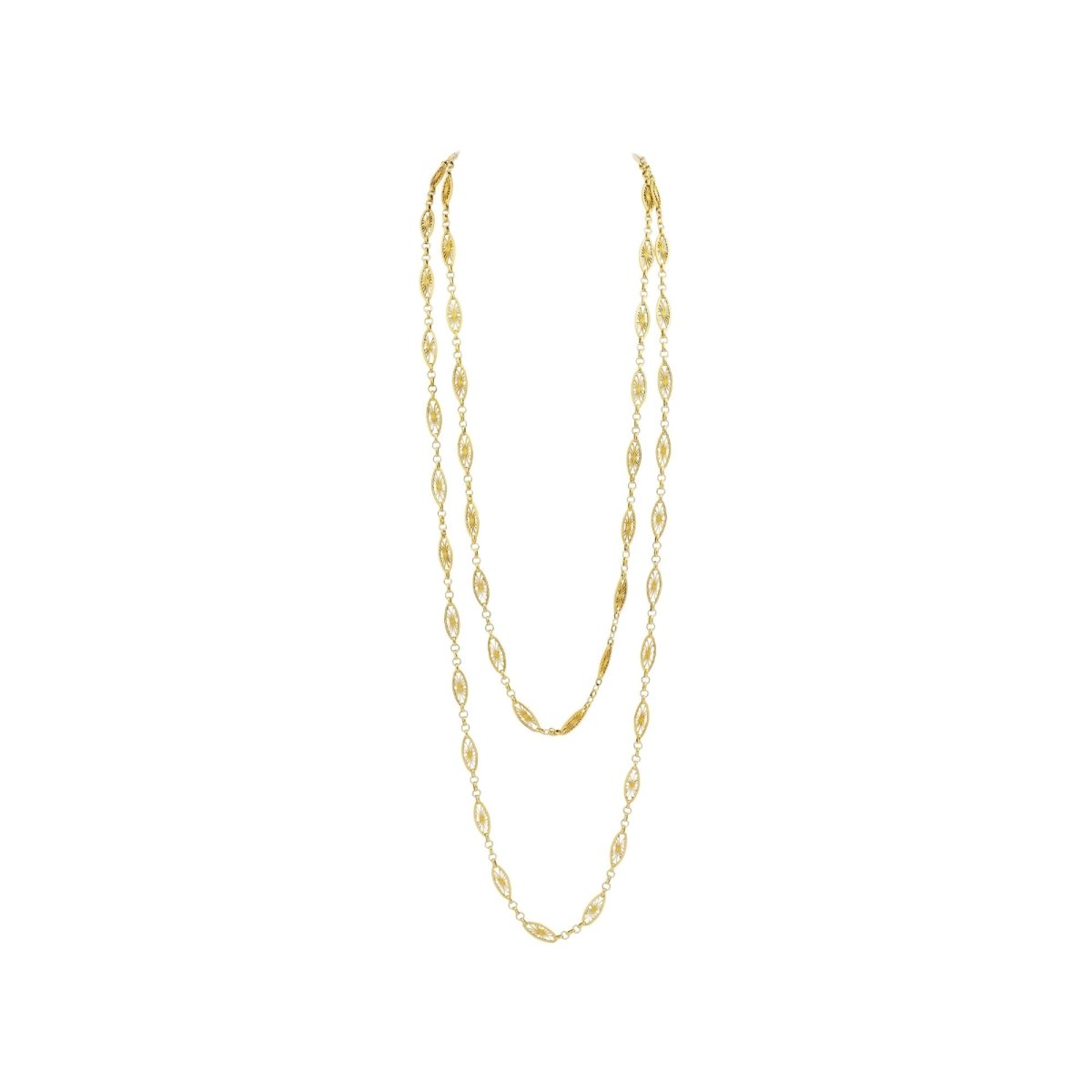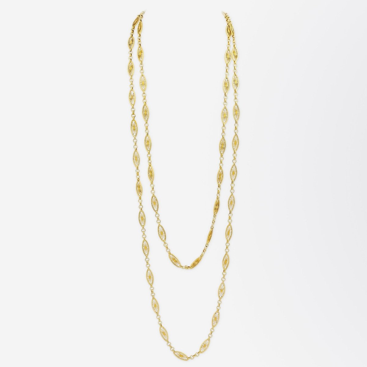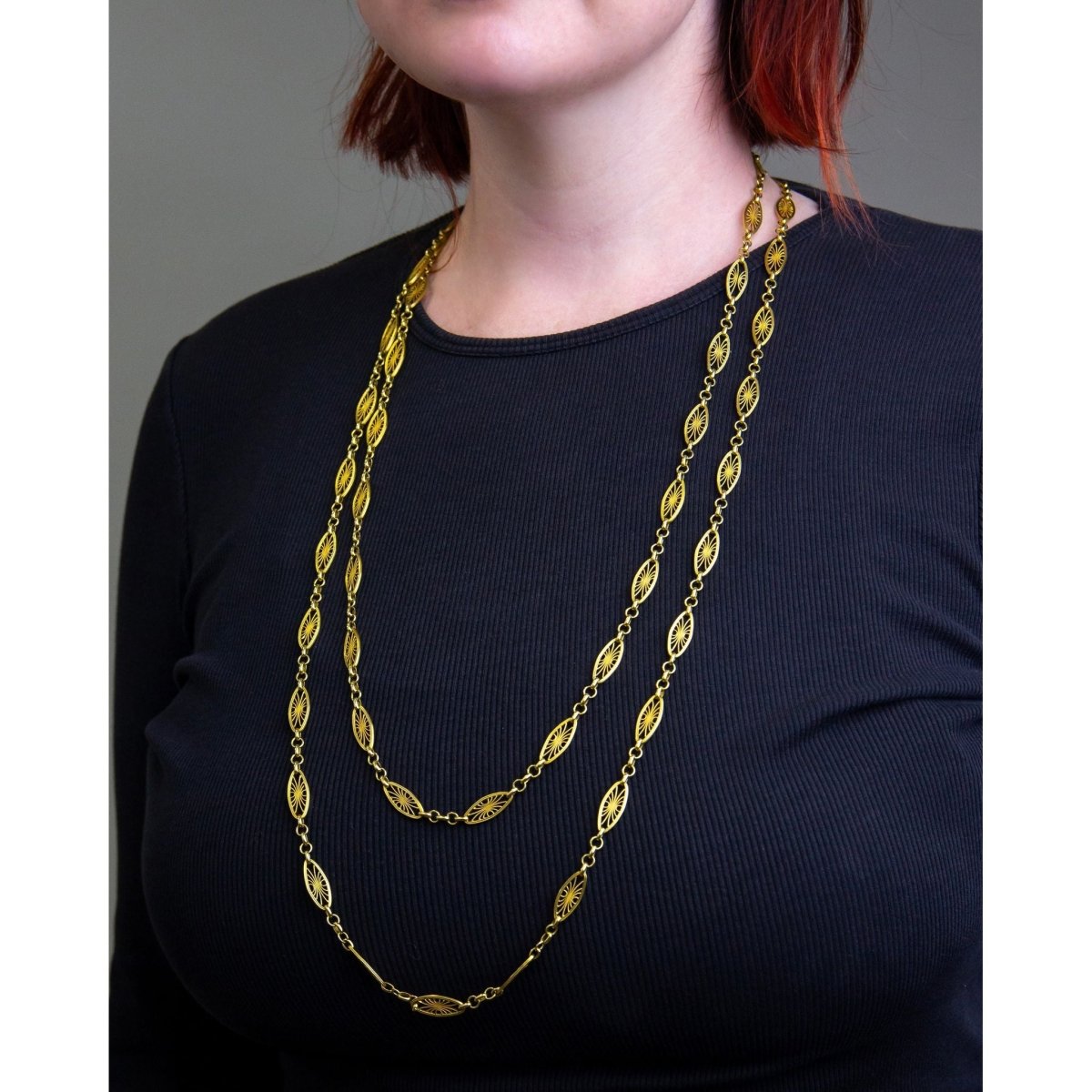 This antique guard chain is likely the nicest example we have had in our collection to date. Crafted from 18 karat gold the chain which has French gold marks would have likely been crafted in the second half of the 19th century. The fancy-link chain is of an exceedingly good length of 168 centimetres allowing it to be wrapped around the neck two or three times with ease, and of course can have pendants and enhancers attached if desired. There is one large bolt ring clasp which is working well, is secure, and allows the necklace to be worn at a set length when worn twice around the neck. The necklace features the French eagle gold purity mark indicating it is 18 karat yellow gold and manufactured in France. In exceedingly good order this necklace is an absolute essential for anyone who likes to layer gold necklaces and likes to have their money close by, in this case, around their neck!