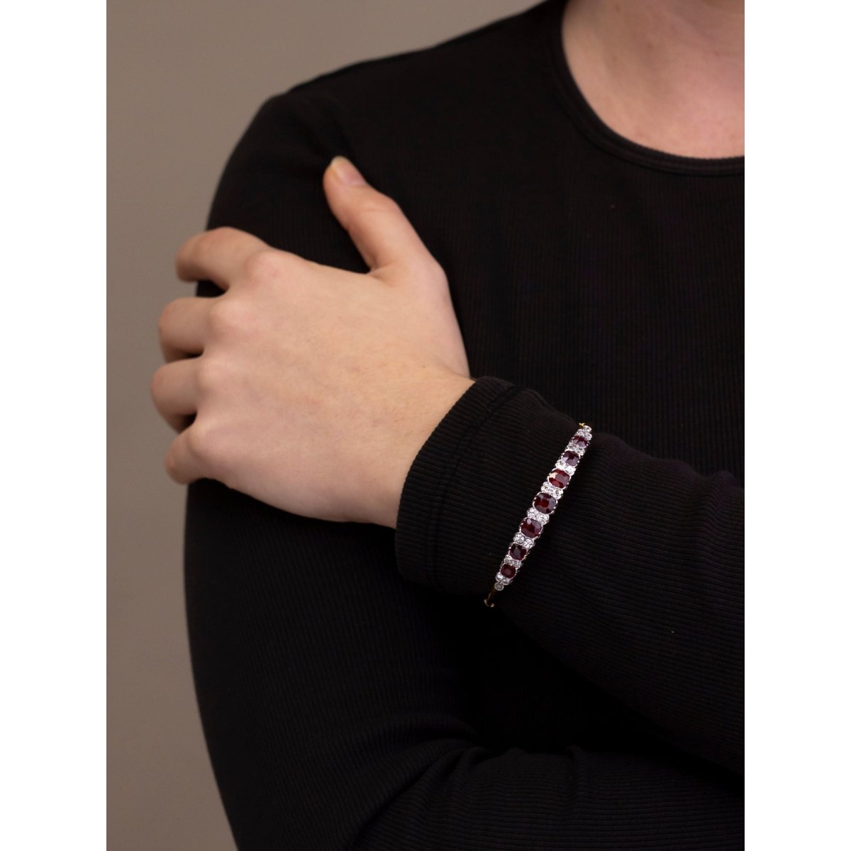 Crafted from 18 karat gold and platinum, this convertible bangle has been set with deep red garnets and diamonds. The bangle has been crafted in Sweden in the early part of the 20th century by CG Hallberg, a notable maker and jeweller to the Swedish court. The oval hinged bangle has been crafted from 18 karat yellow gold and then set to one side with a panel of garnets and diamonds. The seven deep red garnets are all cushion cut and are accented by 18 old mine cut and rose cut diamonds. Each of these diamonds are estimated to be between G and I colour and SI to P1 in clarity totalling approximately 1.38 carat. This panel of garnets and rubies have been set in a platinum mount which is detachable from the bangle with a screw mechanism to the rear. The purpose of this detaching is likely to allow the garnet and ruby panel to be connected to a hair pin/clip, which has unfortunately been lost to time. The hinged bangle has a tongue and box clasp with an attached safety chain and is working well and is secure. The inside of the bangle is stamped with crisp Swedish hallmarks allowing us to date the manufacture of the piece to circa 1911. In remarkably good order the bangle is a really gorgeous piece of antique armwear by an esteemed maker.