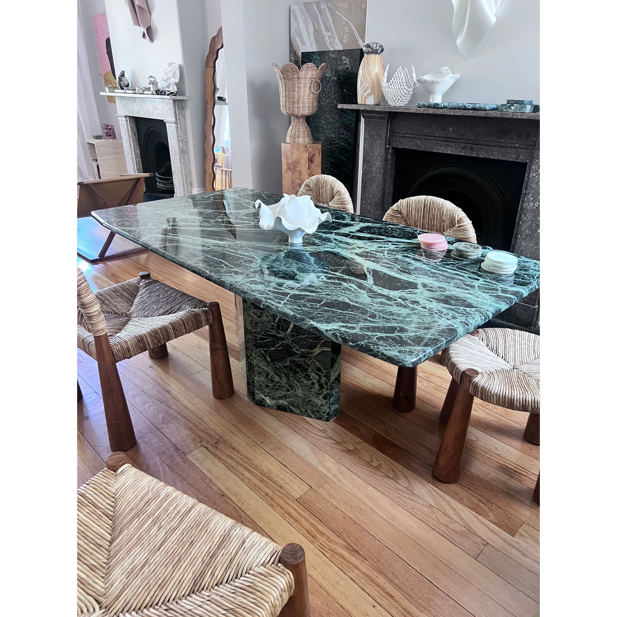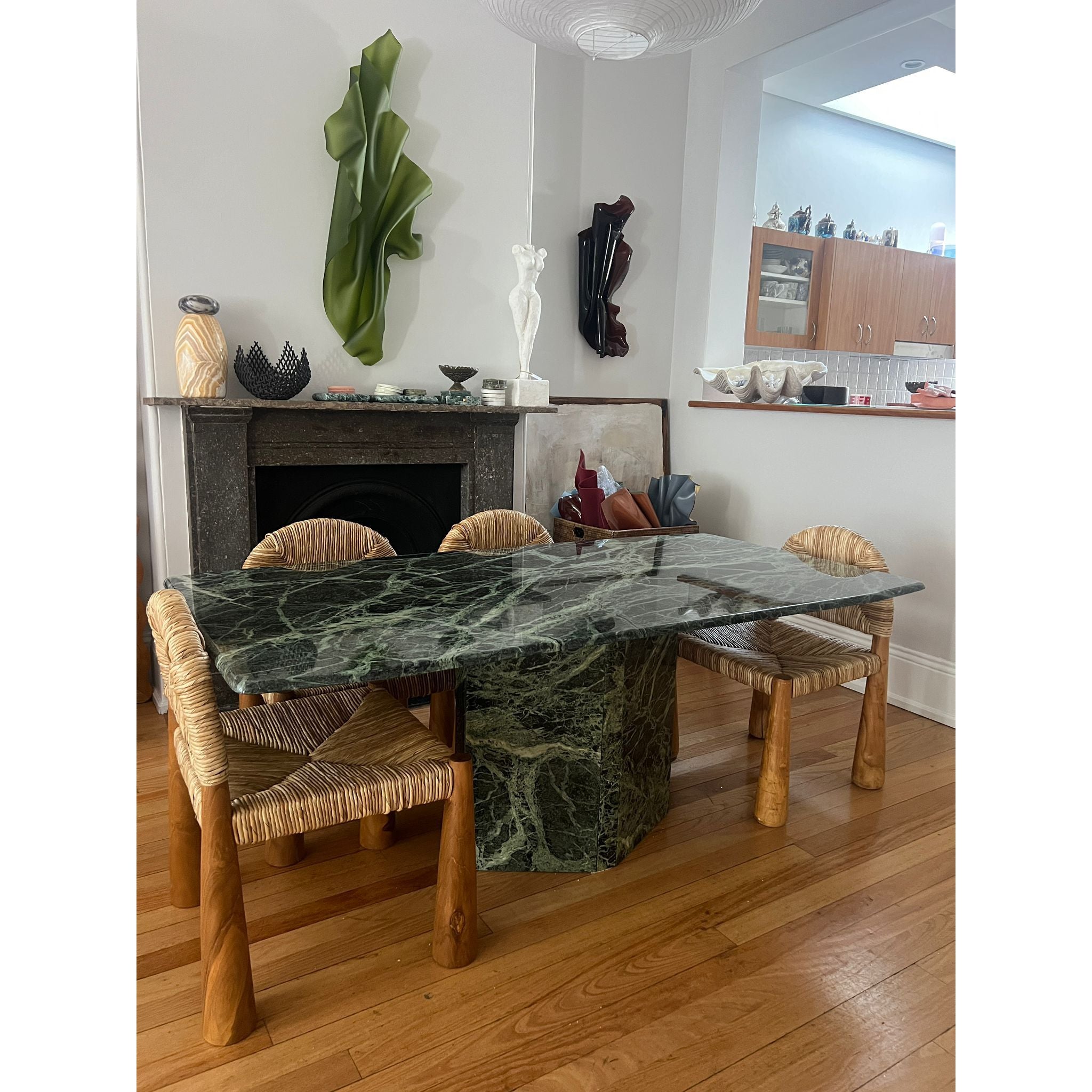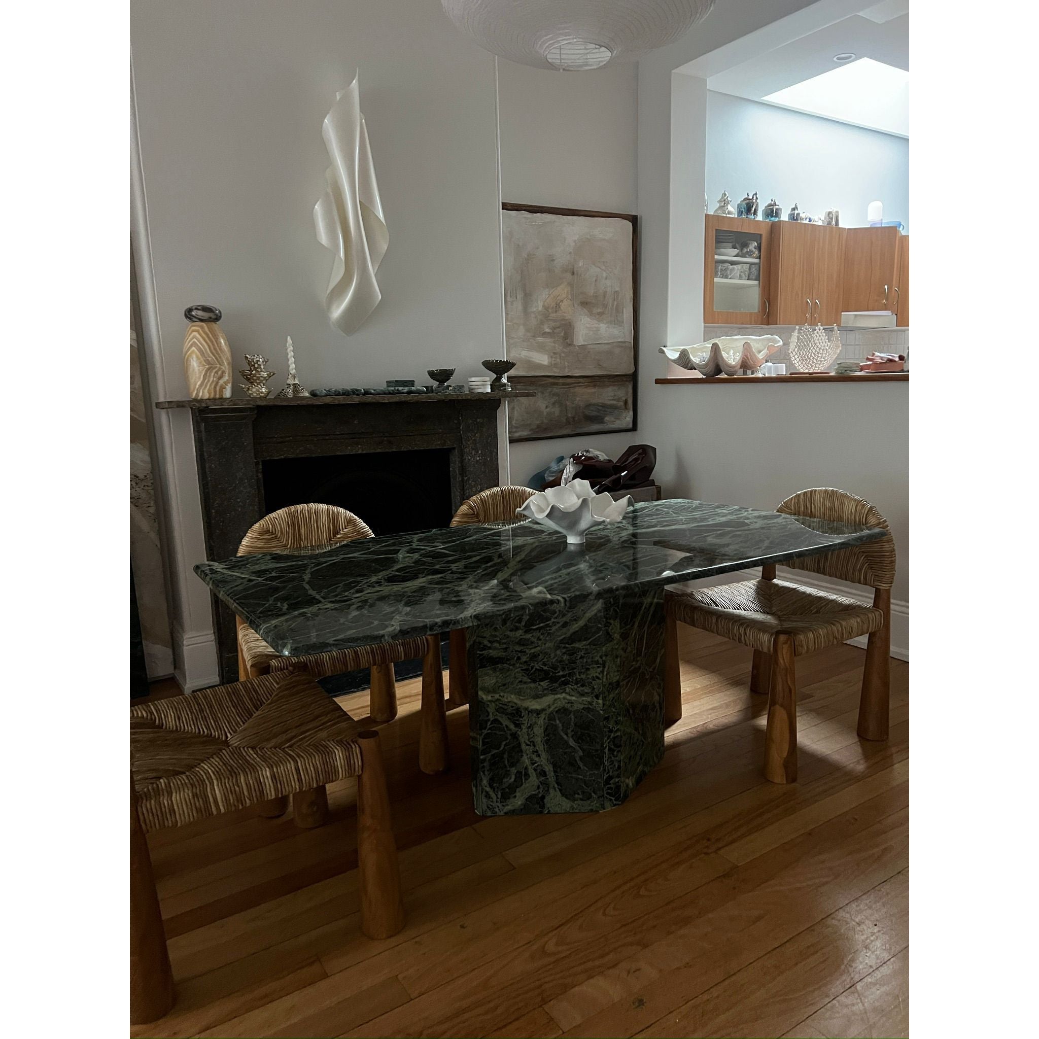 A statement vintage Italian dining table carved from green verde marble with expressive veining, grounded by a bold sculptural pedestal.