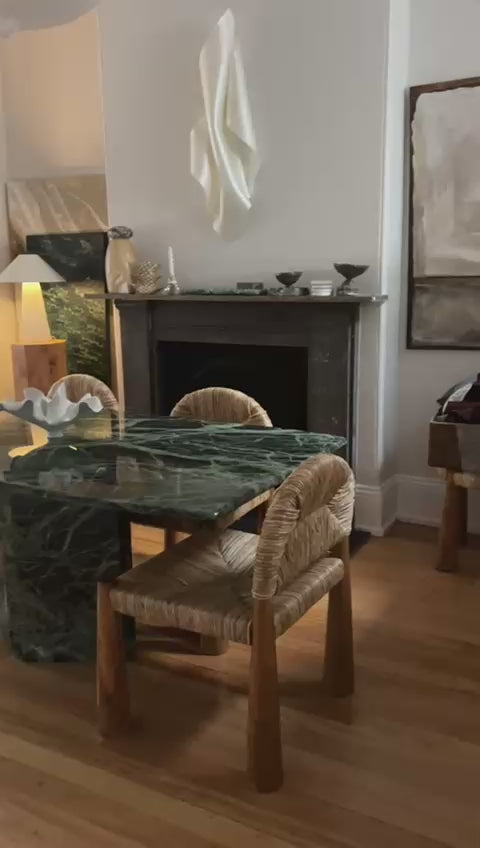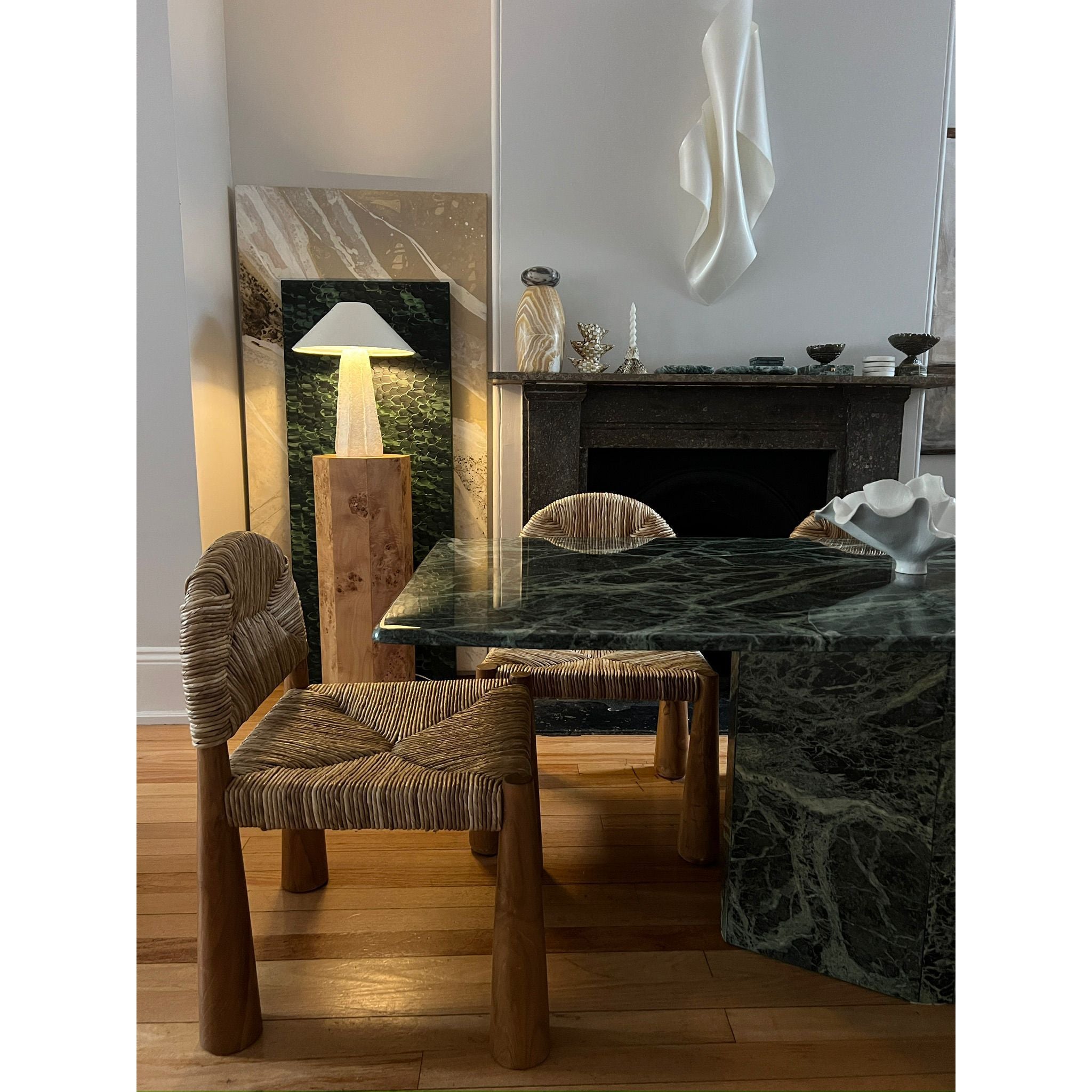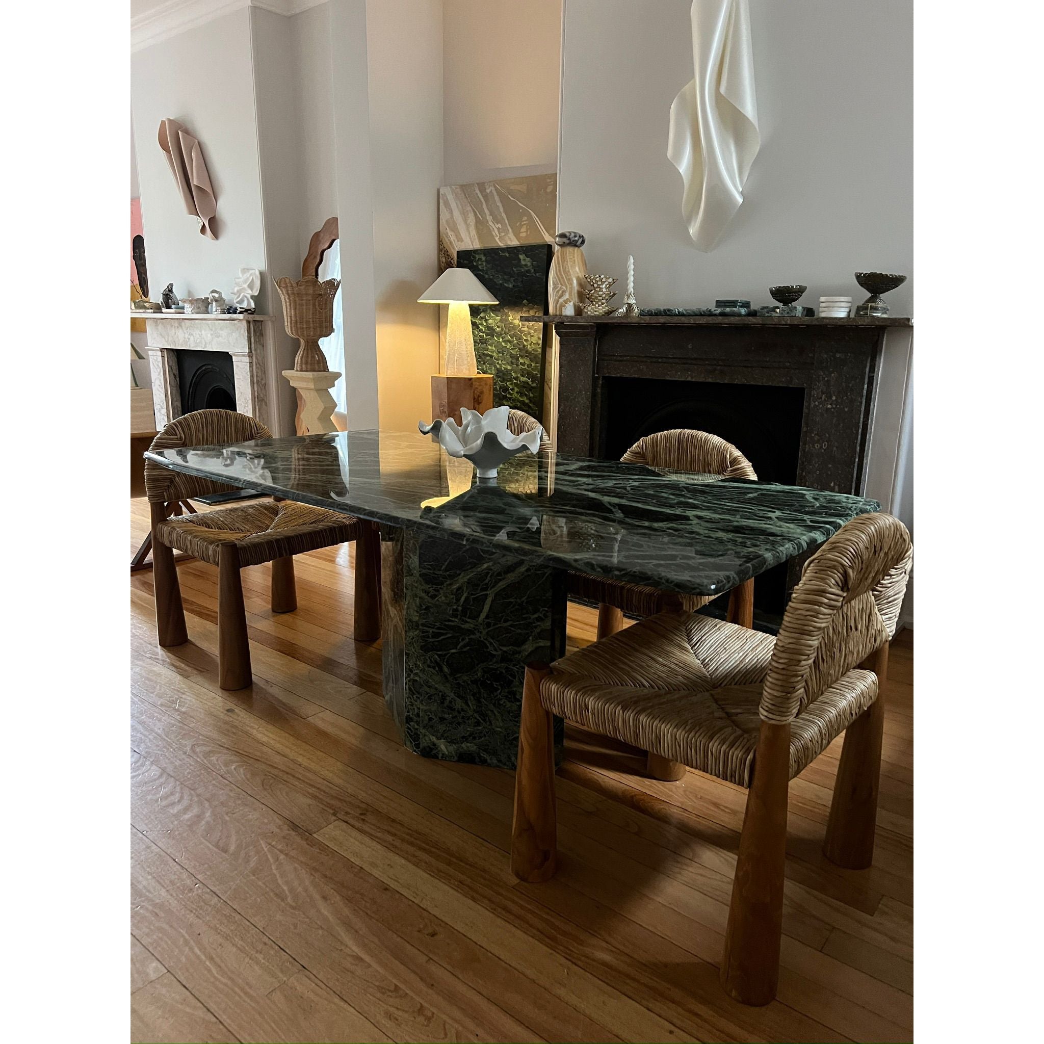 A statement vintage Italian dining table carved from green verde marble with expressive veining, grounded by a bold sculptural pedestal.