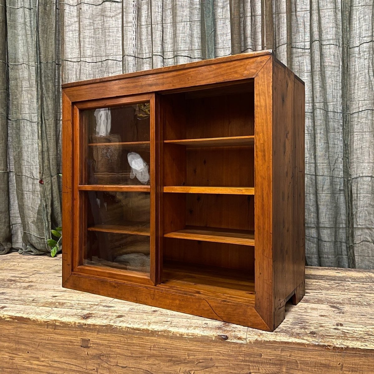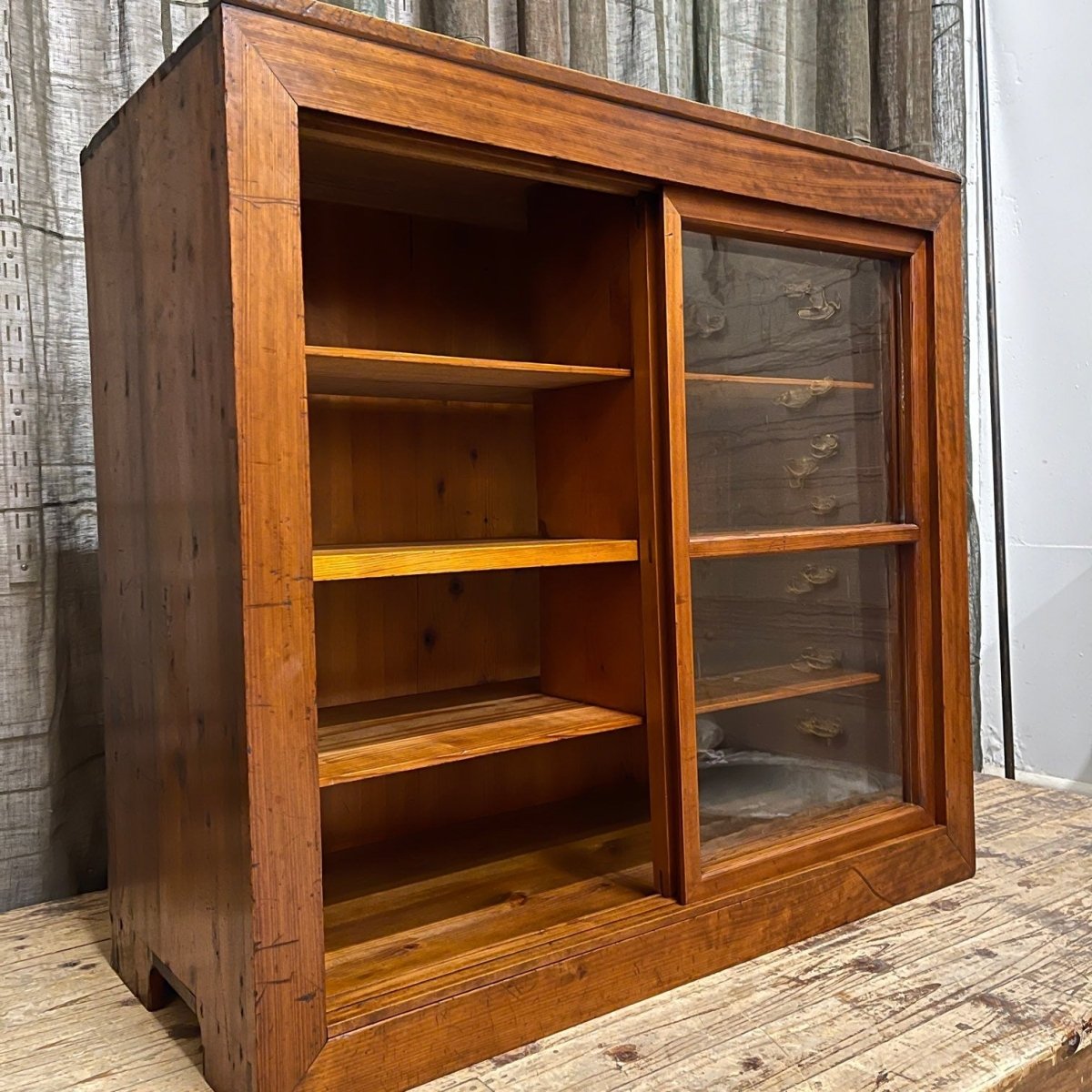 An antique Japanese display cabinet with glass sliding doors. Made from sugi (cedar) wood.