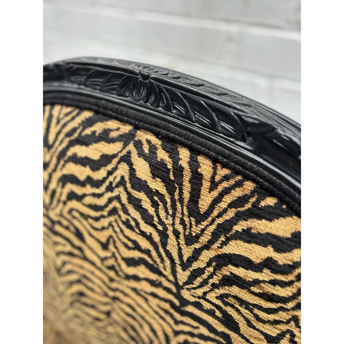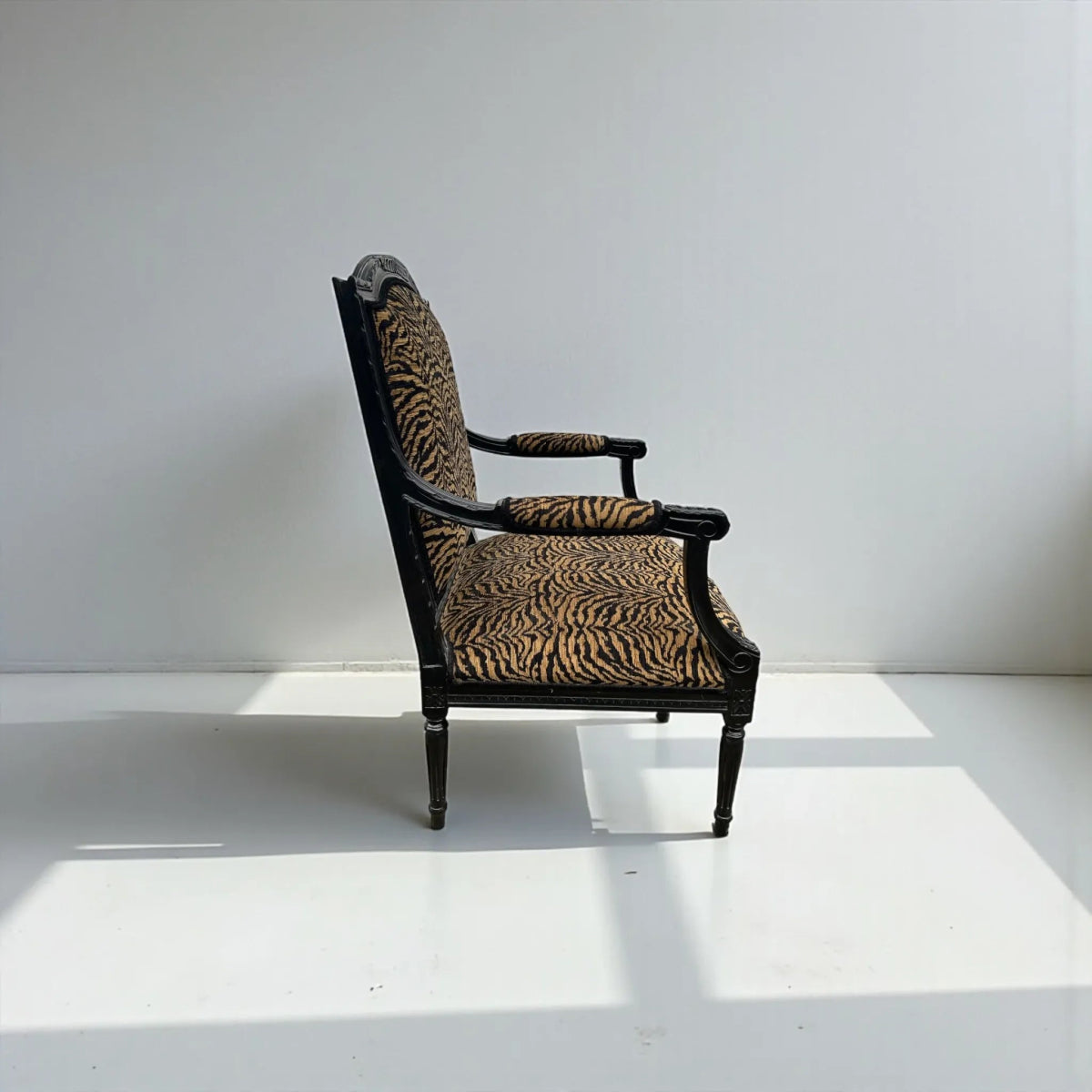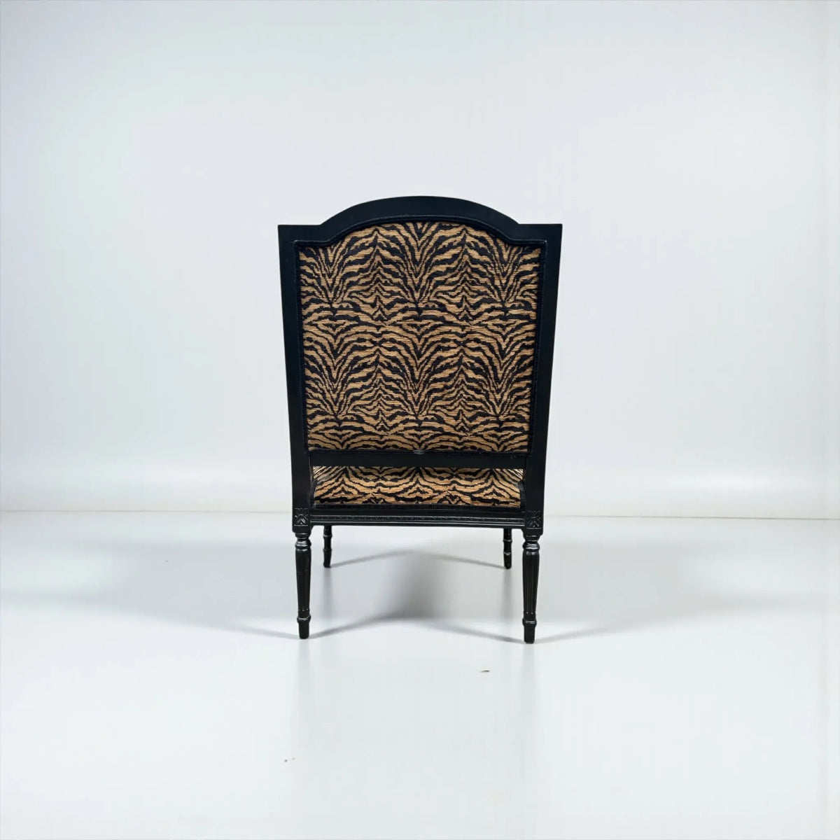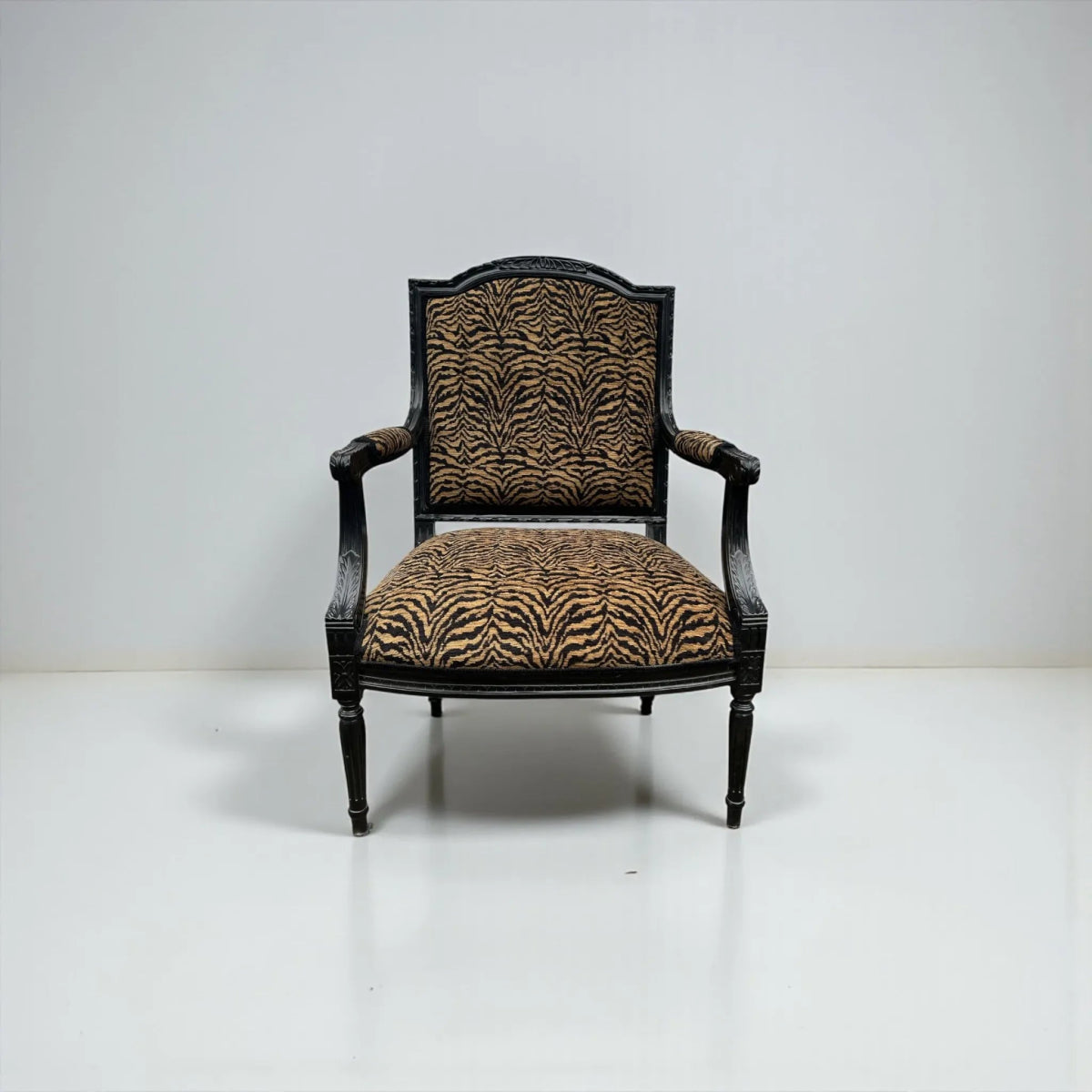 A timeless classic with a bold twist. This LXVI-style armchair features a beautifully carved timber frame in a deep black finish, paired with a striking tiger-patterned upholstery that brings personality and drama to its traditional silhouette. The combination of elegant lines, fluted legs, and intricate detailing makes it a standout accent piece for any interior.