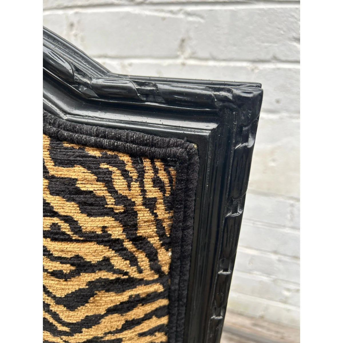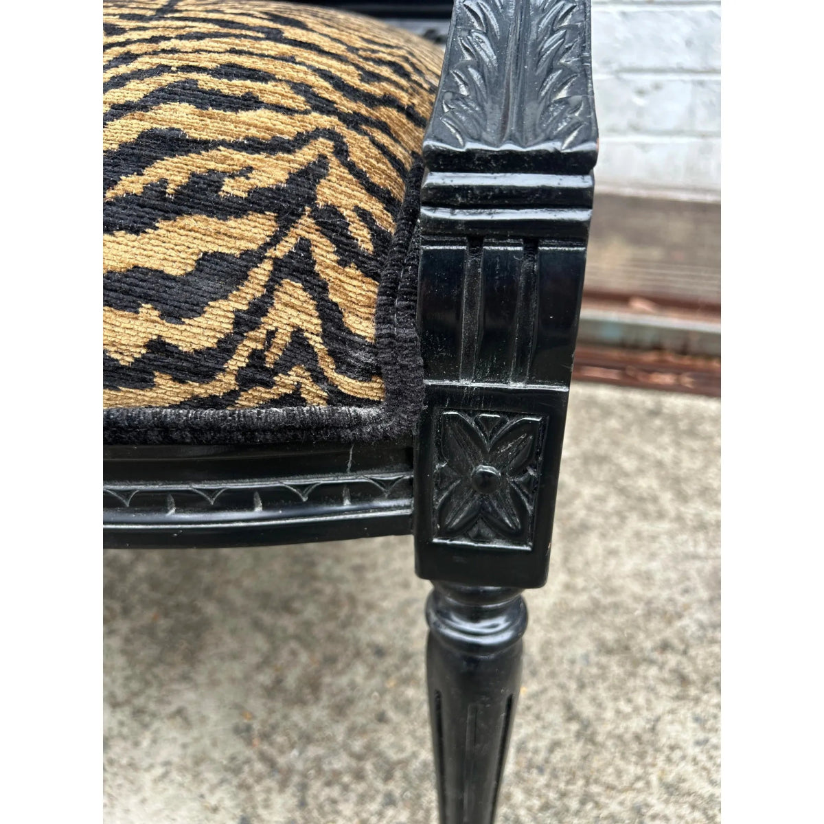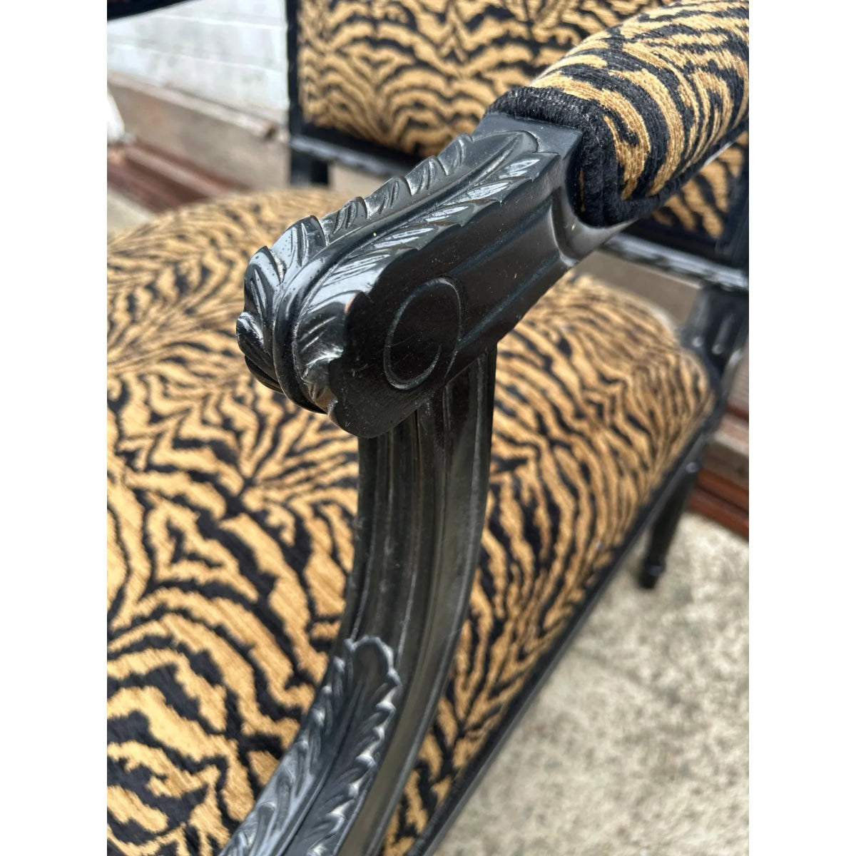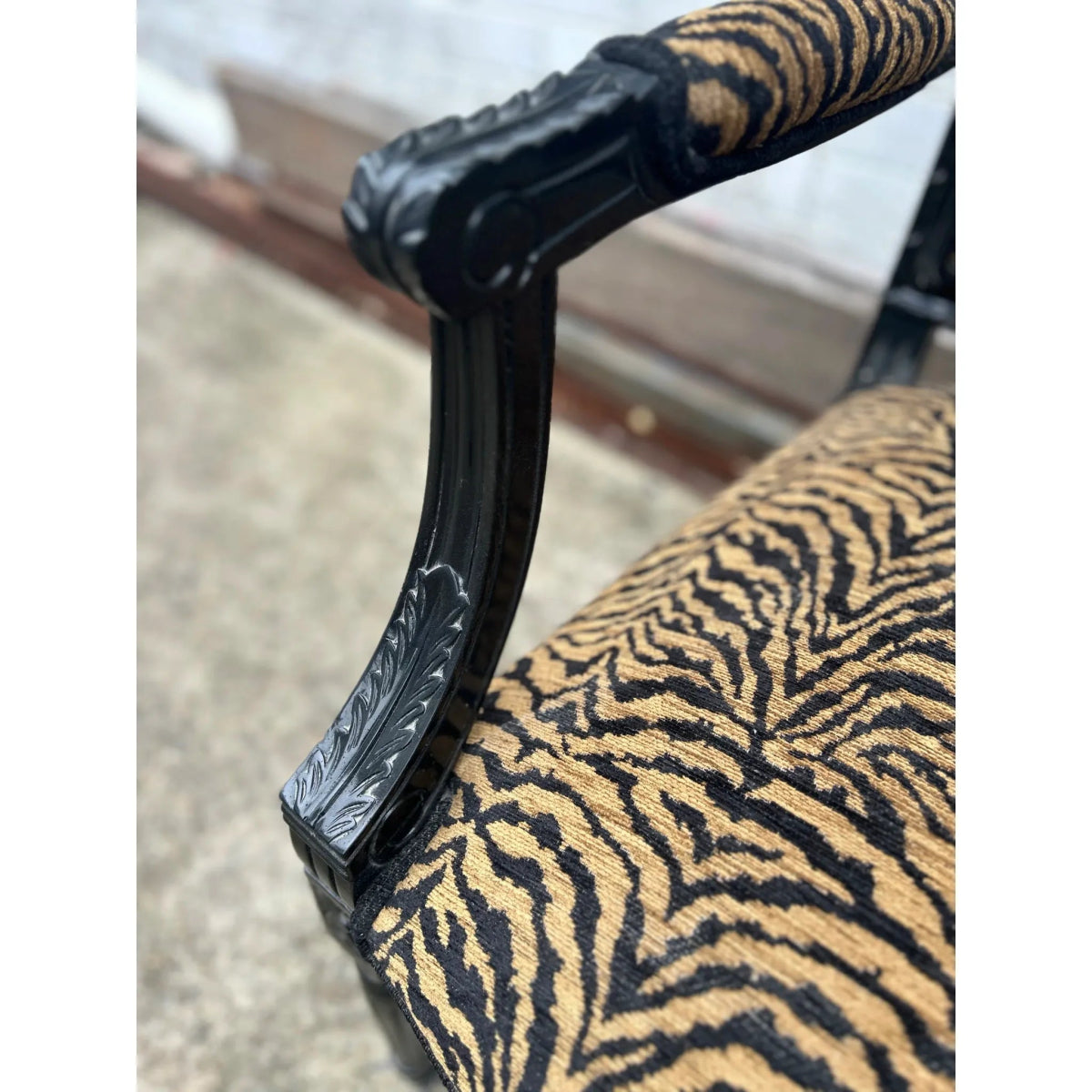 A timeless classic with a bold twist. This LXVI-style armchair features a beautifully carved timber frame in a deep black finish, paired with a striking tiger-patterned upholstery that brings personality and drama to its traditional silhouette. The combination of elegant lines, fluted legs, and intricate detailing makes it a standout accent piece for any interior.