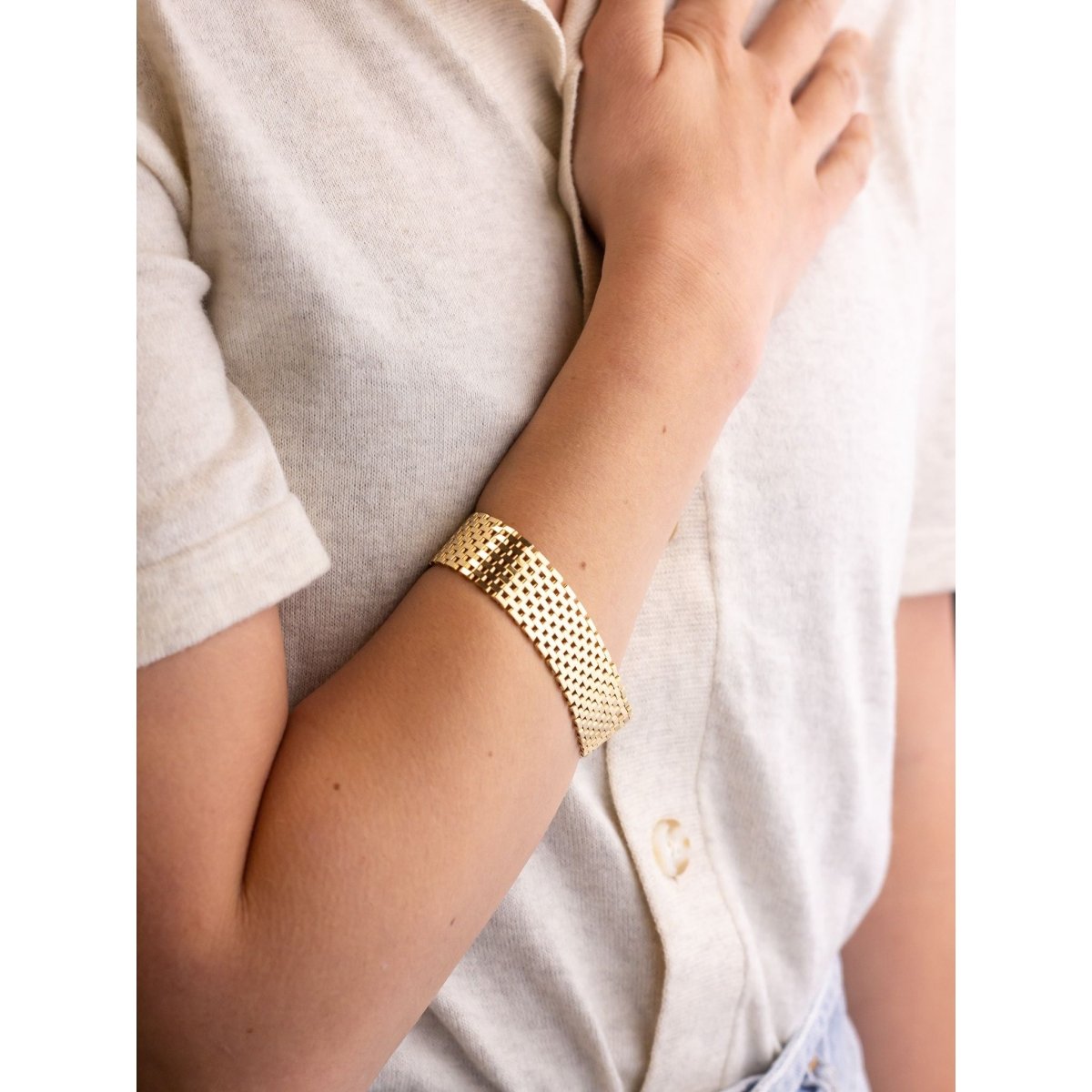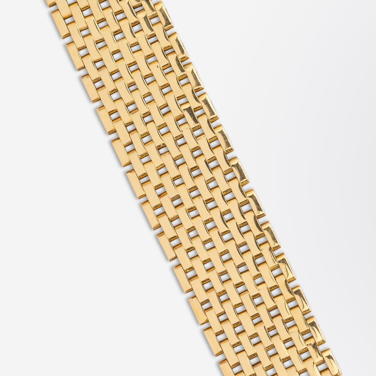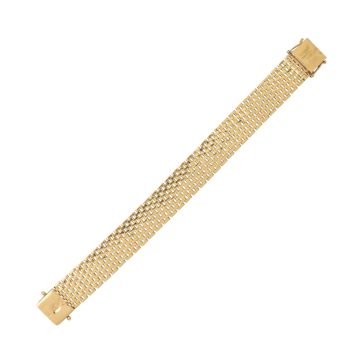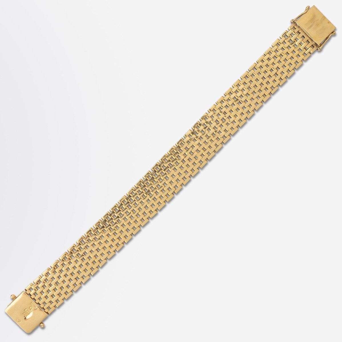 This gate link bracelet was made in the mid 20th Century out of 18 karat yellow gold. The hefty bracelet was crafted in 1971 per the date mark on its clasp and bears a gold hallmark for Sweden. The bracelet is in the 'gate link' style which has been popular since the turn of the 20th Century. The piece features a snug fitting tongue and box clasp which is integrated into the design of the piece and as such is non intrusive to the overall look. To each side of the clasp are a figure of eight safety catch for added security for the wearer. This bracelet is sure to be a regular favourite which could be worn daily with ease and lends itself to stacking extremely well.