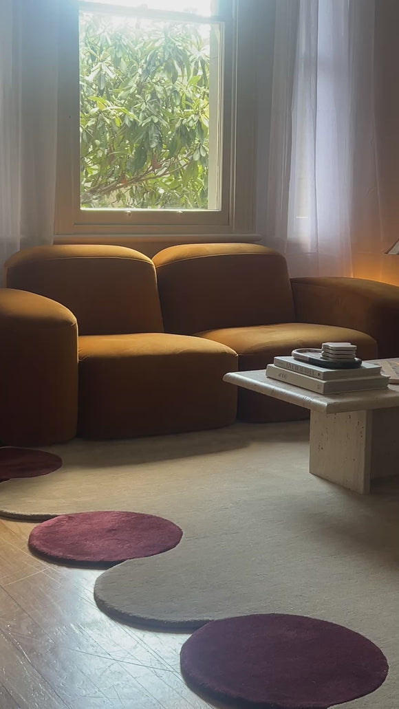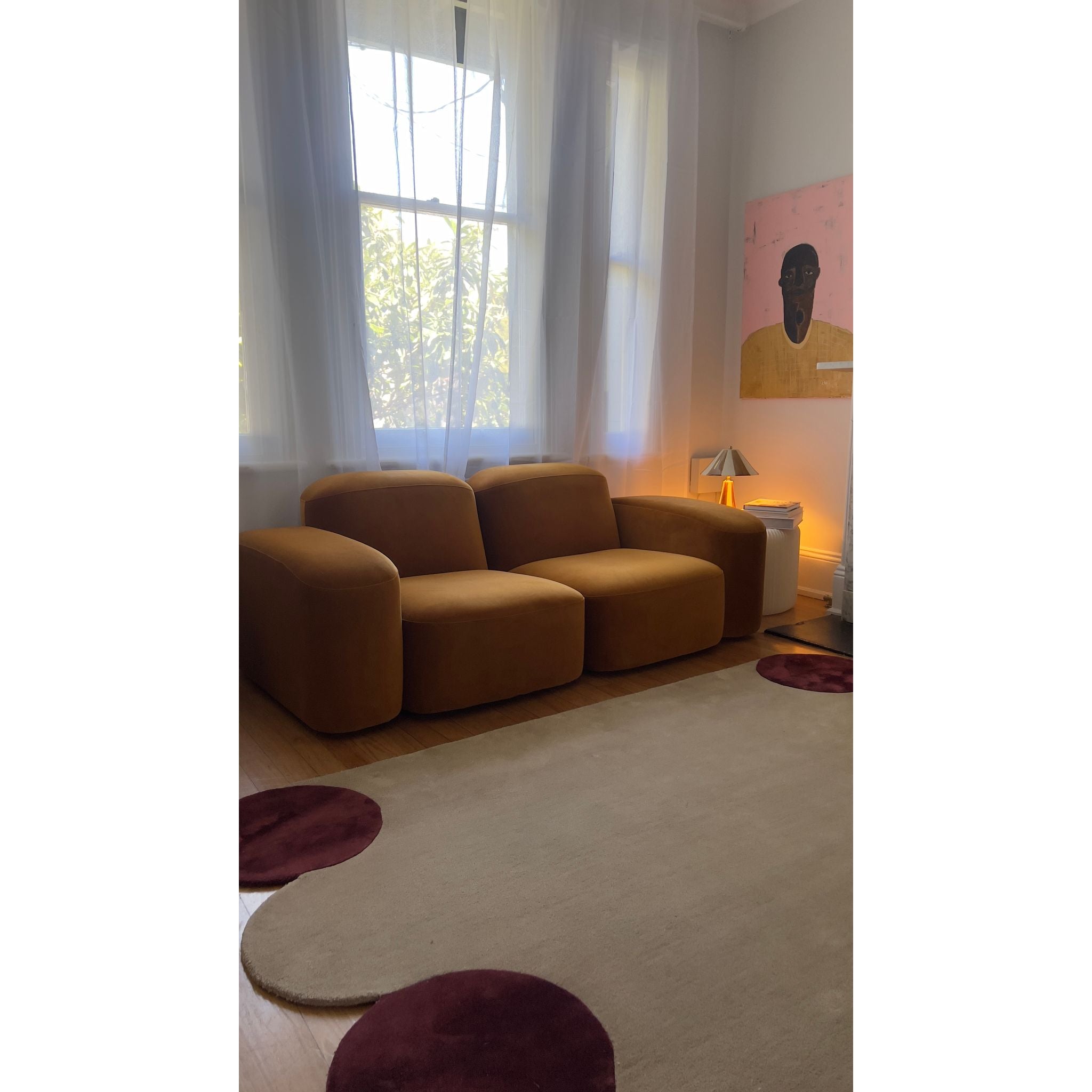 Substantial rounded proportions with a focus on comfort Muse is inspired by vintage designs from the 1970s. With its curvy modular form, Muse is a dynamic showstopper that will be the dramatic hero of any room. With a RRP of $3400, this velvet hazel coloured sofa is offered at a fraction of the price. In perfect condition except for a small mark on the bottom of the back of the sofa, not visible at all as it faces the wall.