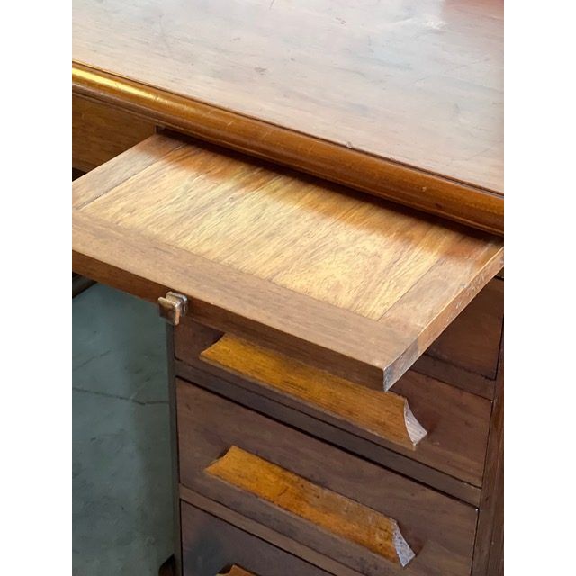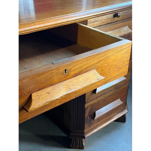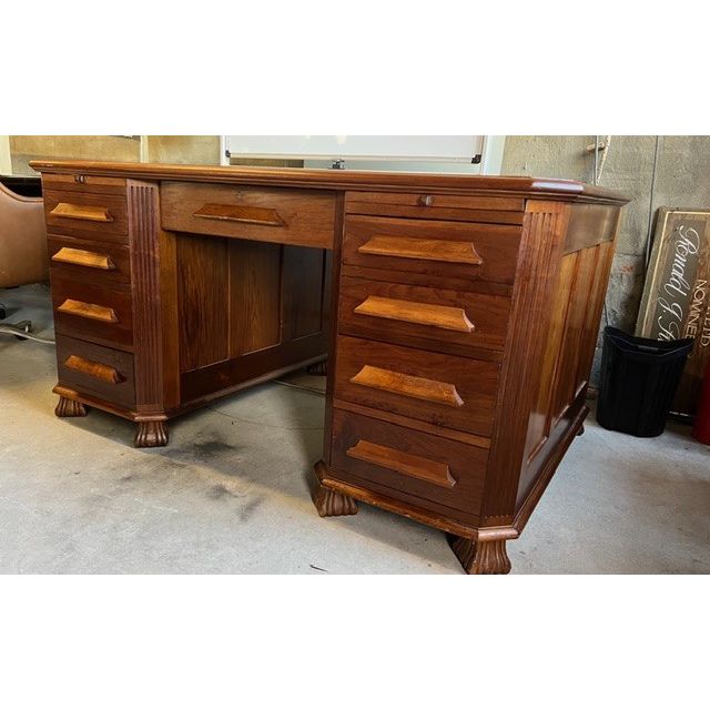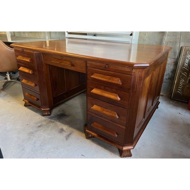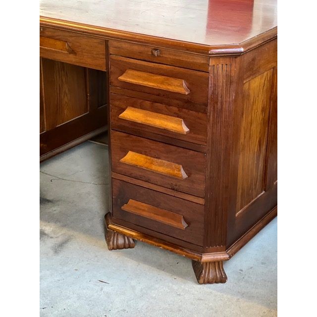 The sculptural carved feet and original timber drawer pulls add to its charm and character, while the desk’s warm patina has developed naturally over decades, revealing the dense, lustrous quality of the wood. A substantial and stately piece, ideal as a centrepiece in a home office, study, or collector’s interior.