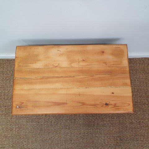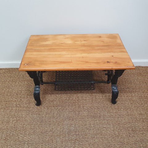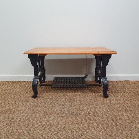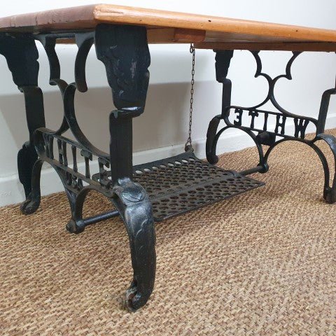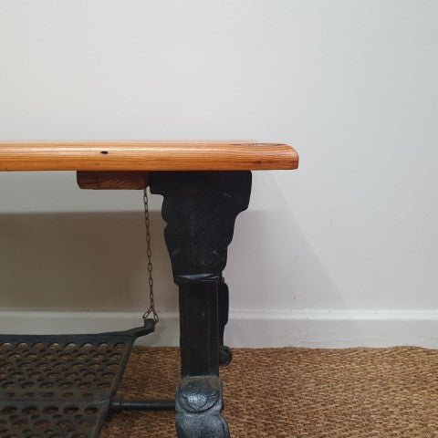 This vintage coffee table combines a cast iron base with a solid timber top, creating a striking mix of materials. Its industrial-inspired design and natural finish make it a versatile piece for living areas or lounge spaces.