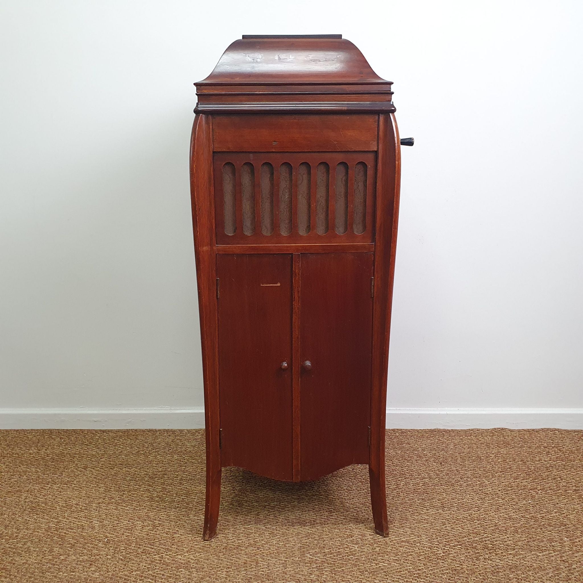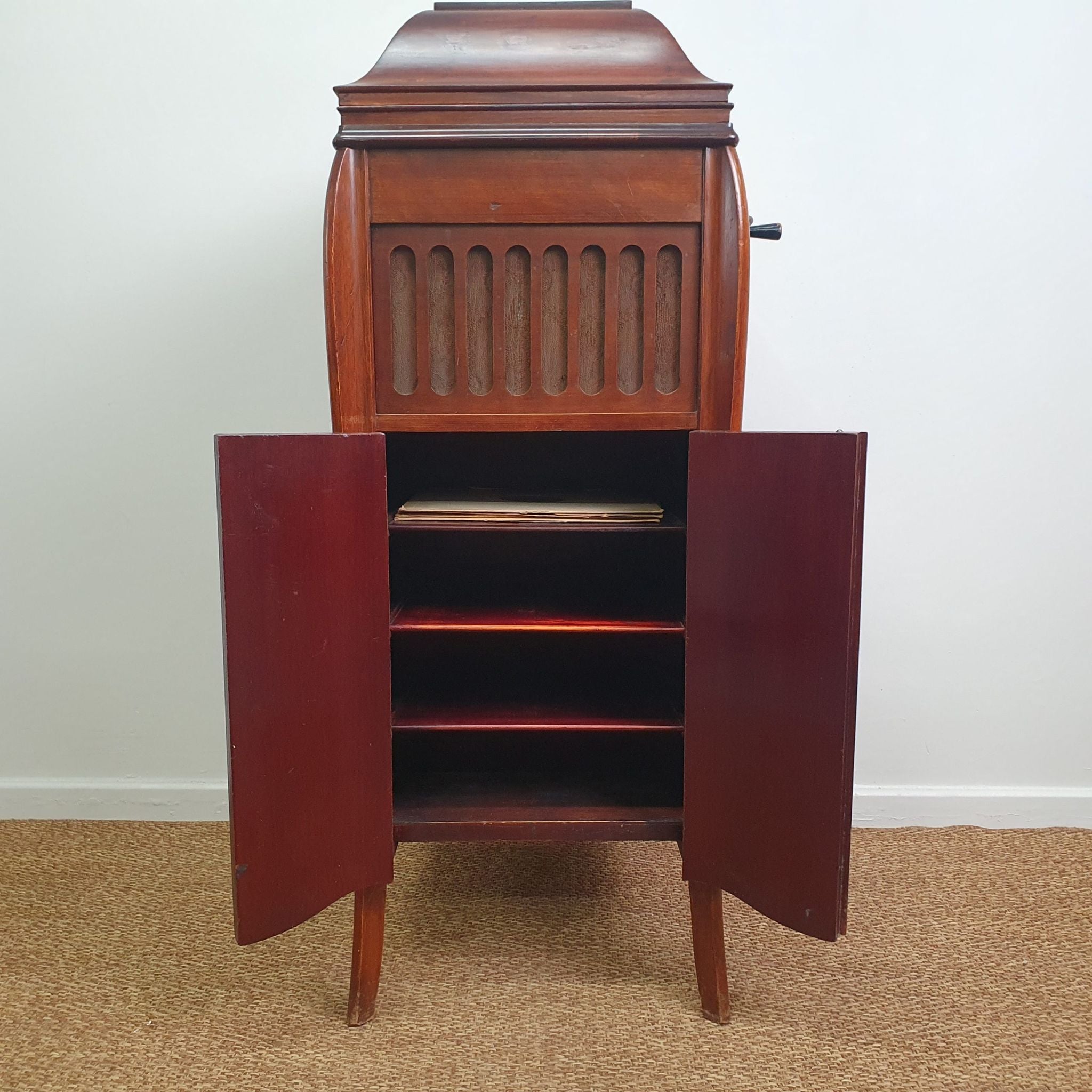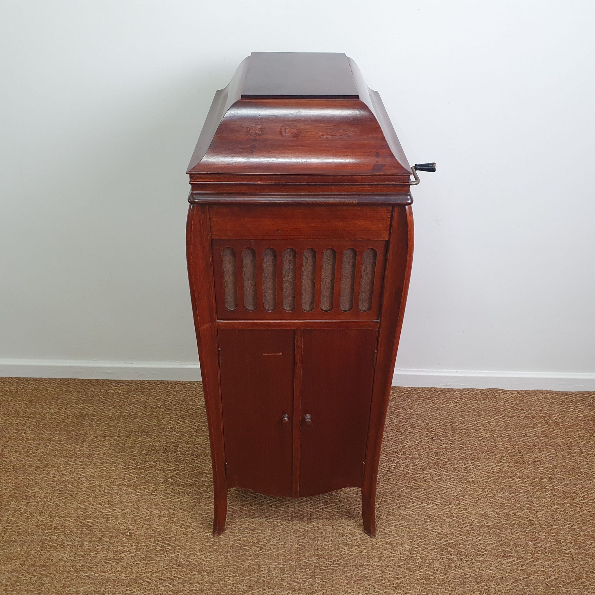 The cabinet’s elegant design includes intricate woodwork and a warm timber finish, characteristic of the period. Standing 107cm high (145cm when open), it serves as both a functional music player and a decorative piece.