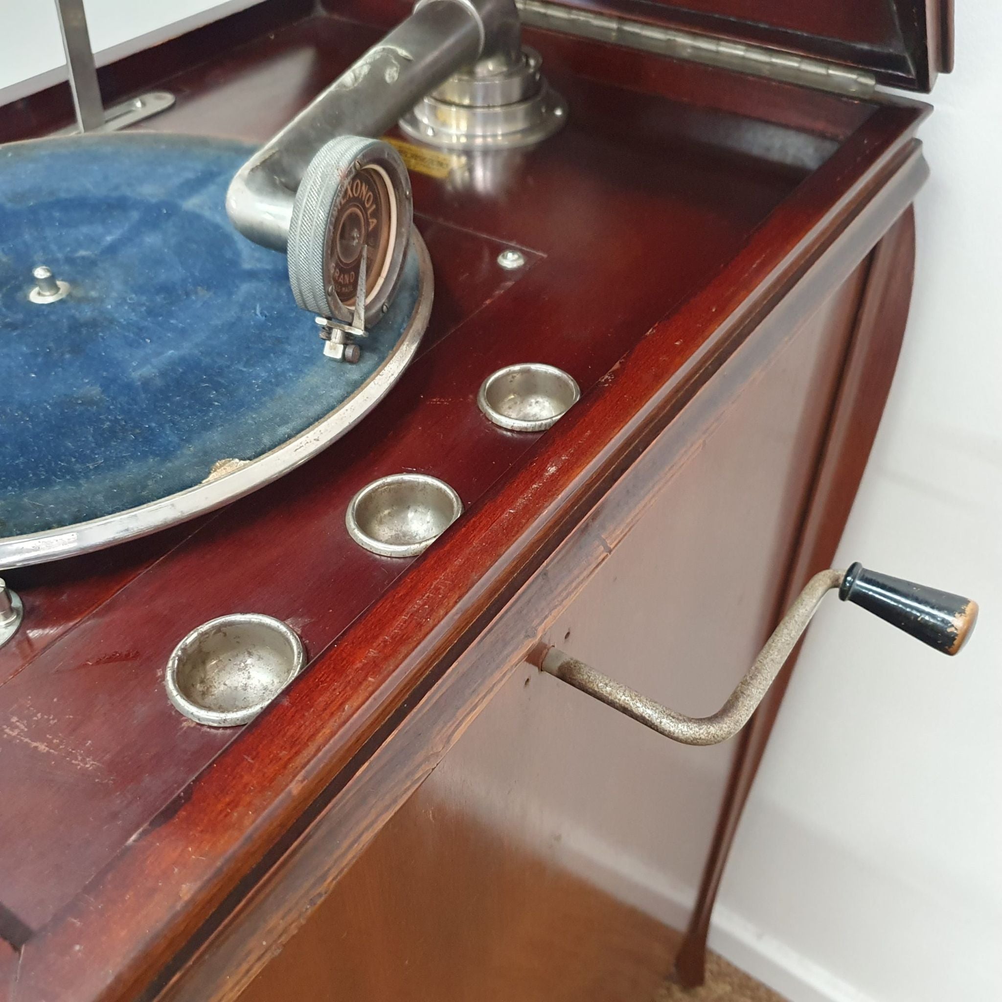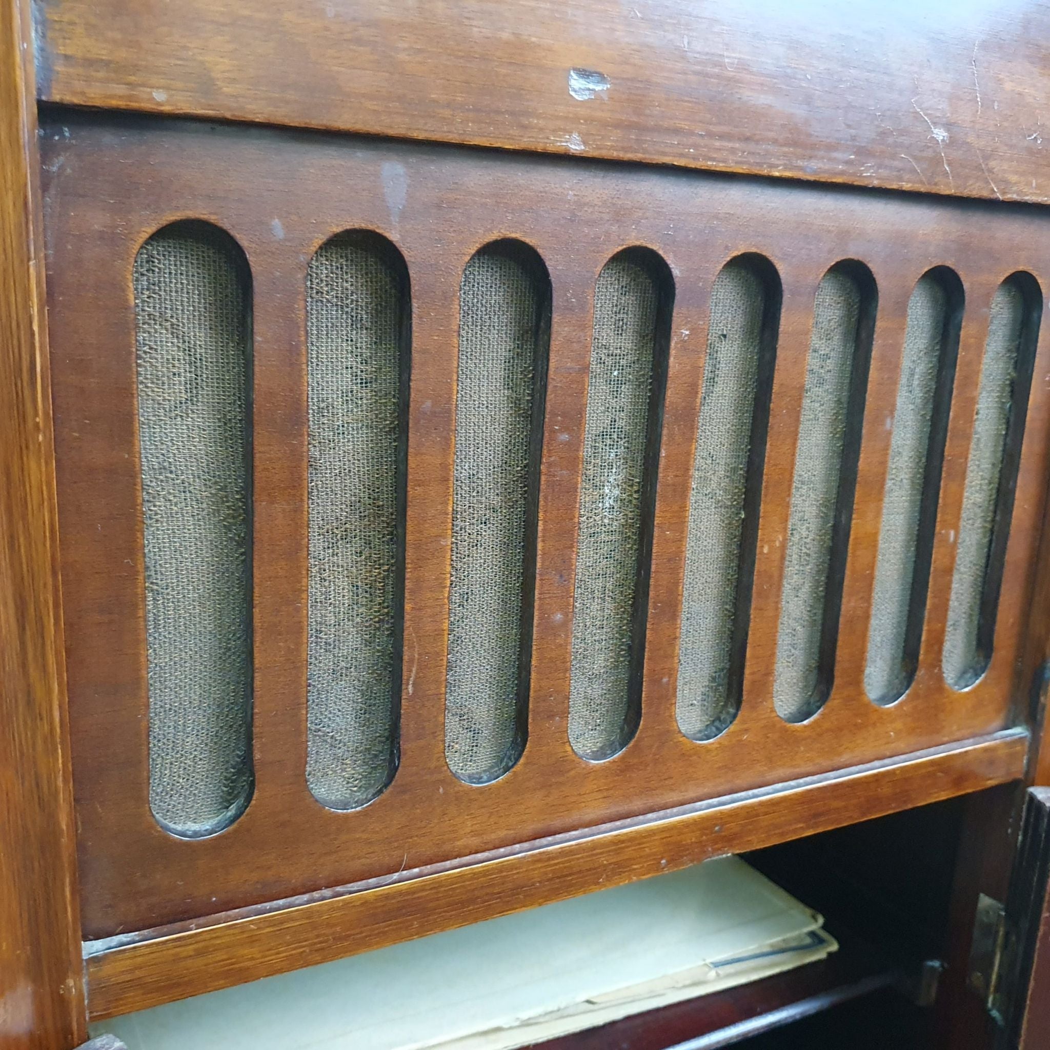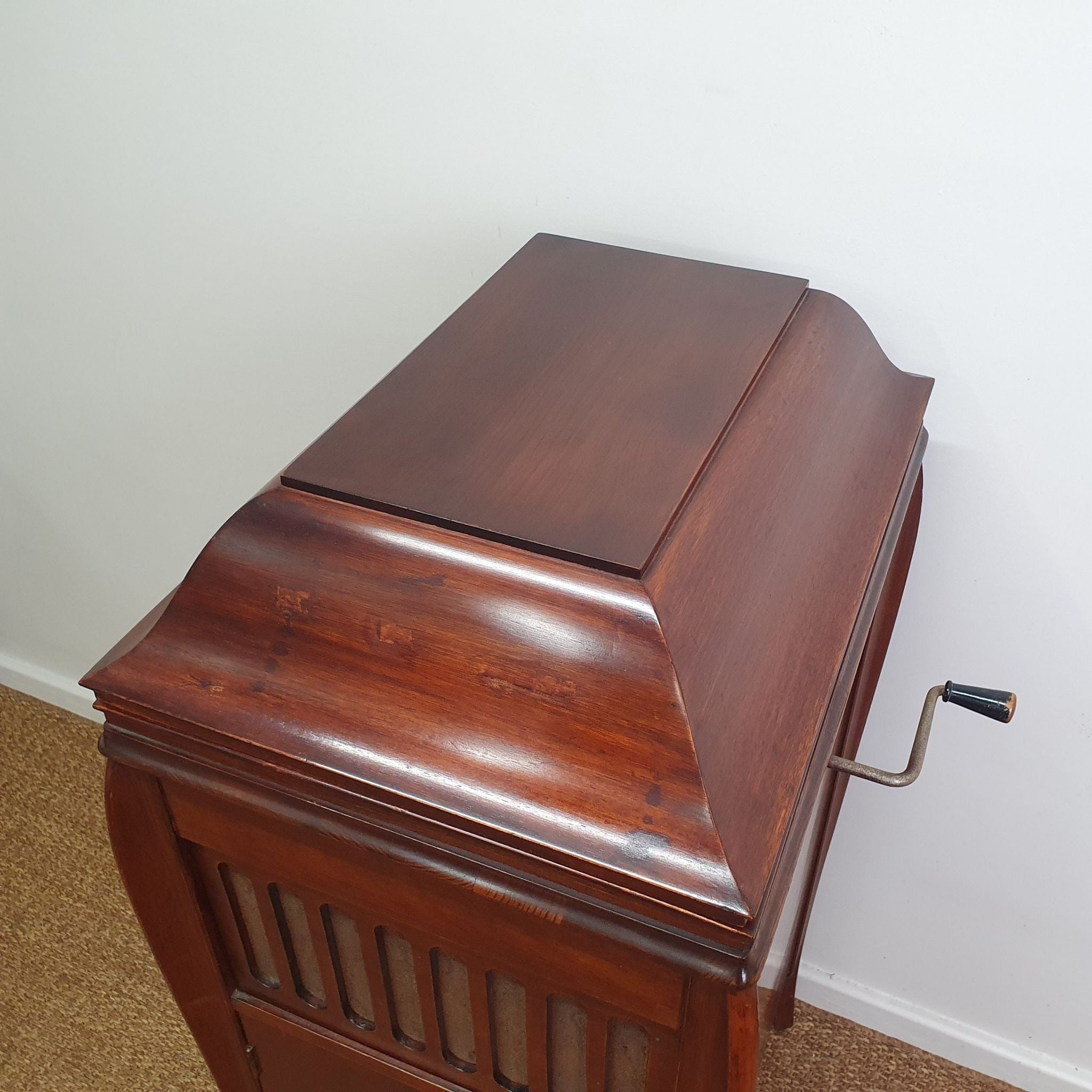 The cabinet’s elegant design includes intricate woodwork and a warm timber finish, characteristic of the period. Standing 107cm high (145cm when open), it serves as both a functional music player and a decorative piece.