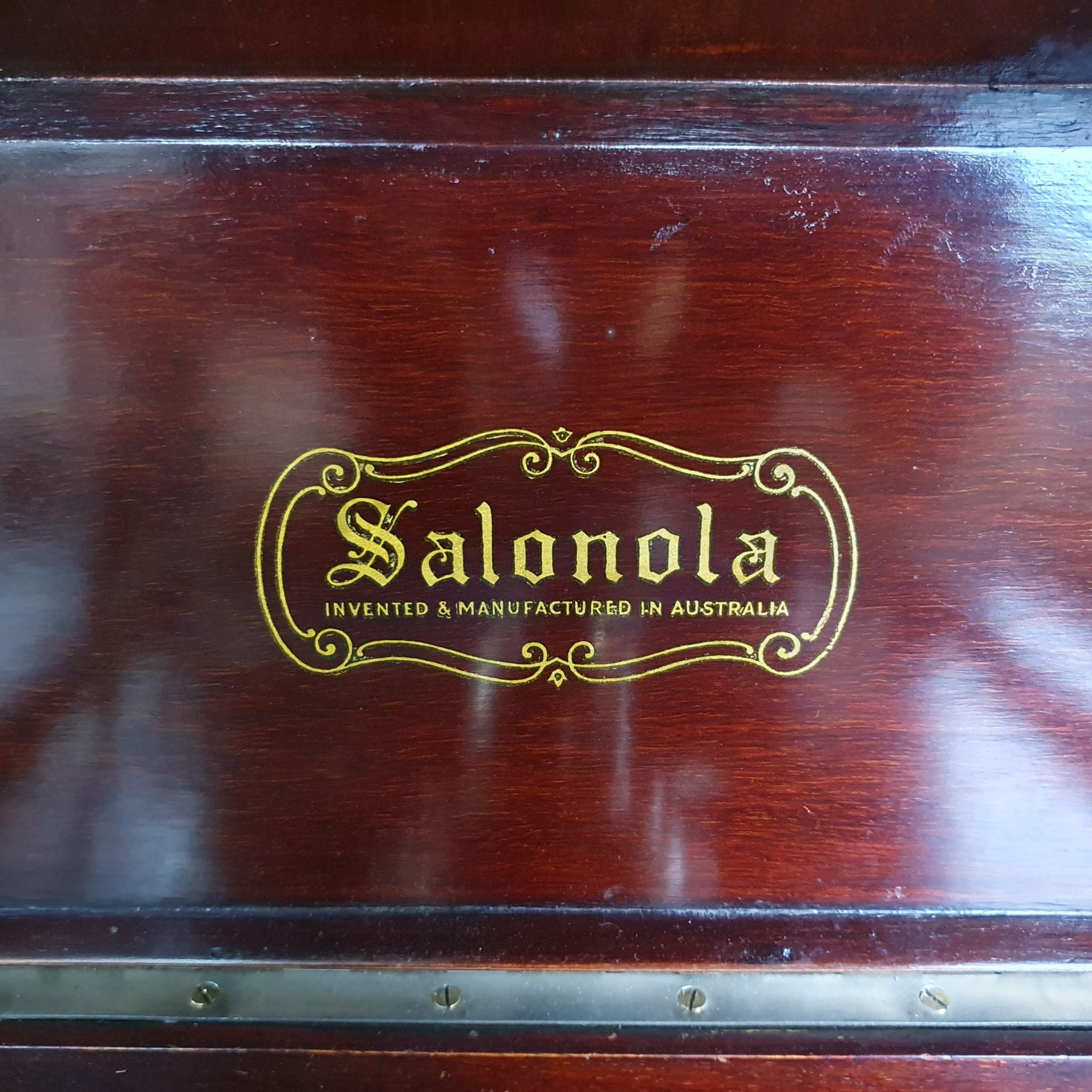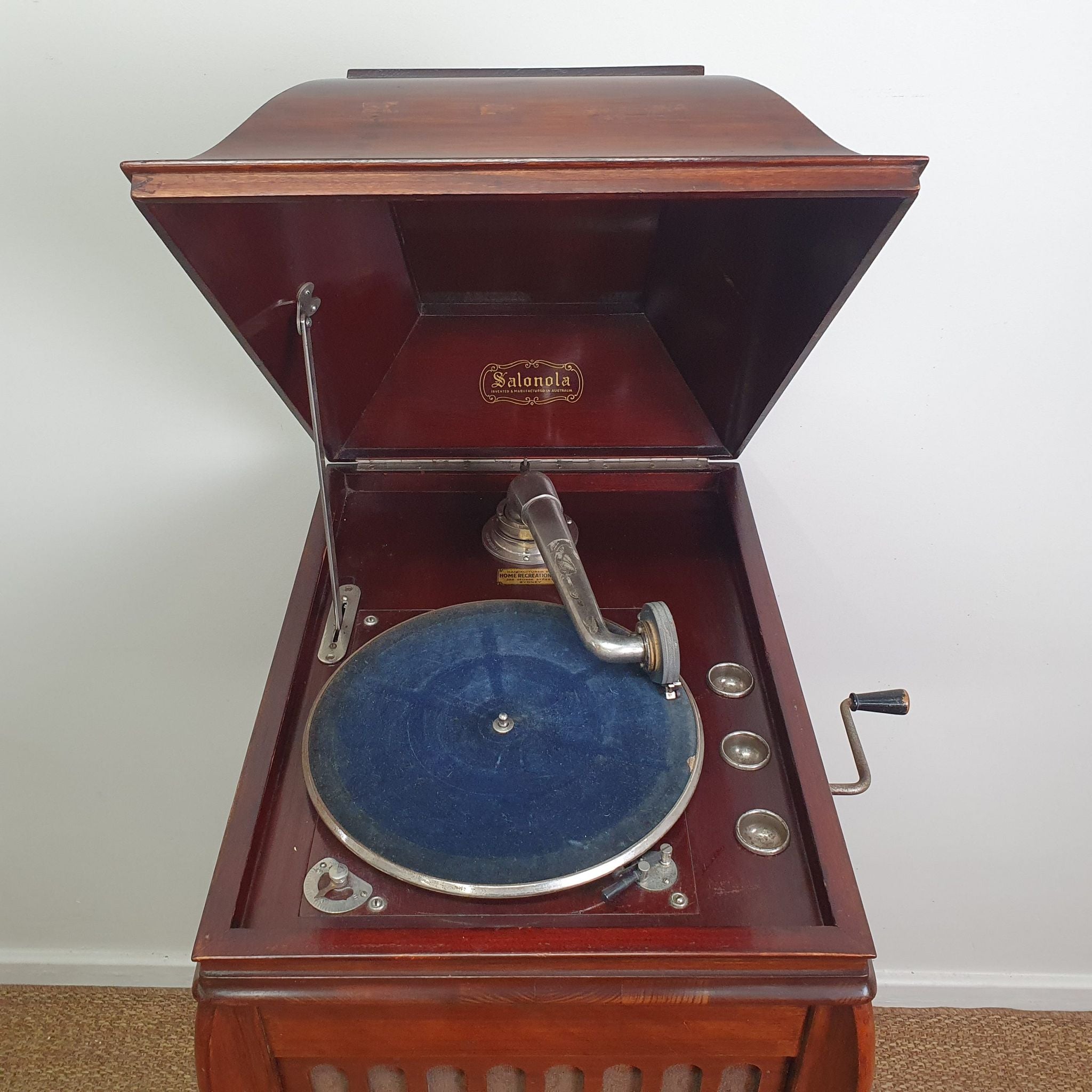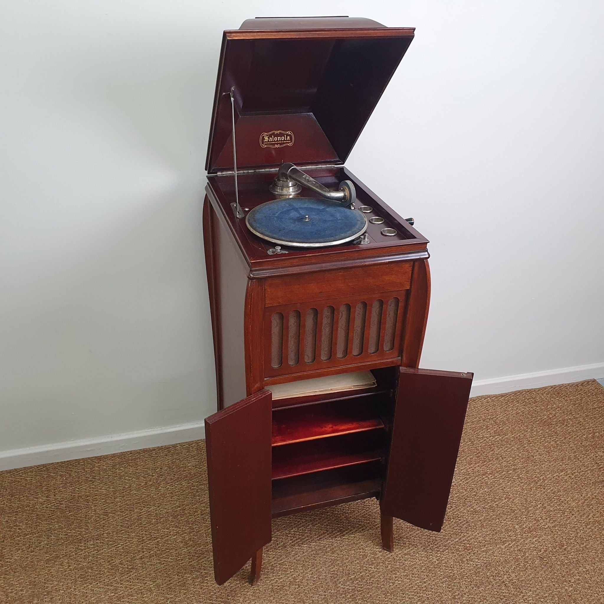 This 1930s Australian-made Salonola gramophone by Heiron & Smith Ltd. showcases the craftsmanship of early 20th-century acoustic amplification. Built into a timber cabinet with horizontal shelves beneath, it offers both functionality and vintage charm. Salonola was among Australia’s first spring-driven, disc-playing gramophones, marketed as “The Instrument with the Human Voice”.