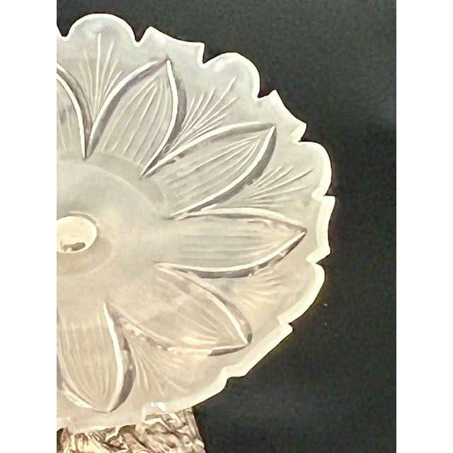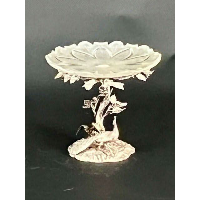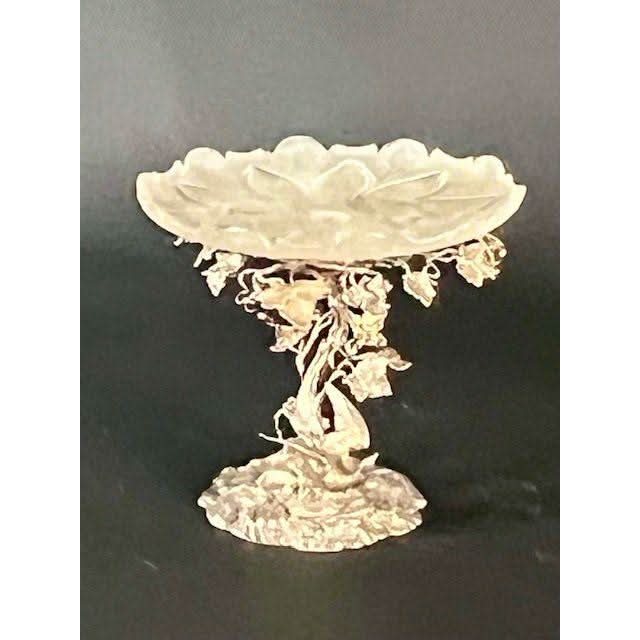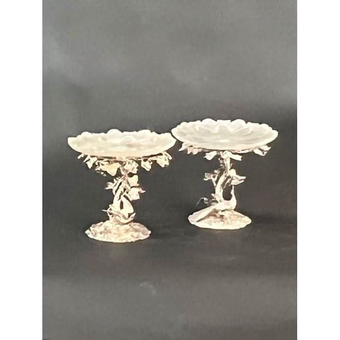 These are a good and hard to find Pair of genuine antique 19th century Victorian Tazzas with silver plated metal bases comprising of grape vines with leaves and grapes on earth like bases mounted with circular cut and frosted glass circular platters with shaped and raised edges.