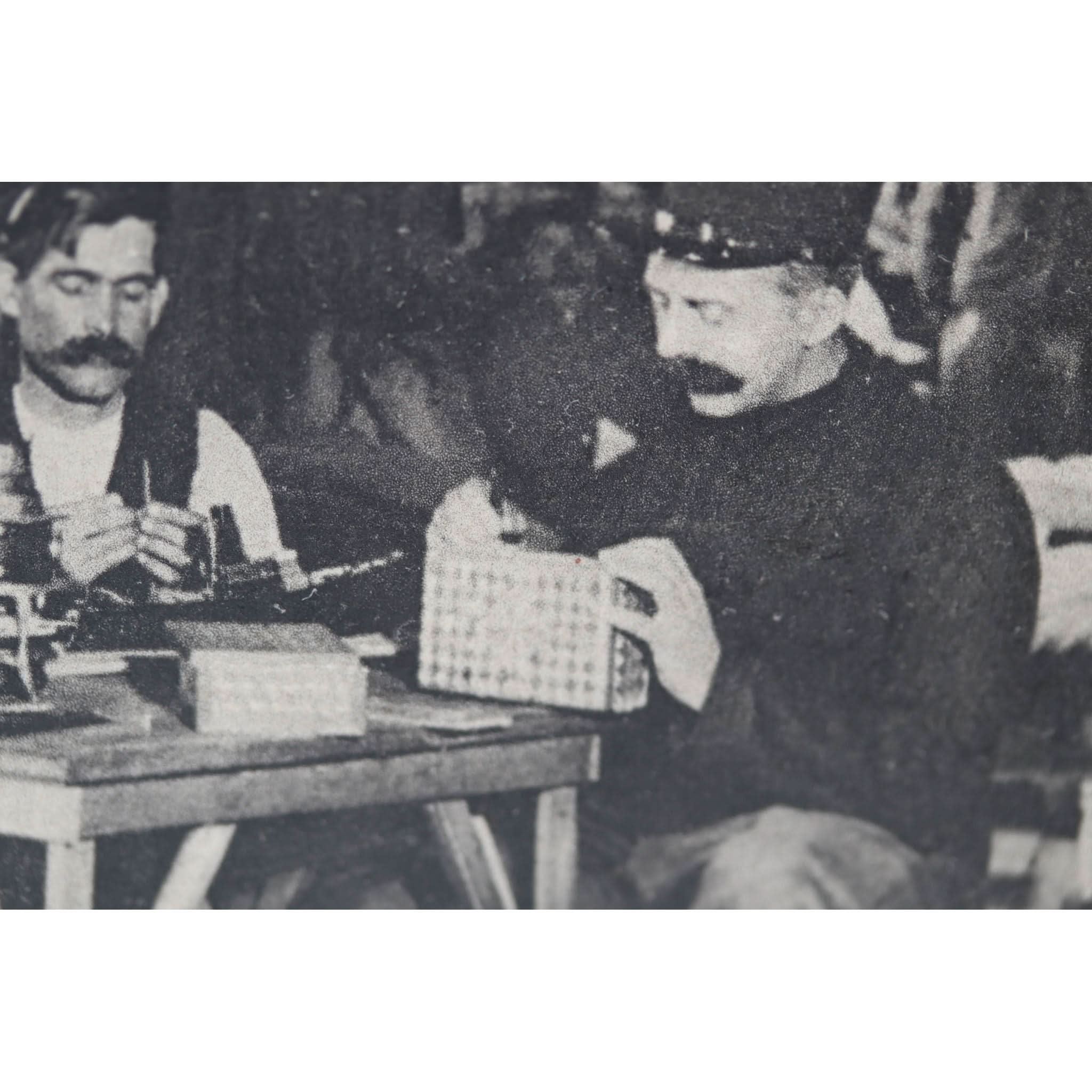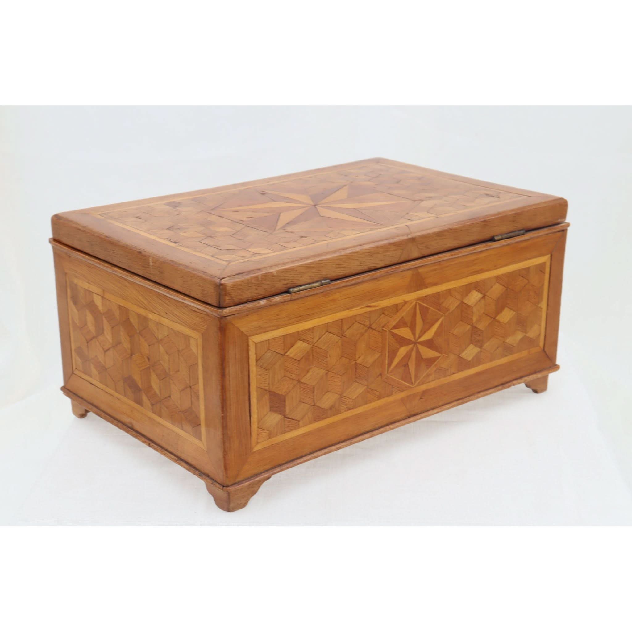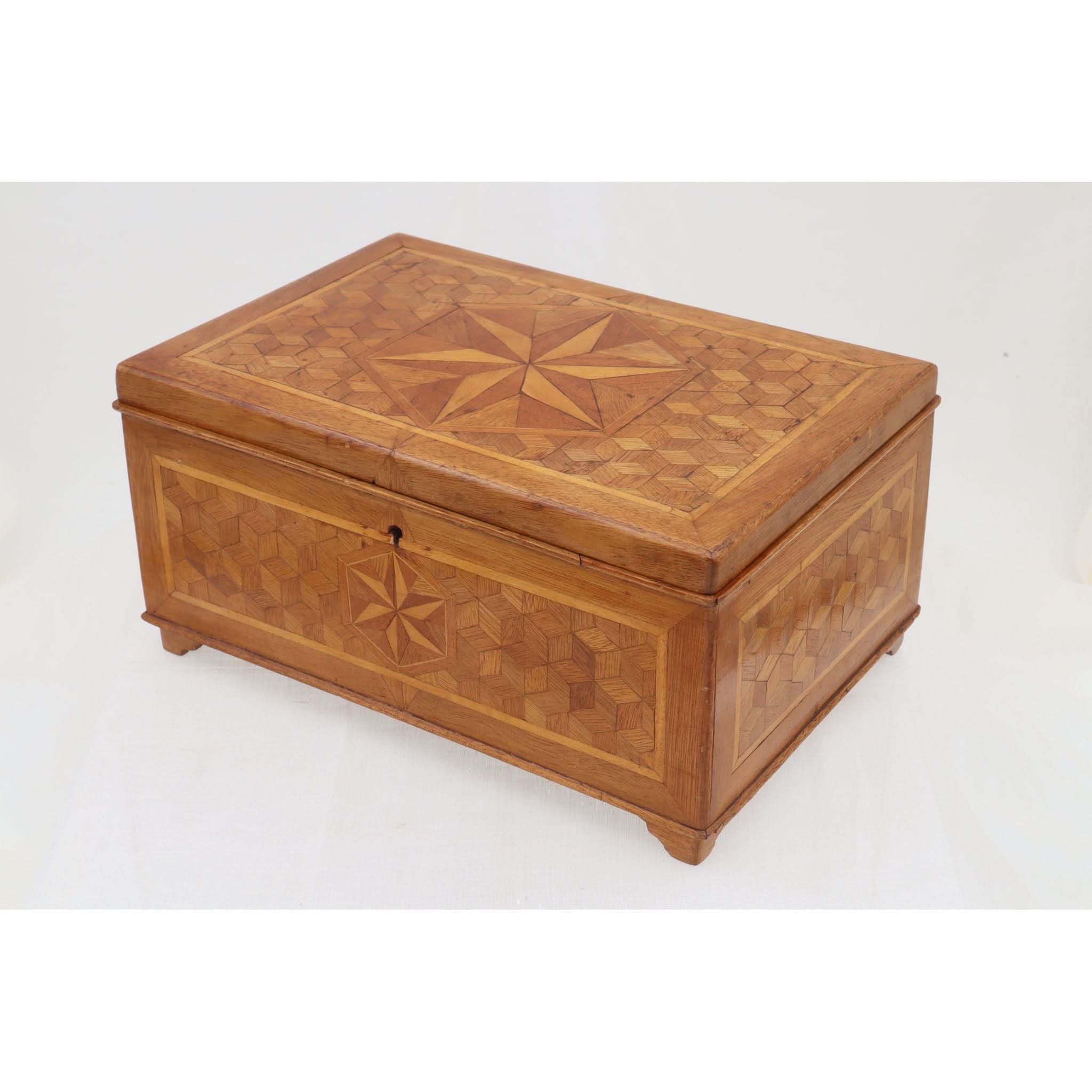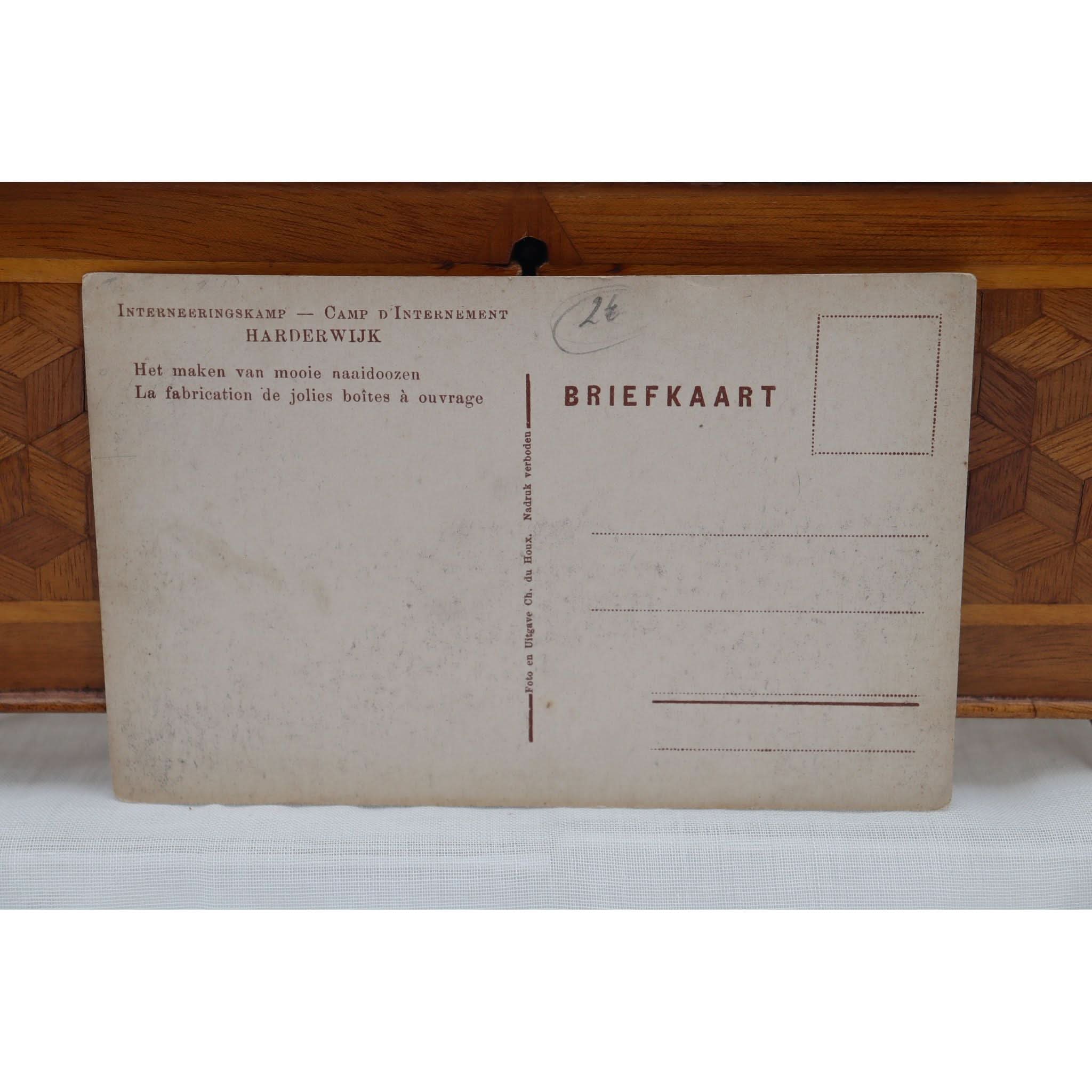 This well made wooden box was made in the Harderwijk internment camp in the Netherlands during WW1. All four sides carry a veneer of the tumbling blocks design, while the front, the back and the lid are also adorned with an inlaid rosette. The top and bottom of the box is cockbeaded to give a little more interest to the piece, and it stands on four bracket feet. The inside of the lid also carries an inlaid geometric pattern. Inside this pattern is a pen and ink signature, and the chip carved inscription, in French, "A Ma Filleule Harderwyk 1914 15 16 - this translates as "To my goddaughter, Harderwyk", with this spelling of Harderwijk possibly being a French speaker's spelling. When I was doing some research on this box I came across a postcard from Harderwijk showng three men in the camp finishing off very similar boxes, with the box in front of the man on the right an almost identical piece. The back of the postcard has the following inscription in Dutch and French "The making of pretty work boxes". I have included the postcard with the box. The width of the box is 253 mm (10 inches), the depth 170 mm (6.75 inches) and it stands 120 mm (4.75 inches) high. It is in very good condition.