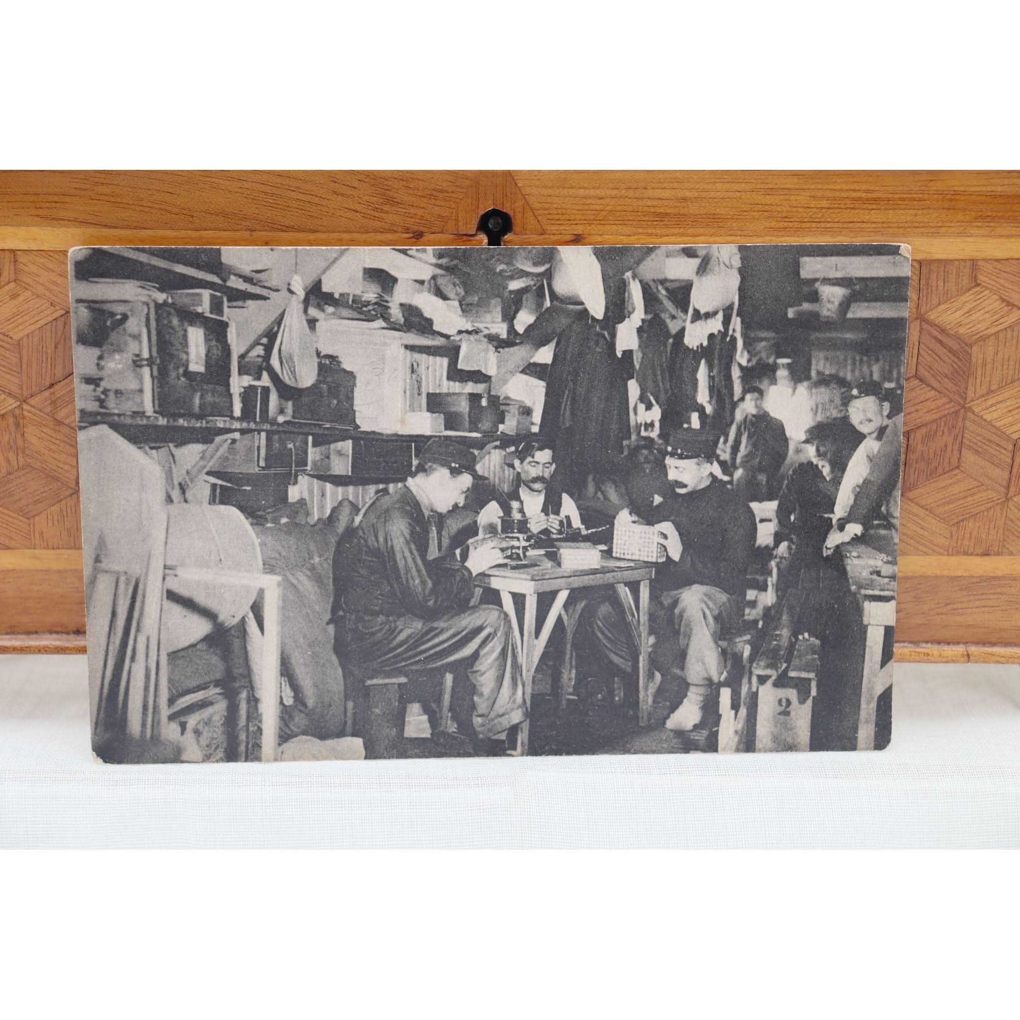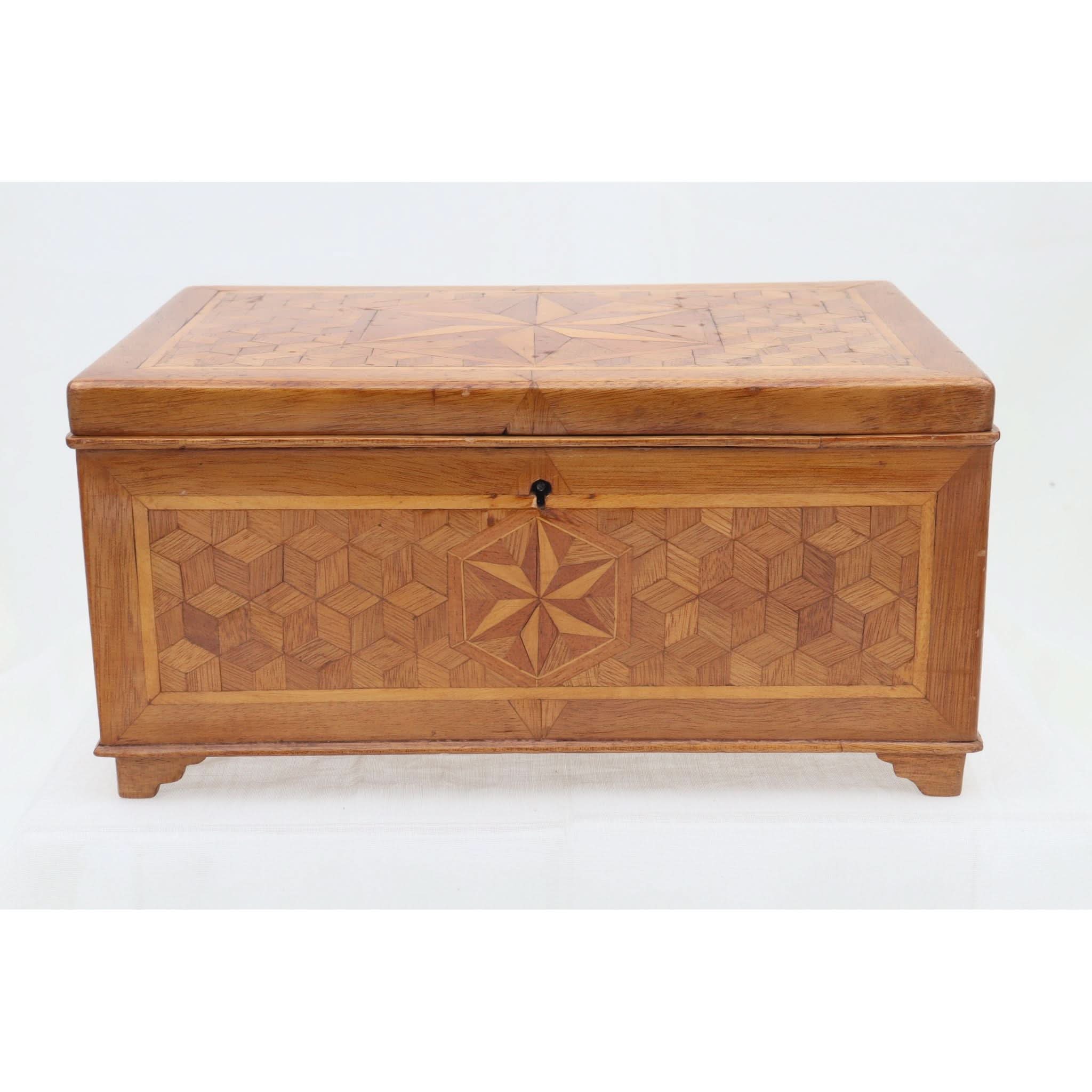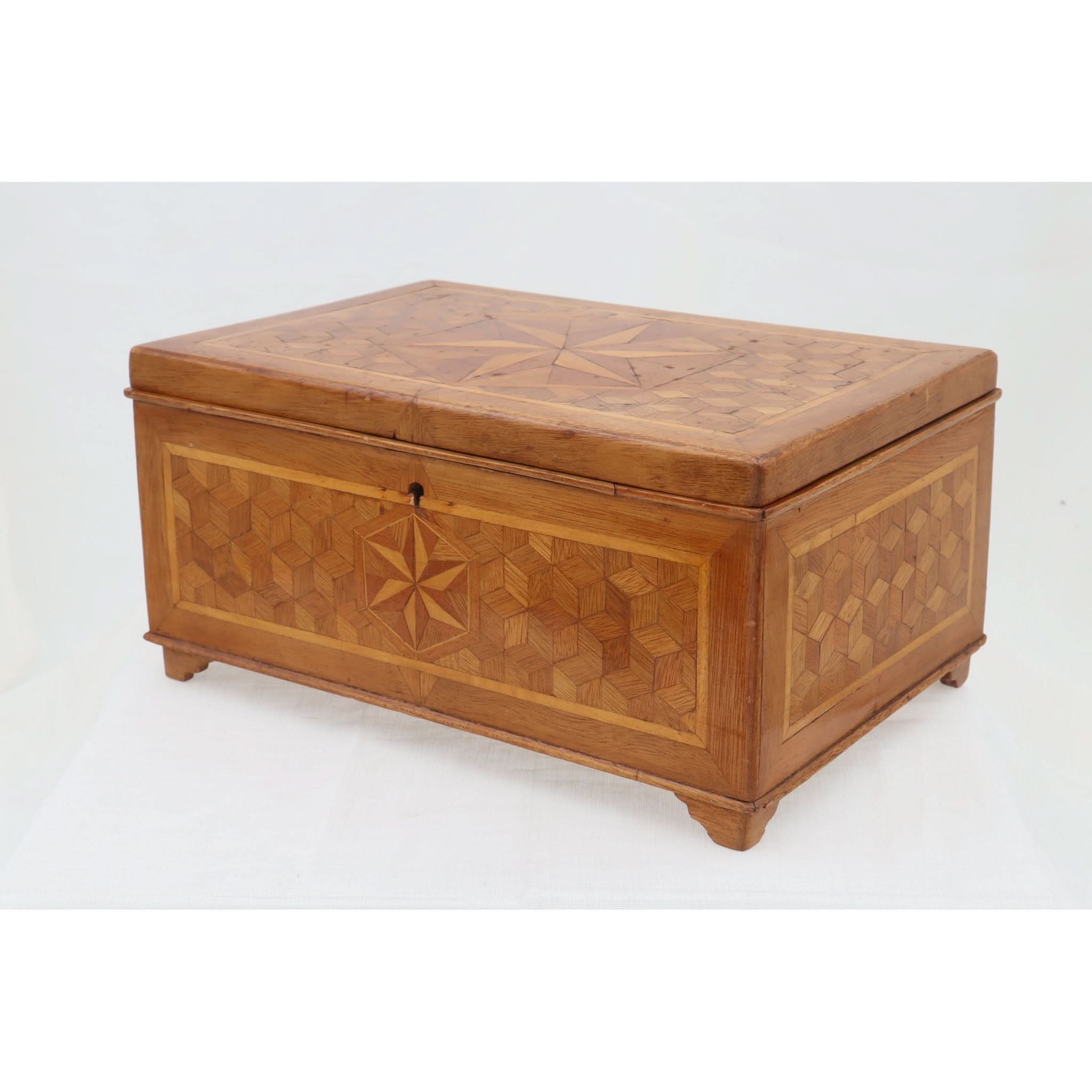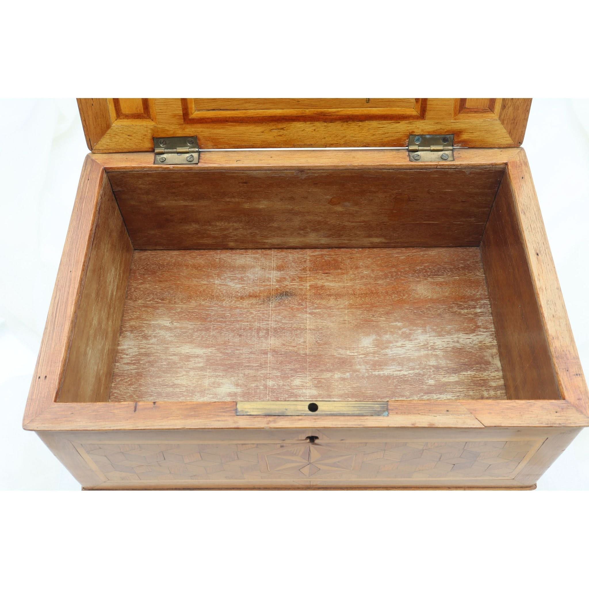 This well made wooden box was made in the Harderwijk internment camp in the Netherlands during WW1. All four sides carry a veneer of the tumbling blocks design, while the front, the back and the lid are also adorned with an inlaid rosette. The top and bottom of the box is cockbeaded to give a little more interest to the piece, and it stands on four bracket feet. The inside of the lid also carries an inlaid geometric pattern. Inside this pattern is a pen and ink signature, and the chip carved inscription, in French, "A Ma Filleule Harderwyk 1914 15 16 - this translates as "To my goddaughter, Harderwyk", with this spelling of Harderwijk possibly being a French speaker's spelling. When I was doing some research on this box I came across a postcard from Harderwijk showng three men in the camp finishing off very similar boxes, with the box in front of the man on the right an almost identical piece. The back of the postcard has the following inscription in Dutch and French "The making of pretty work boxes". I have included the postcard with the box. The width of the box is 253 mm (10 inches), the depth 170 mm (6.75 inches) and it stands 120 mm (4.75 inches) high. It is in very good condition.