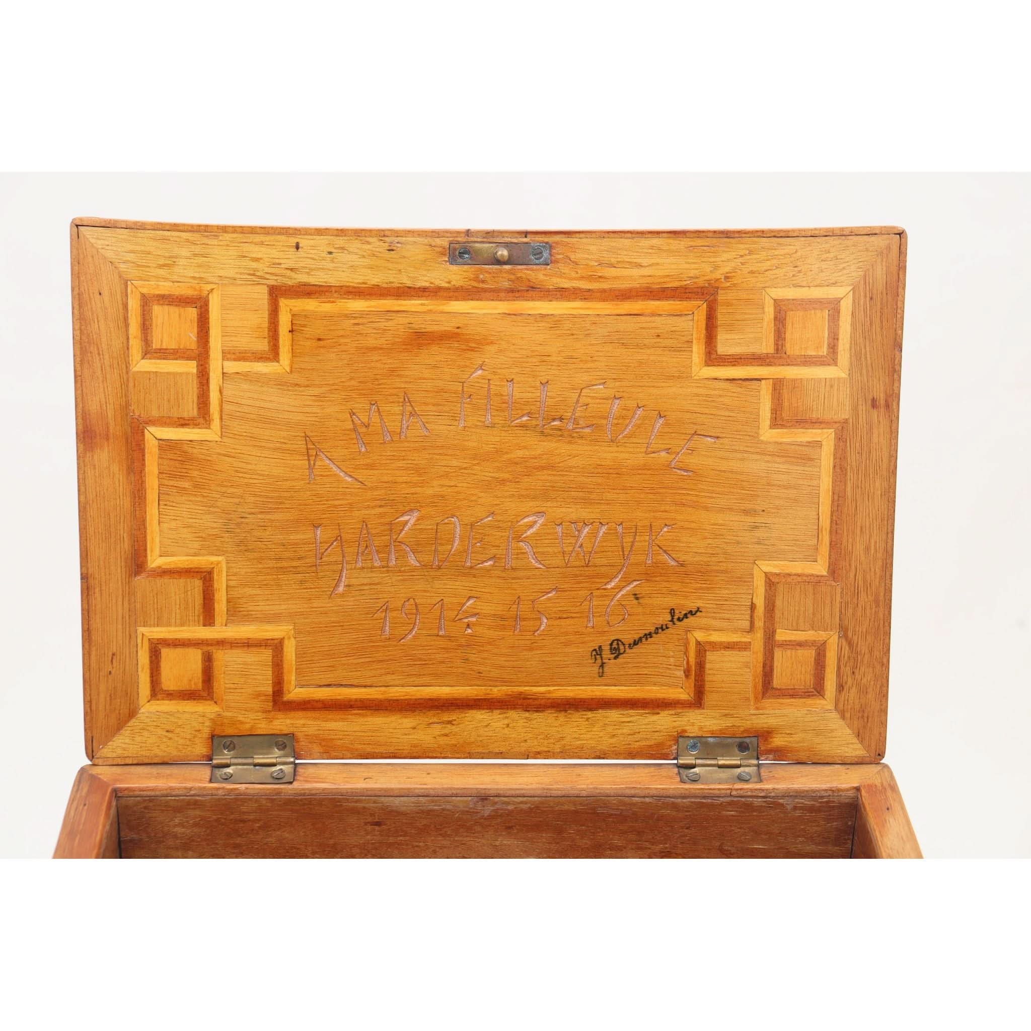 On the 4th of August 1914, in order to attack France, Germany invaded neutral Belgium, which resulted in a vast number of Belgians fleeing to the neutral Netherlands. These refugees were housed in a number of displacement camps, one of which was Harderwijk, near the town of the same name. To earn a little money and keep them occupied, inmates were allowed to manufacture small items such as this box. The camps were closed down shortly after the end of the war.