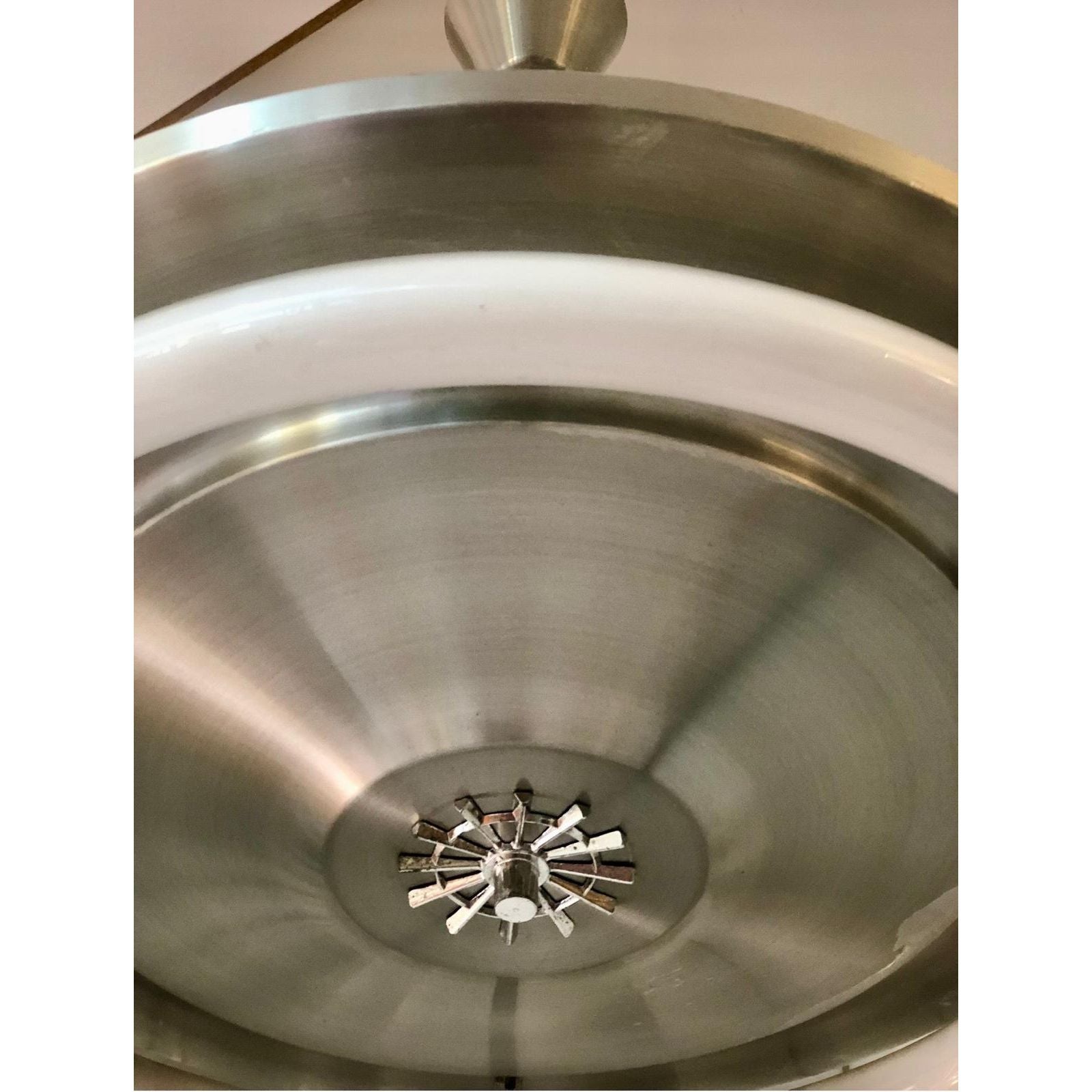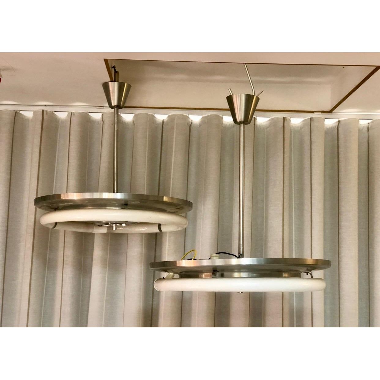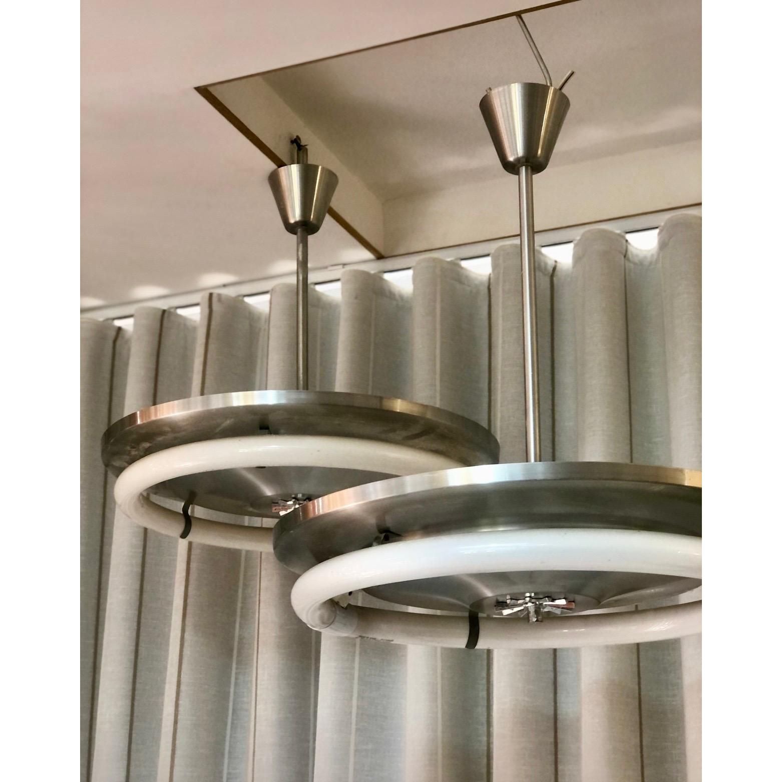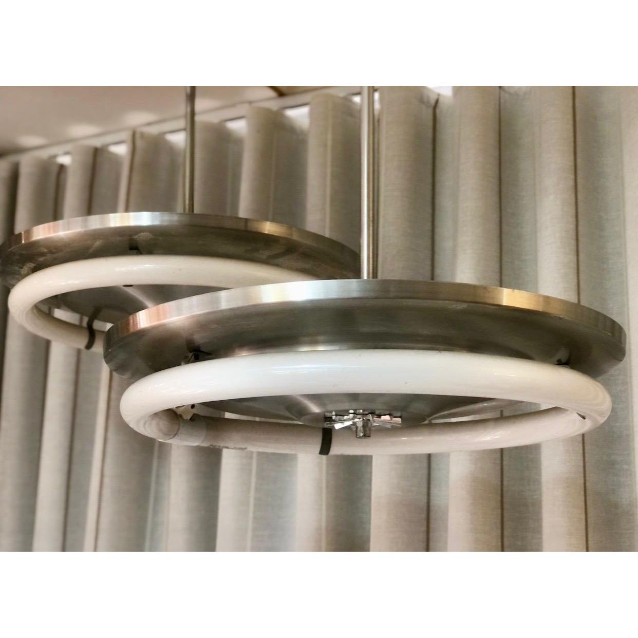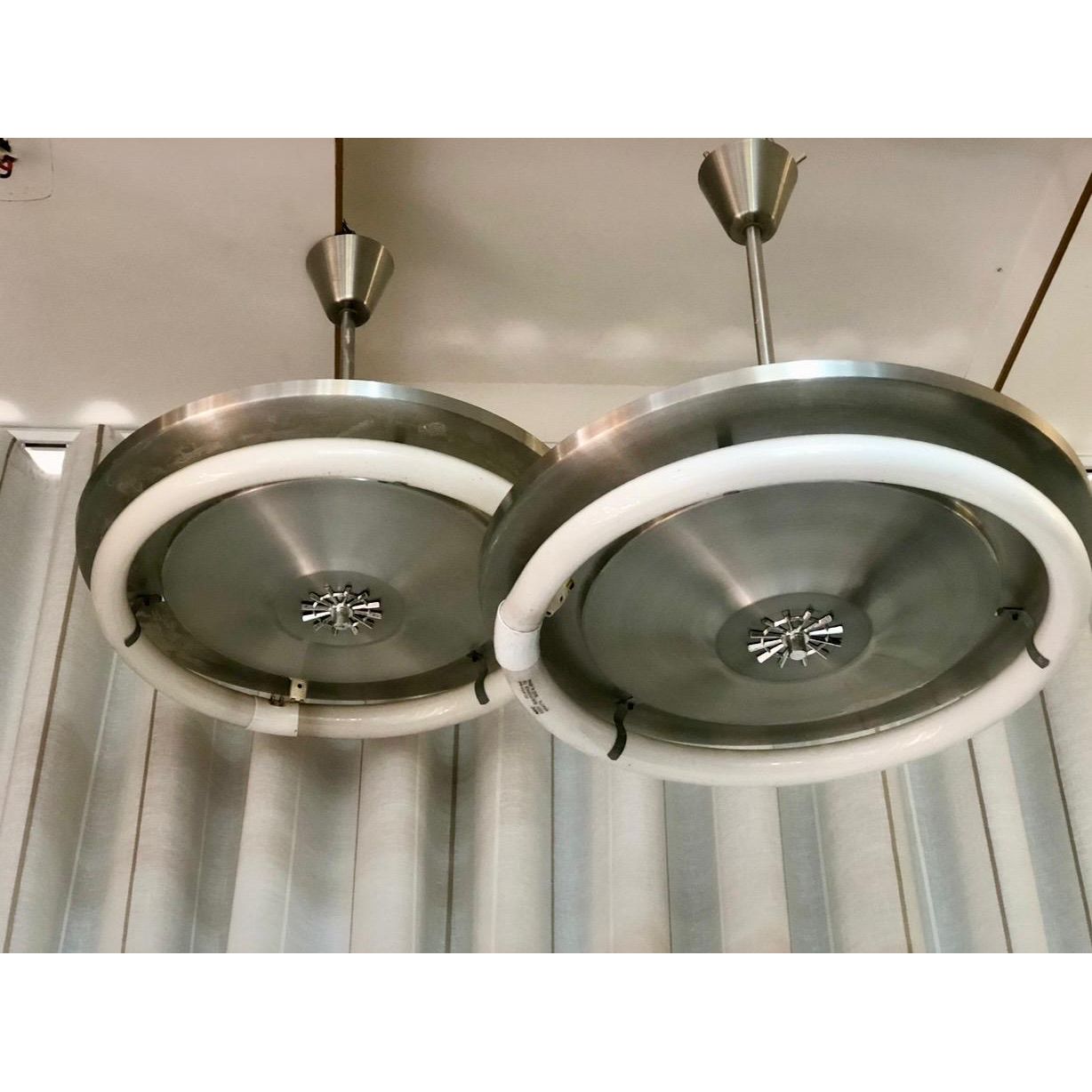 Each light features a striking round profile with a brushed silver aluminium disc frame, clean-lined and beautifully minimal. A true nod to the Space Age design movement that dominated interiors during the 1970s. The exposed original NEC circular fluorescent tube sits proudly on the frame, celebrating the industrial aesthetic rather than concealing it. It’s functional design made sculptural.