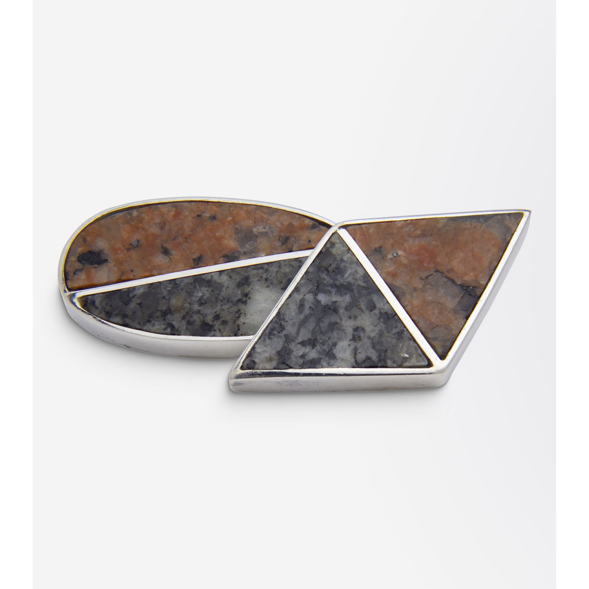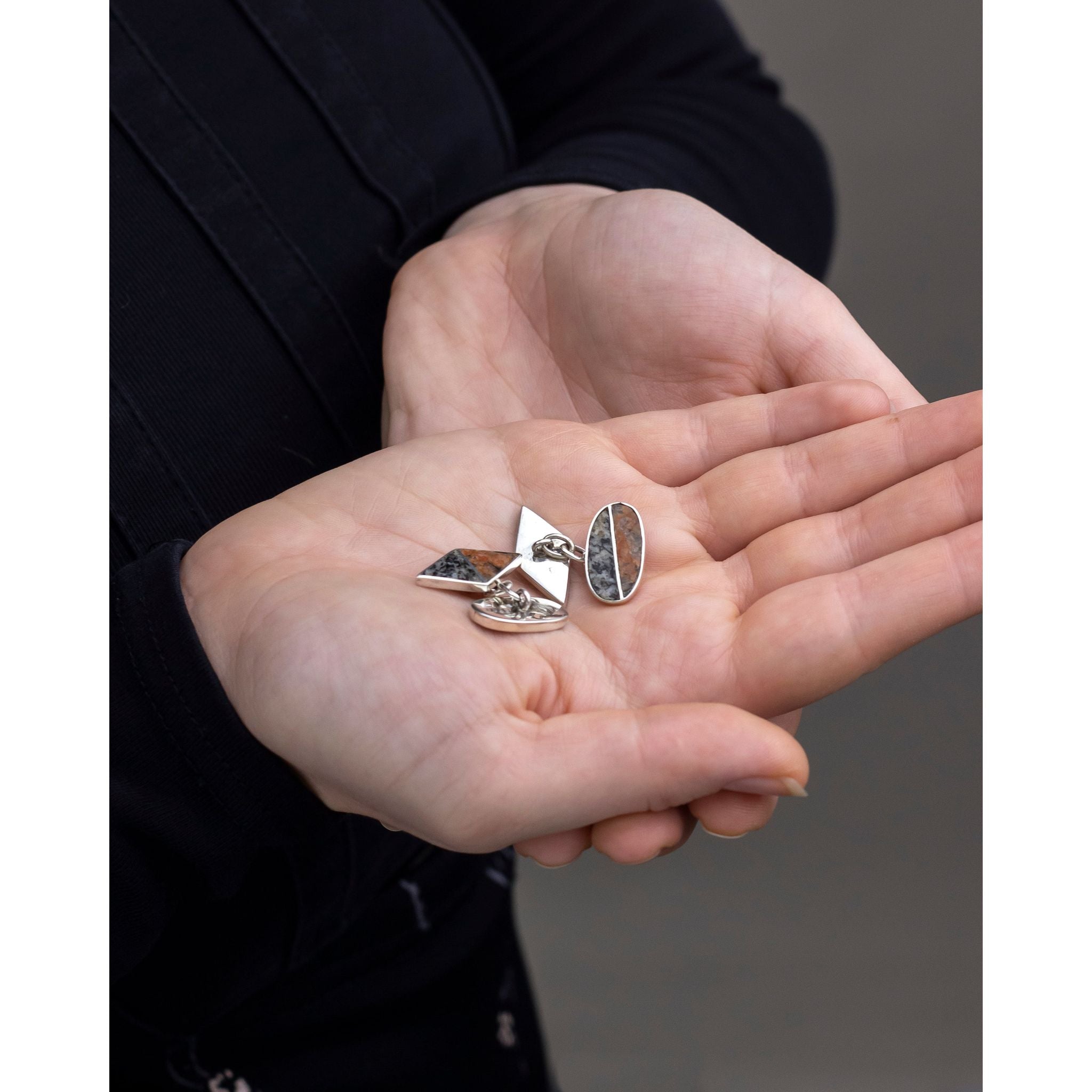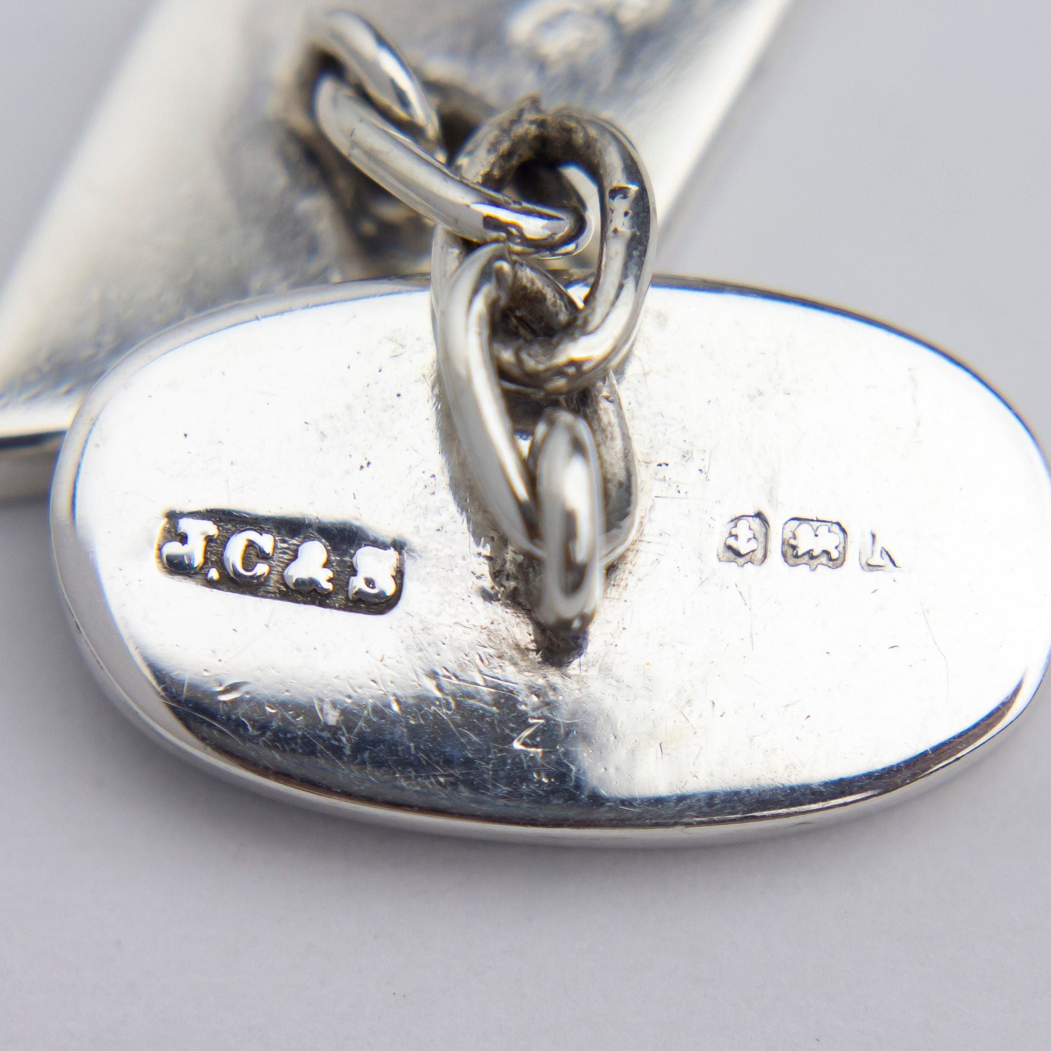 This pair of English sterling silver and agate cufflinks were made in the 1930s and have a distinct Art Deco appearance. The pair which were sourced locally in Brisbane feature pieces of grey and pink Scottish agate which have been set into sterling silver mounts made in Birmingham. The rear of the cufflinks feature hallmarks for manufacture in 1937 by Birmingham maker, J Cook and Son who operated between 1885 and 1939. The plaques of the cufflinks comprise an oval and a diamond on each and have a 'positive negative' of pink and grey Scottish agate. Whilst British sterling silver cufflinks are by no means rare, this pair are more interesting in their design than most that we come across, hence why we couldn't pass them up. Whilst they have been well worn, the pair are in very good order for their age, and are perfectly wearable for something nearly 100 years old. A great pair of affordable antique cufflinks that could be worn daily to the office with ease.