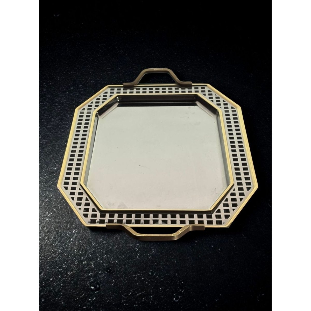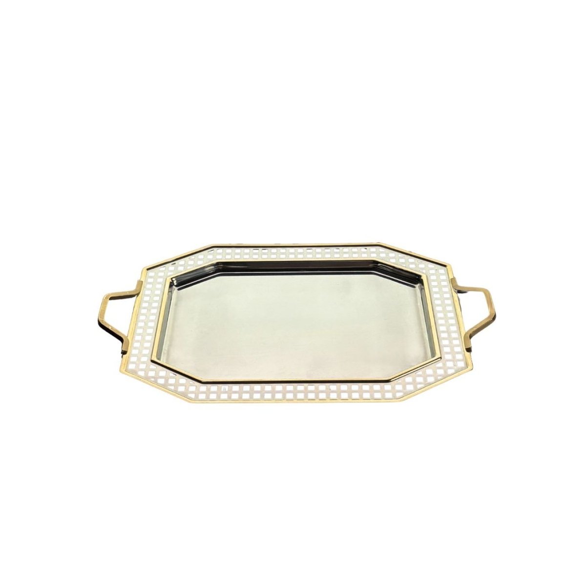 Rectangular serving tray of octagonal outline from the Orchidea line, executed in 18/10 stainless steel with 24-carat gold plating, featuring a pierced geometric border and integrated handles. The surface finished in polished stainless steel. Maker’s mark “Inoxpran 18/10” stamped to the underside.