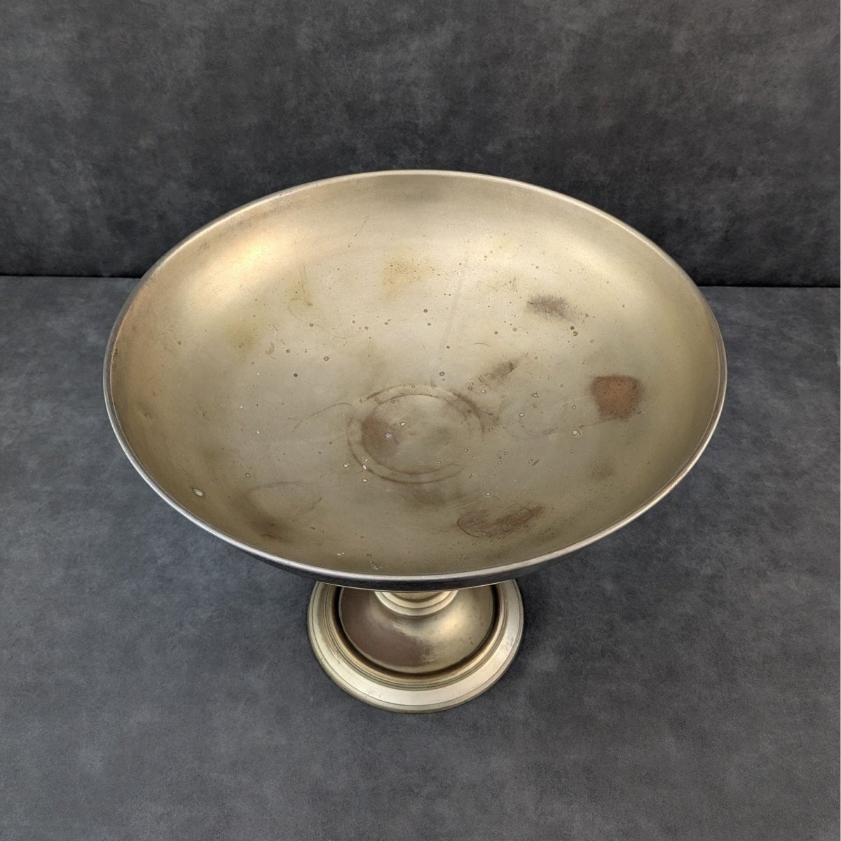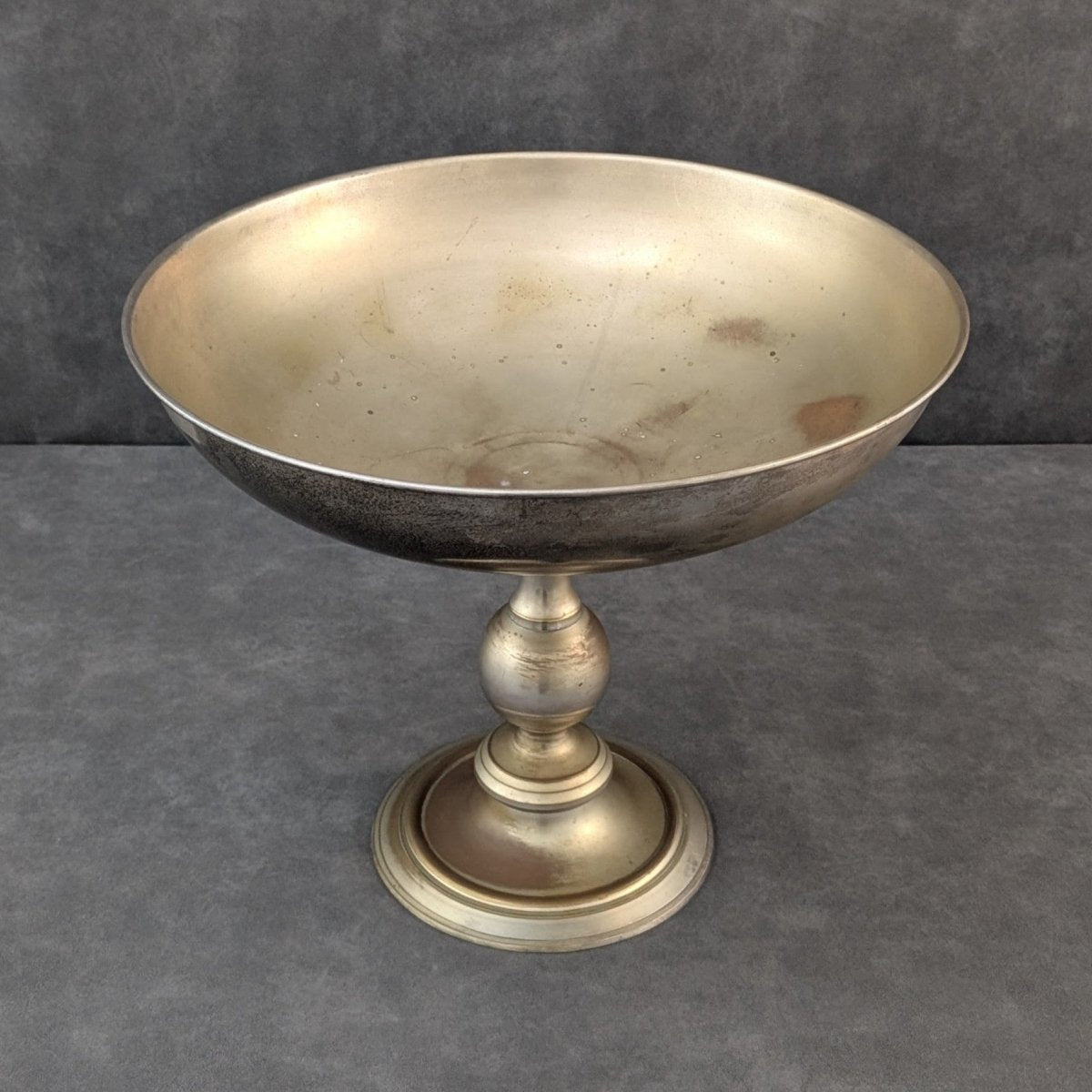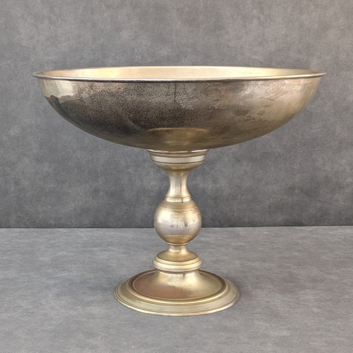 Made in Europe in silvered brass, this elevated champagne bucket reflects the classical tradition of wide rimmed serving vessels used across dining rooms, hotels and reception spaces throughout the mid twentieth century. The generous bowl, balanced by a turned pedestal base, speaks to the functional metalwork of the period, crafted for tables that carried ceremony and display. Its scale suits multiple bottles on ice, yet its proportion also lends itself to floral arrangements and styled centrepieces, retaining the character of a vintage bucket shaped by time and use. A barware piece with the atmosphere of its European origins.