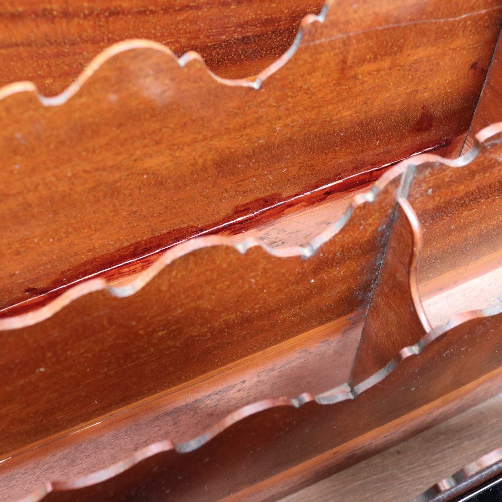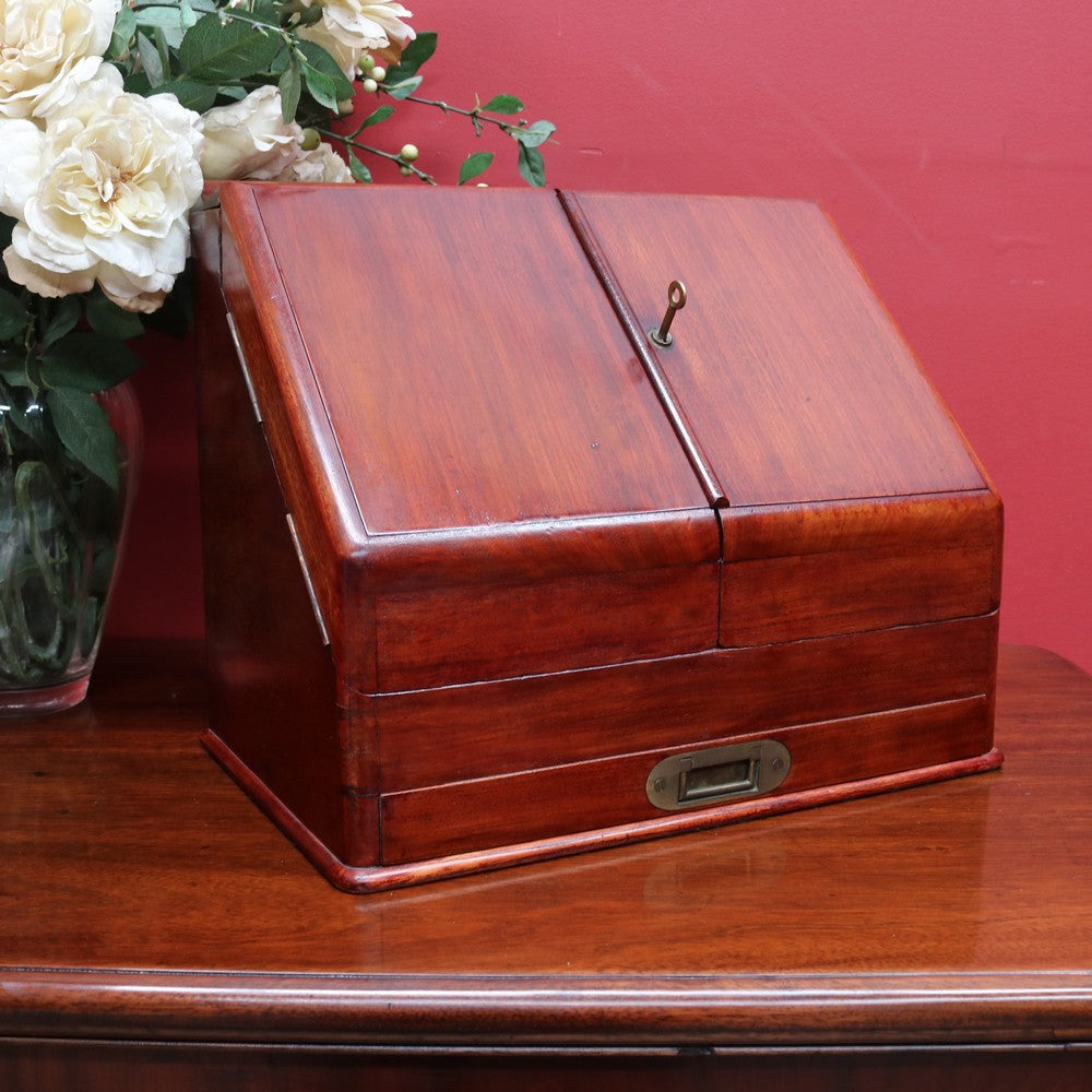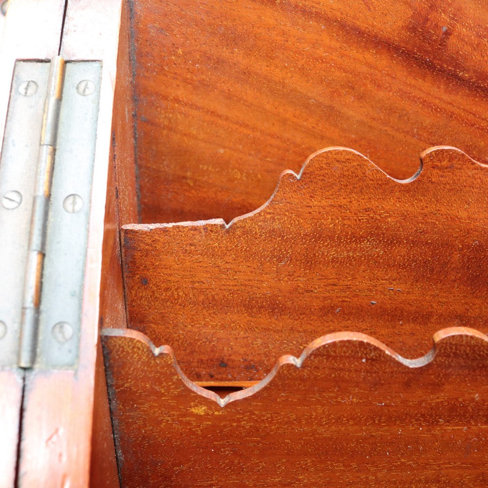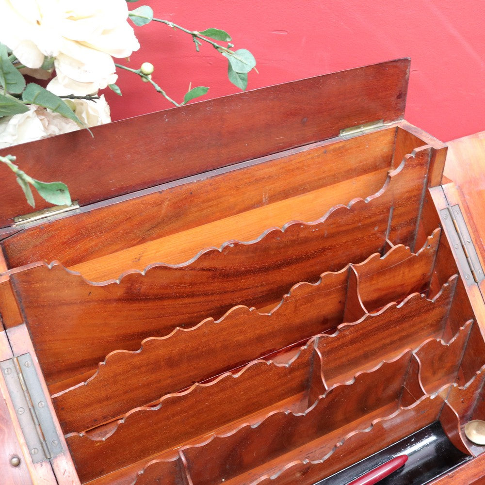 Description: An antique English mahogany compendium or stationery cabinet with hinged doors that open to reveal a beautifully arranged interior. Inside is a removable tray above scalloped, wavy dividers designed for storing letters and documents. The cabinet includes two glass ink bottles and a pen or pencil holder. A brass pin secures the lower drawer and can only be opened when the main compartment is unlocked and the pin lifted, a clever feature of its original design. A fine and elegant example that would take pride of place on any desk or side cabinet.