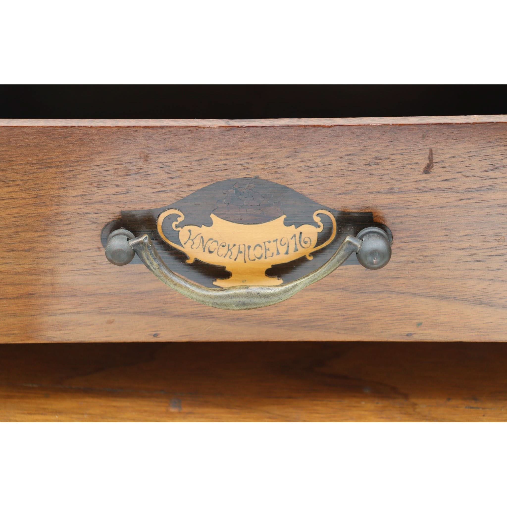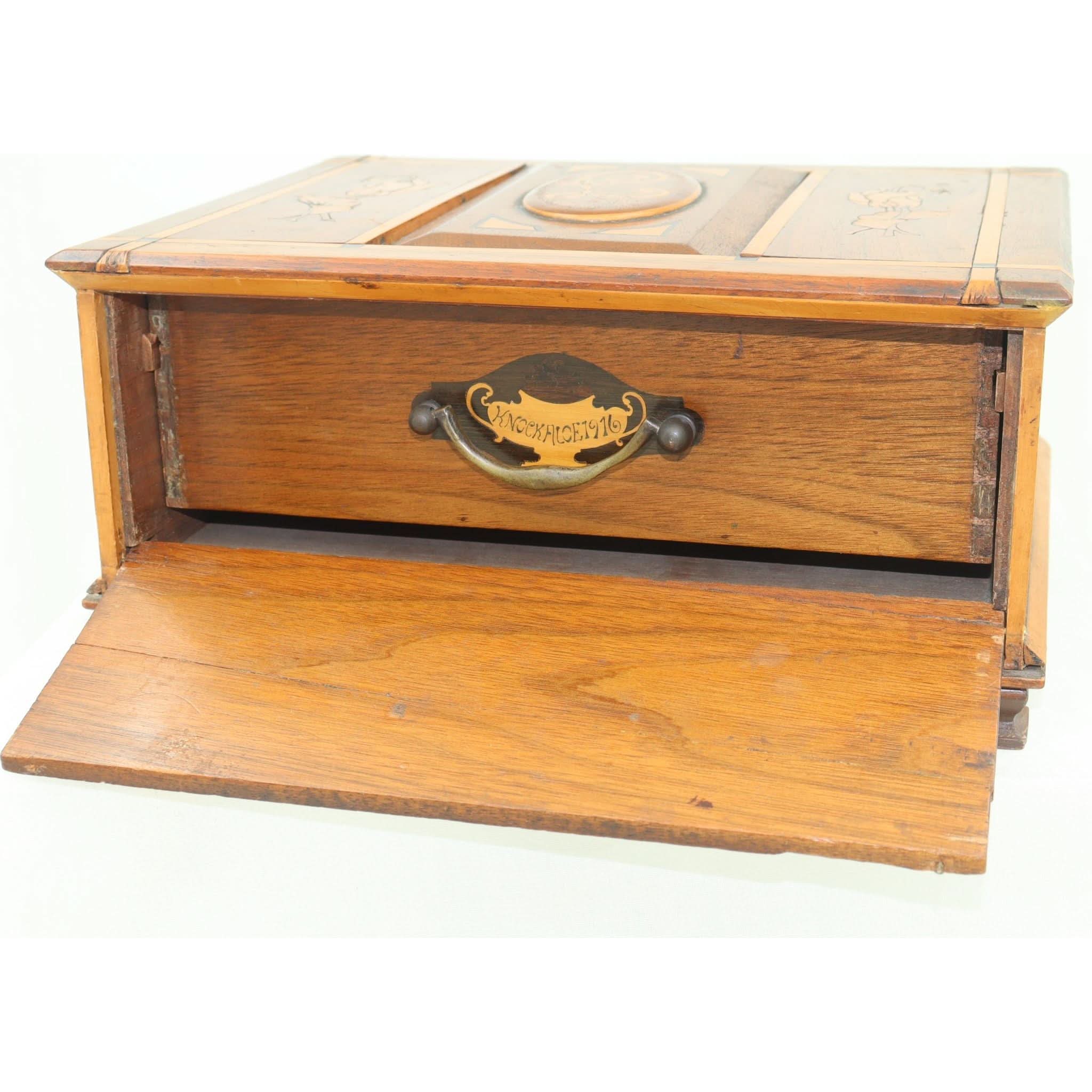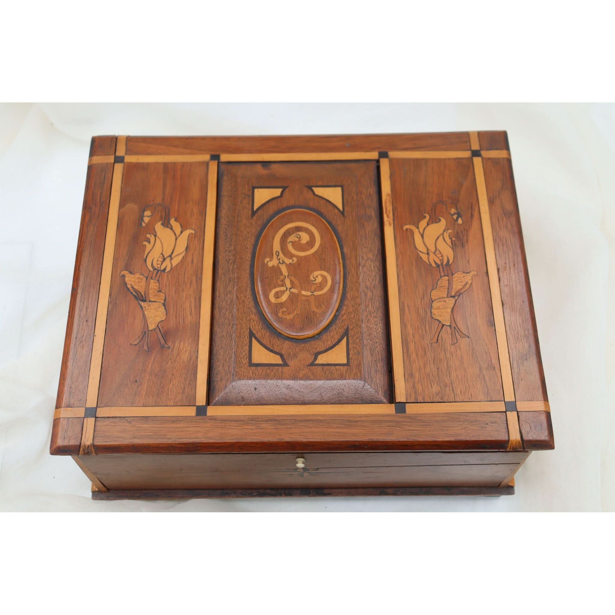 This walnut dressing table box features inlays to each surface, most in the Art Nouveau style. On the lid, flanking the central cartouche, are two representations of tulips and in the centre are the letters "HL". The front and back are inlaid with eight pointed stars, and the sides with four pointed stars, all in contrasting timbers.The drop down front with its turned bone knob, reveals a drawer inlaid with an urn that has the inscription "Knockaloe 1916" written on it. Knockaloe internment camp was set up just after the start of WW1 on the Isle of Man to house interned German civilians, and at its peak held nearly 24,000. There is a curious connection between the Knockaloe camp and two of the early 20th centuries greatest designers.