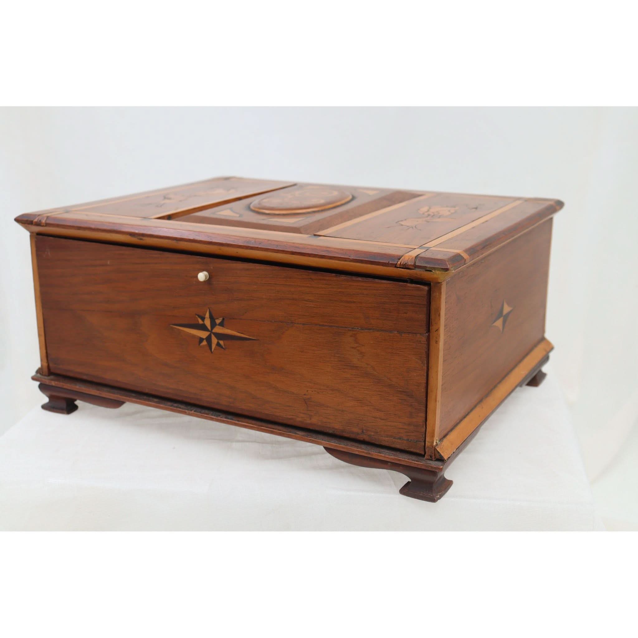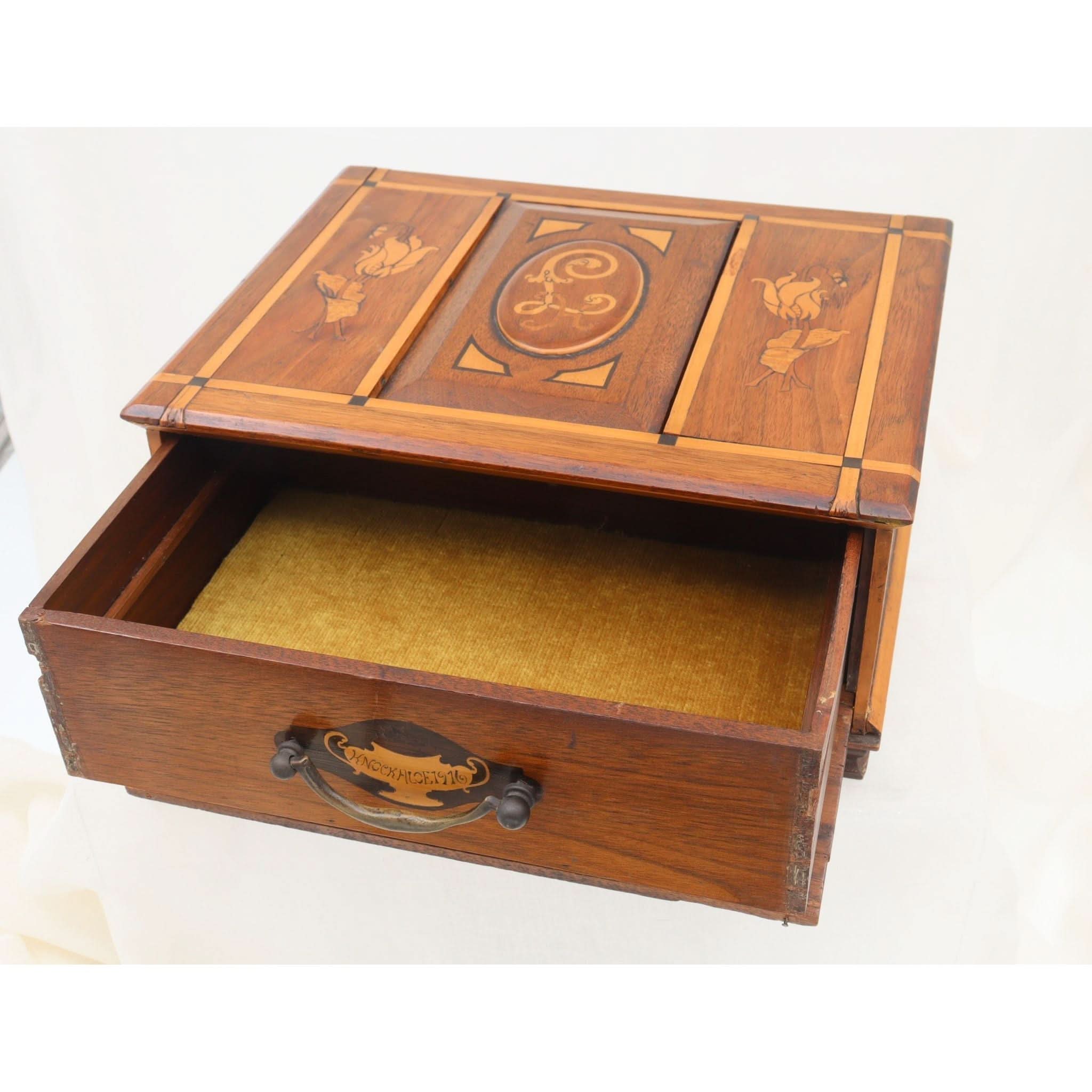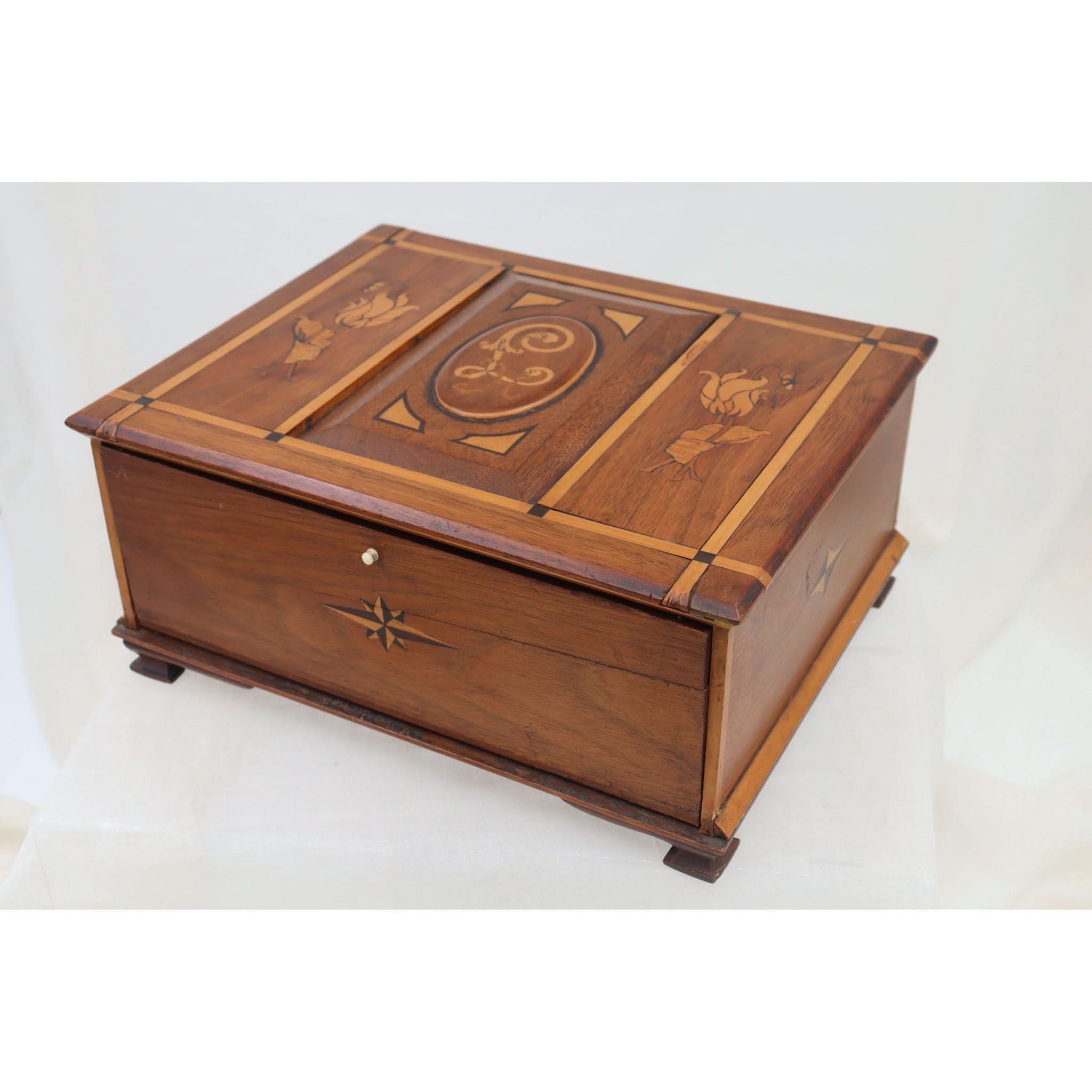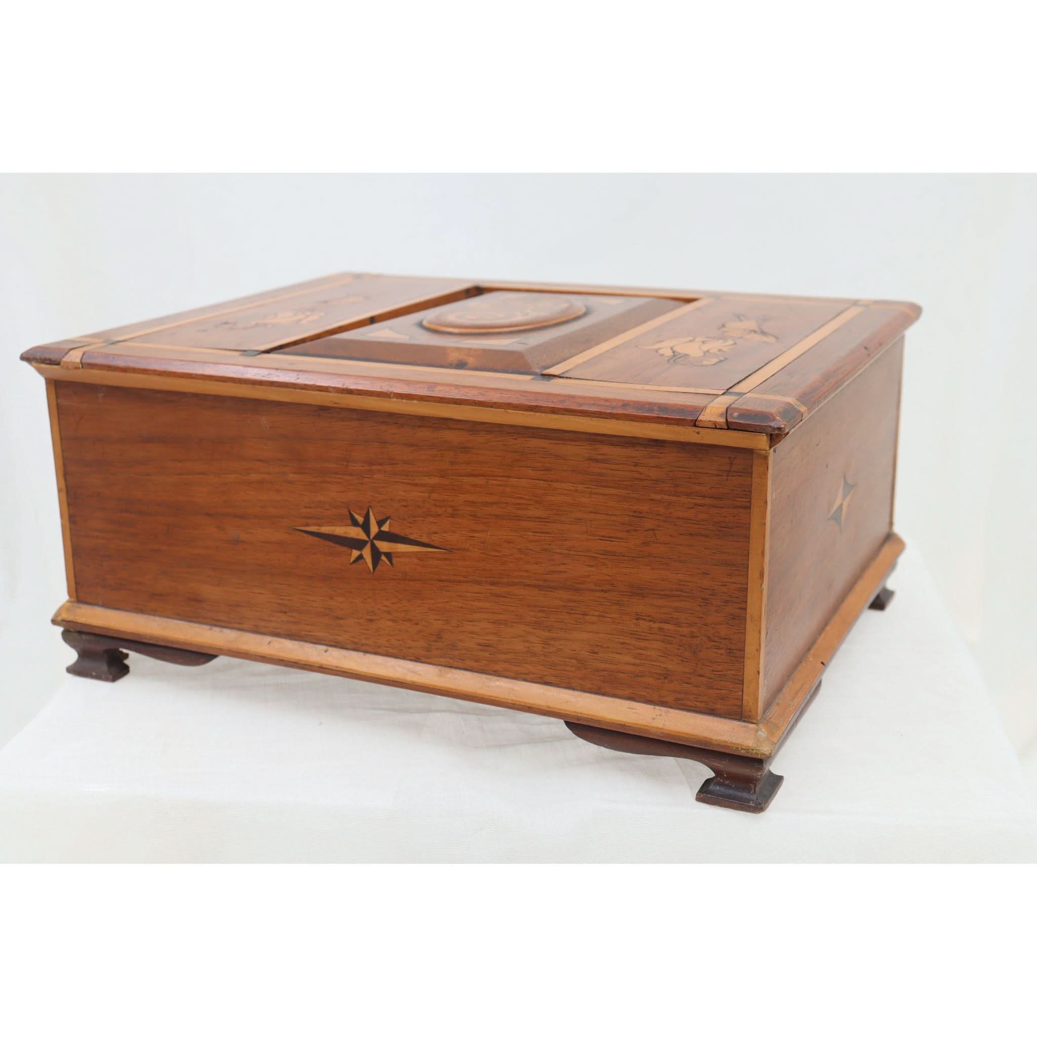 This walnut dressing table box features inlays to each surface, most in the Art Nouveau style. On the lid, flanking the central cartouche, are two representations of tulips and in the centre are the letters "HL". The front and back are inlaid with eight pointed stars, and the sides with four pointed stars, all in contrasting timbers.The drop down front with its turned bone knob, reveals a drawer inlaid with an urn that has the inscription "Knockaloe 1916" written on it. Knockaloe internment camp was set up just after the start of WW1 on the Isle of Man to house interned German civilians, and at its peak held nearly 24,000. There is a curious connection between the Knockaloe camp and two of the early 20th centuries greatest designers.