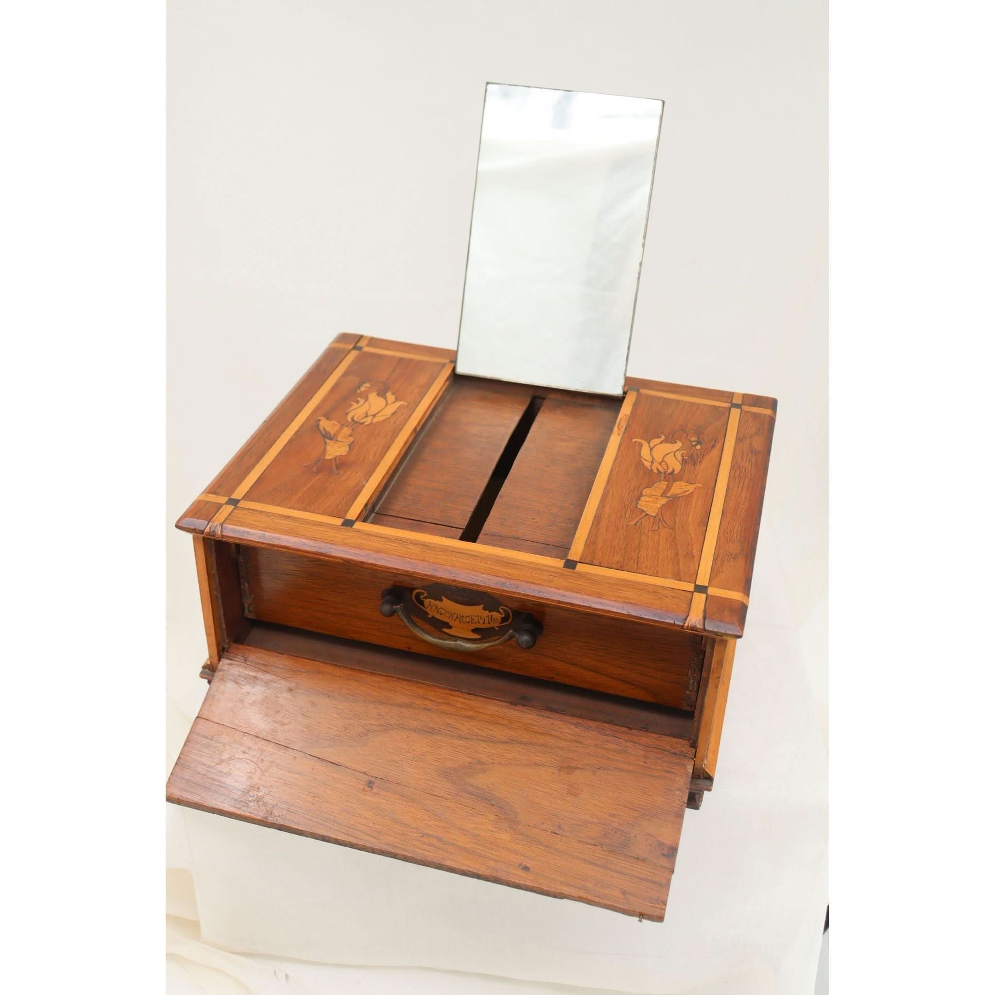 The Scottish architect and designer, Charles Rennie Mackintosh used the talented internees to make items that he had designed, and Archibald Knox, Art Nouveau designer and a native of the Isle of Man, was a guard at the camp. The box measures 303 mm (12 inches) in width, 140 mm (5.5 inches) in height and is 242 mm (9.5 inches) deep. There was a tray that sat inside the drawer, but it is now missing. It appears the maker had envisaged a sliding mechanism for the mirror, but then went with the lift up mirror pivoting to the rear. It is missing some small trim pieces, but has retained its original patina. Overall it is in good condition.