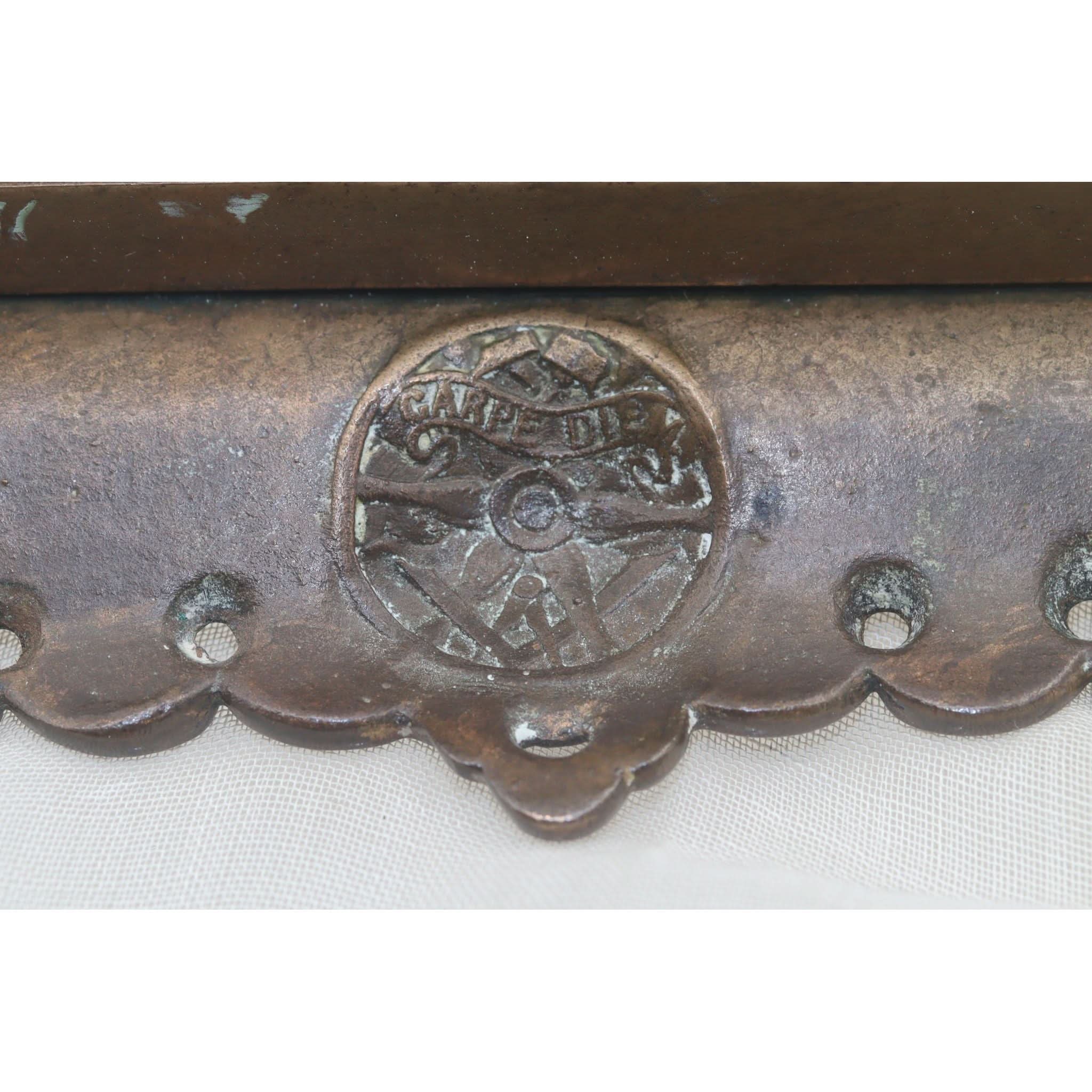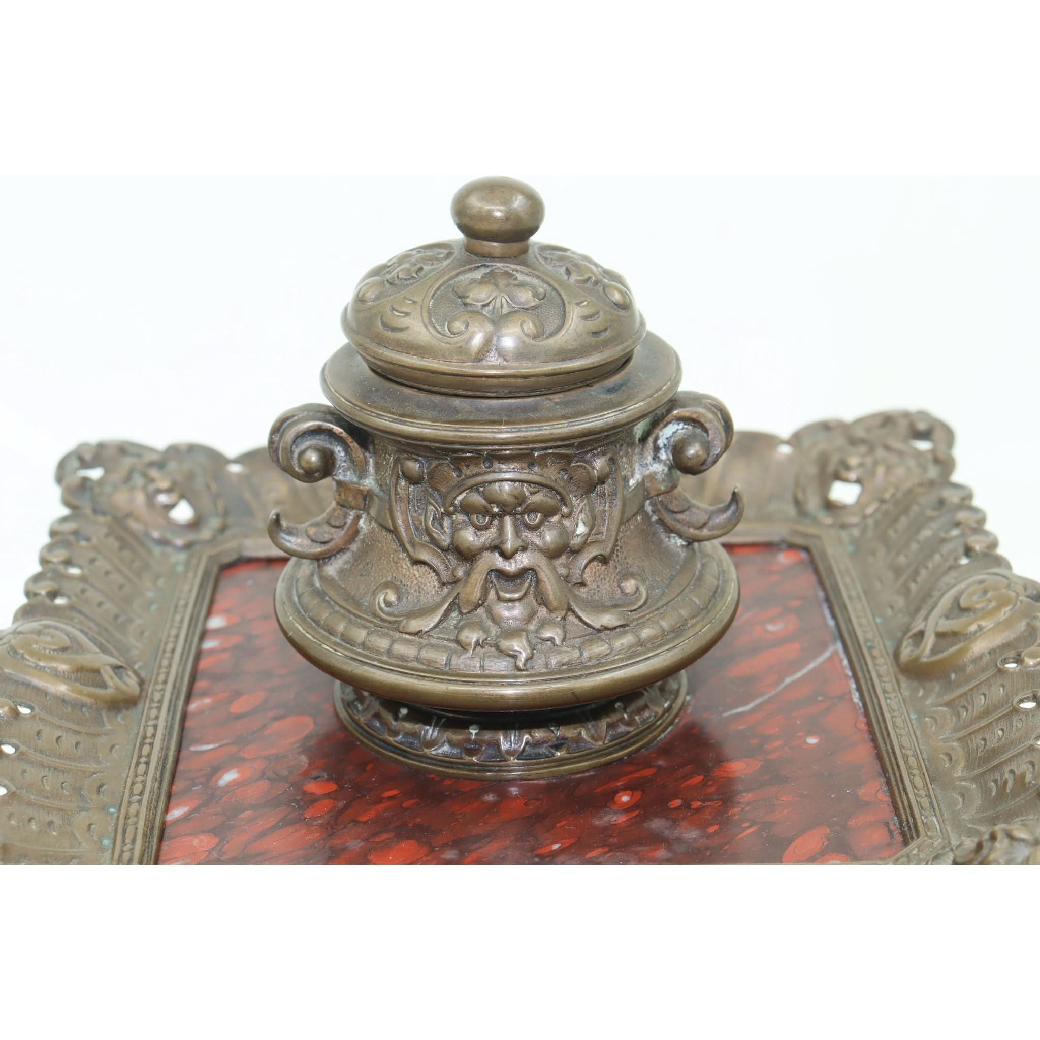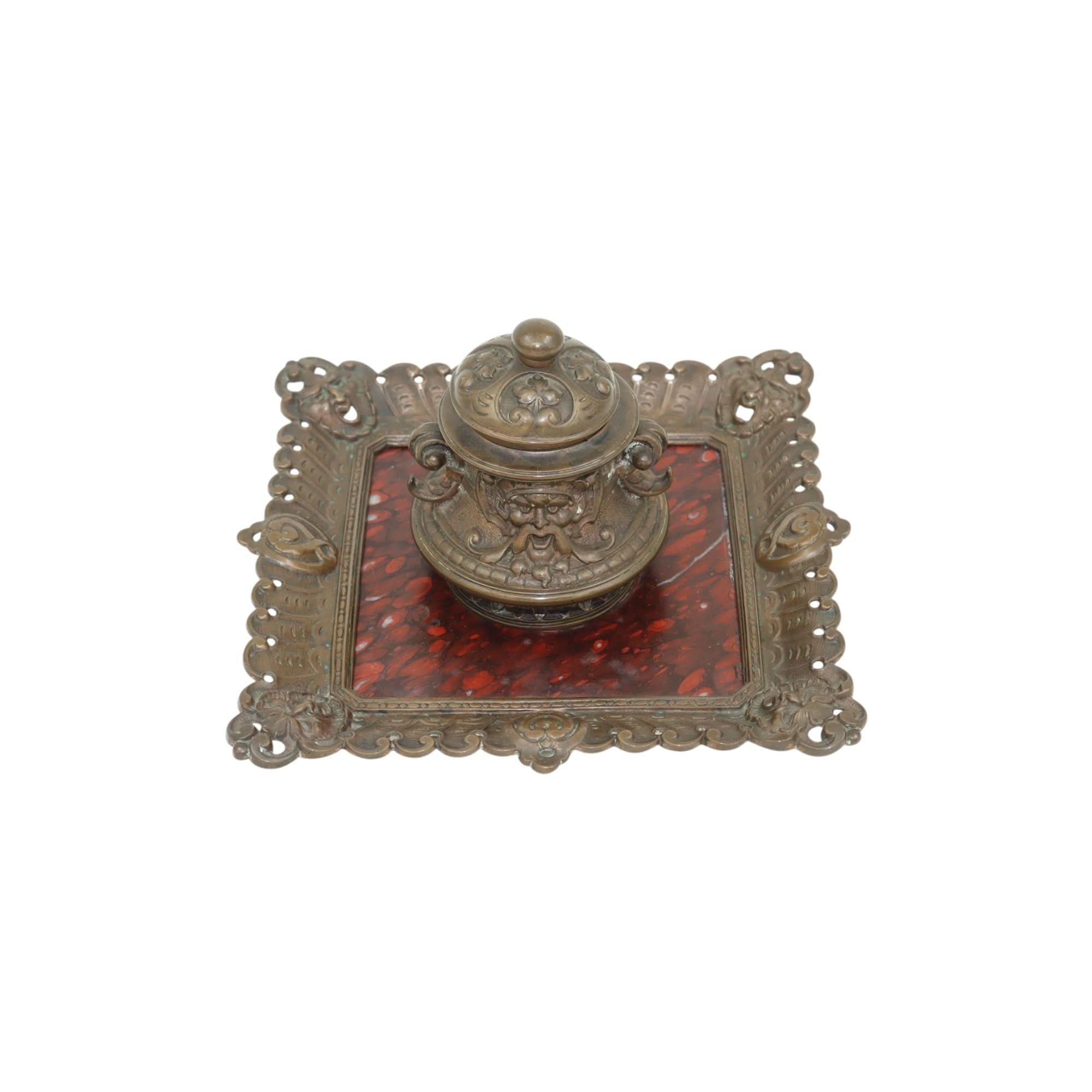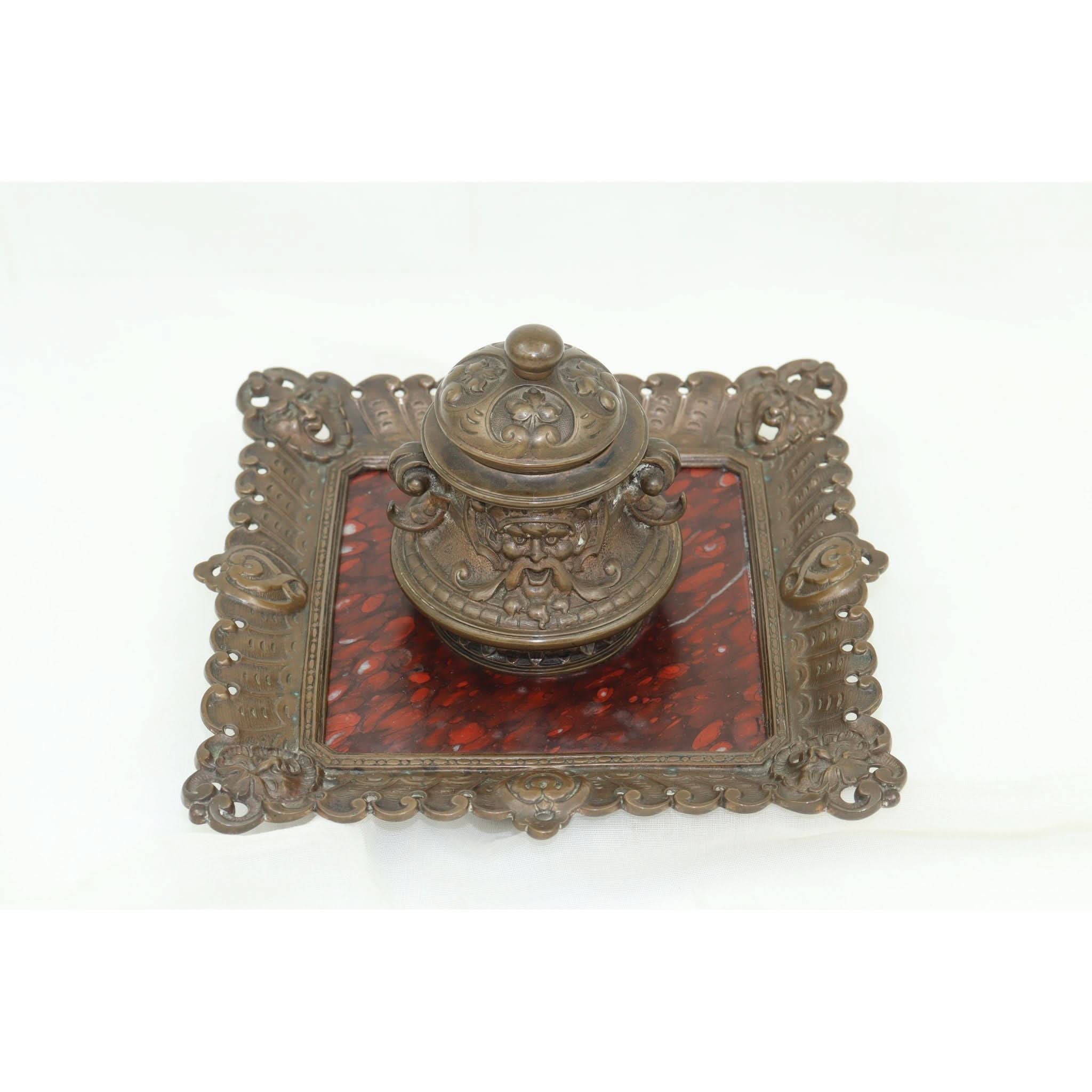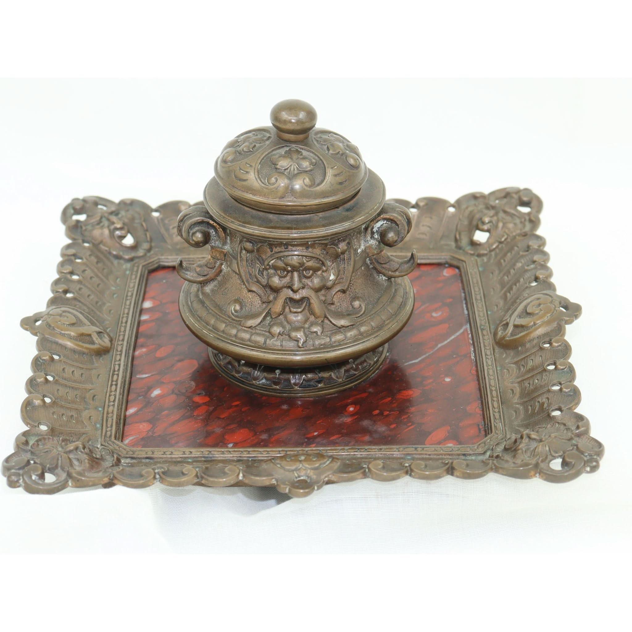 This good quality and inticately cast bronze ink stand sits in a tray featuring a rouge marble insert. It is by Ernst Zimmermann of Hanau, with Zimmermann's foundry mark showing the latin motto "Carpe Diem" inside a six spoked wheel, together with a square, dividers and two mallets. To the front and rear of the lidded inkwell are depictions of a "Green Man" type mythical creature, which is echoed in similar masks in each corner of the tray. The stand measures 200 mm (8 inches) square, stands 115 mm (4.5 inches) high, and weighs 1.8 kg (4 pounds). It is missing the insert to hold the ink and the hinge for the lid is a bit loose, but overall it is in very good condition. It would date from the last quarter of the nineteenth century.