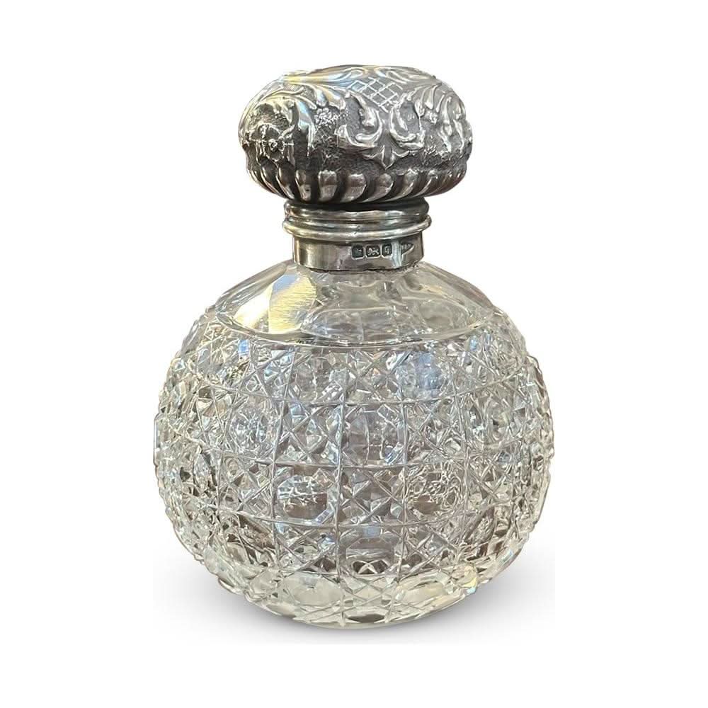 A beautiful crystal perfume bottle with hallmarks to the sterling silver lid. Crafted in Birmingham in 1909.