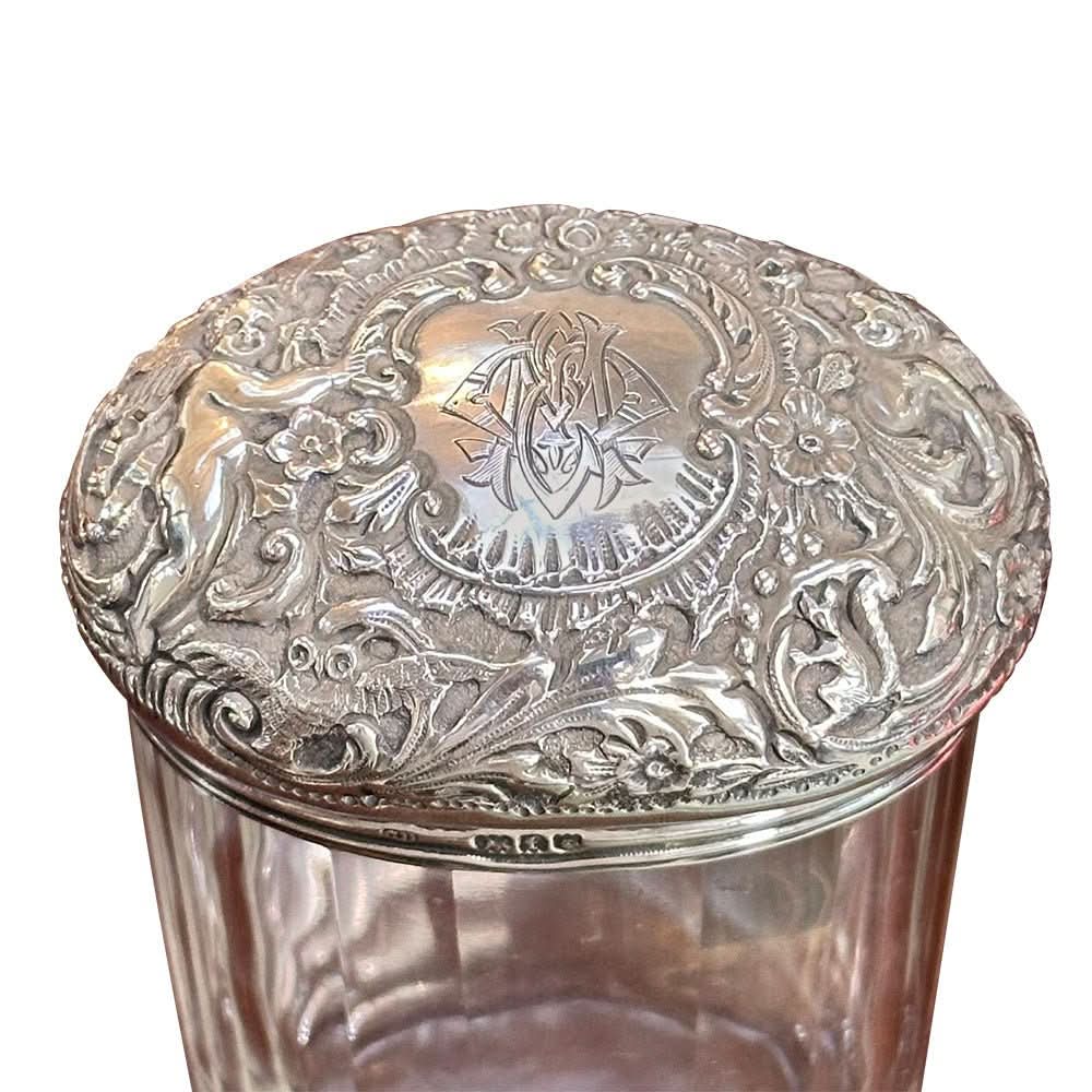 A lovely oval shaped crystal and sterling silver toiletry bottle from London, 1901. Hallmarked.