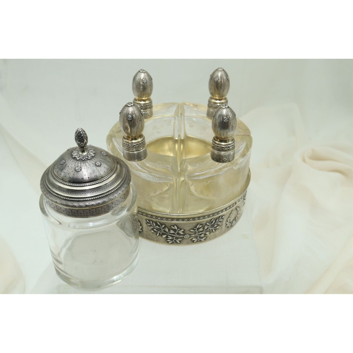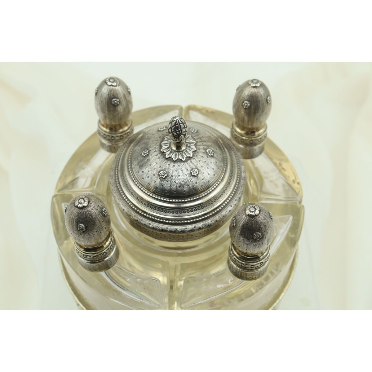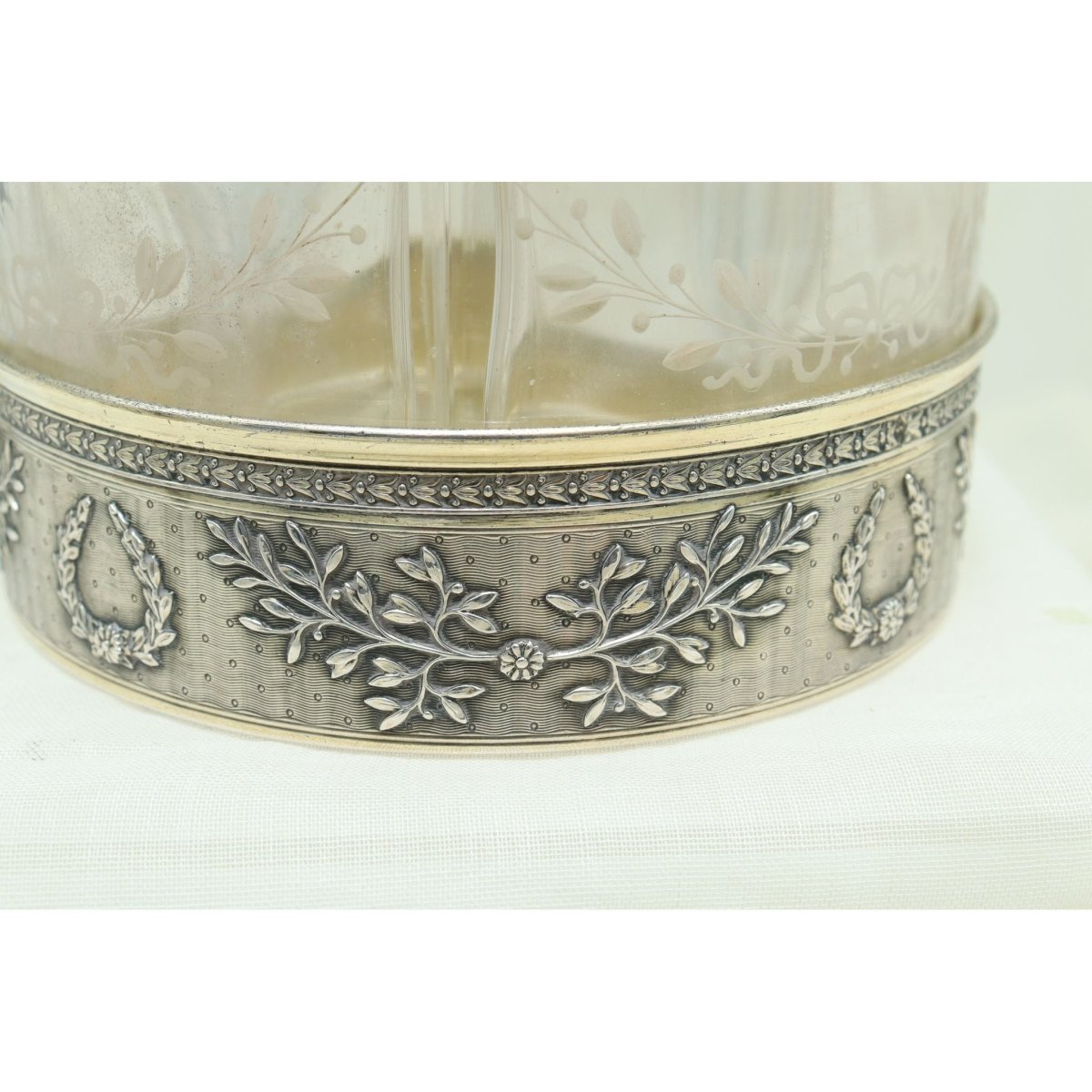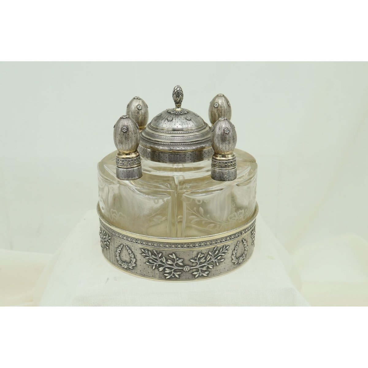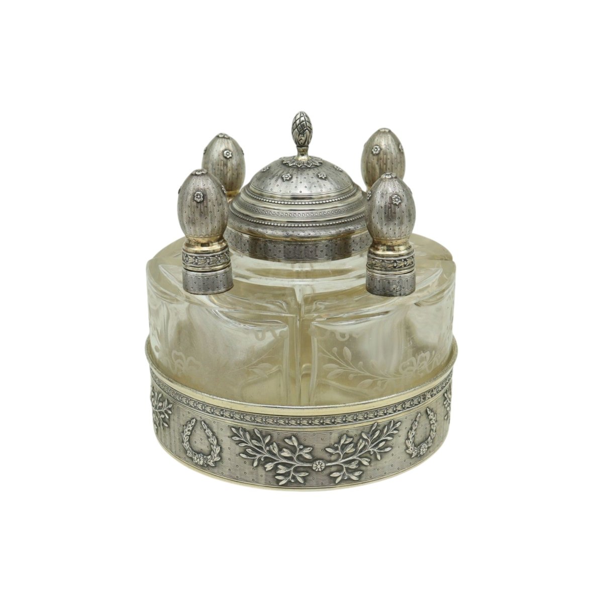 This delightful French scent bottle or dressing table stand was made by Antony Salomon in Paris in around 1905. It comprises four etched quarter circle scent bottles with silver gilt collars and tops. They are arranged around a central powder bottle with a silver gilt collar and domed lid topped with an acorn like finial. These are housed in a round silver gilt stand. All the silverwork features a wavy engine turned pattern enhanced with punched stippling and applied silver mounts. Salomon has applied his own stamp to the piece and there are several French control marks featuring the head of Minerva which indicates the silver is of .950 quality which is slightly higher than the English sterling silver standard. Each of the bottles has an engraved ribbon and leaf motif to the outside, with stylised flowers to the shoulders. The piece is 123 mm (4 7/8ths inches) in diameter and stands 130 mm (5 1/8th inches) high. There is some minor damage to three of the bottles. One has a chip to the base, one chips to the side, corner and shoulder and the third has a very minor chip to the shoulder.