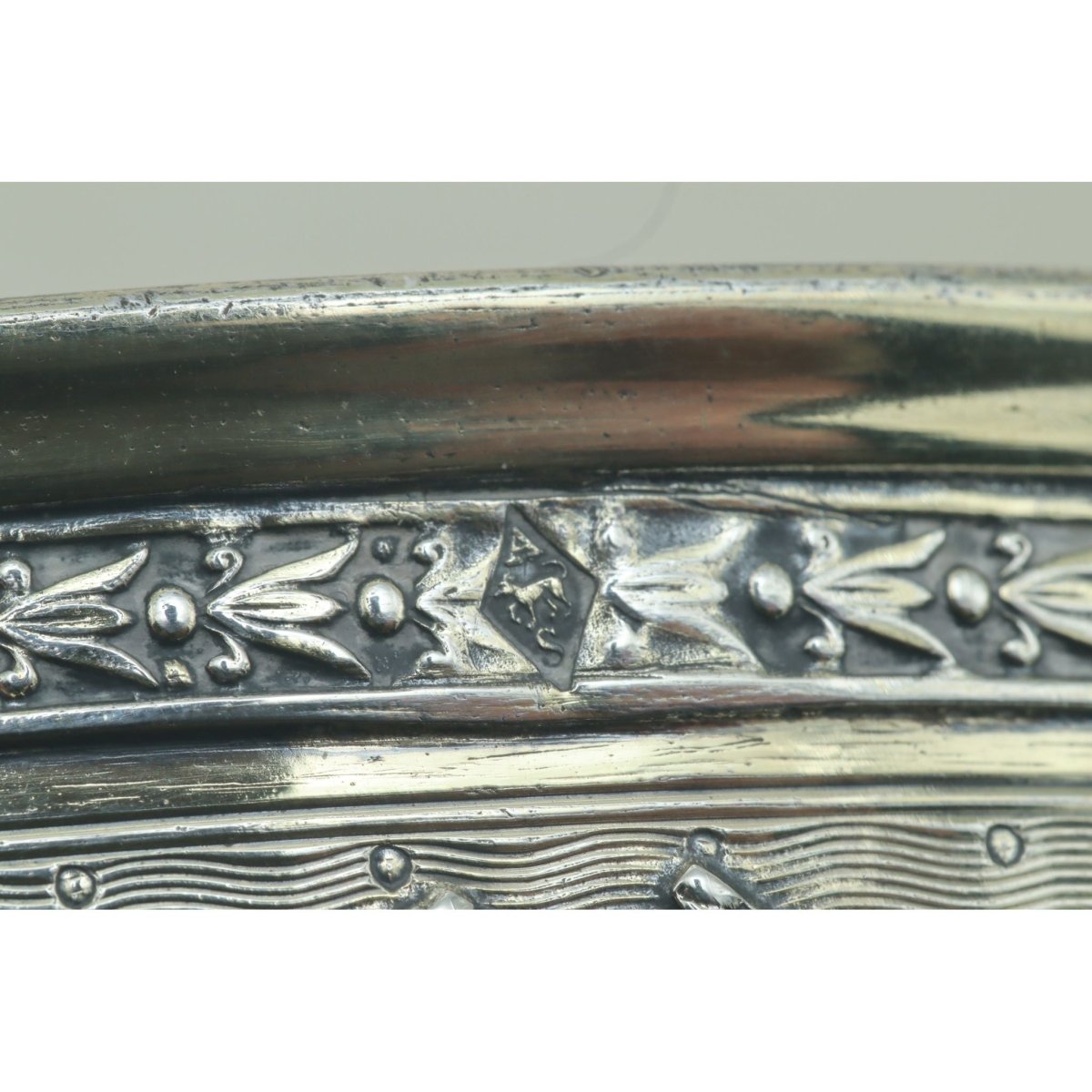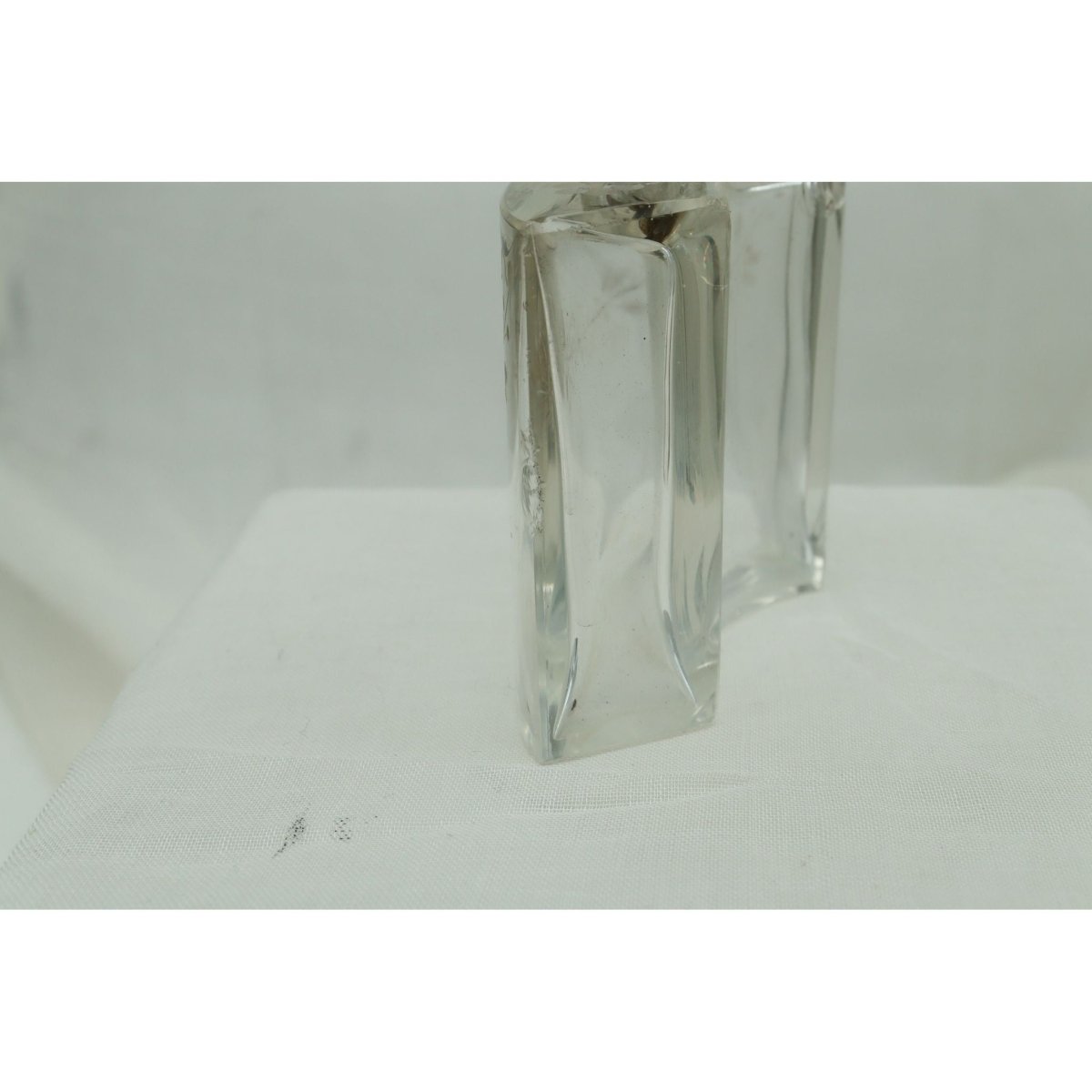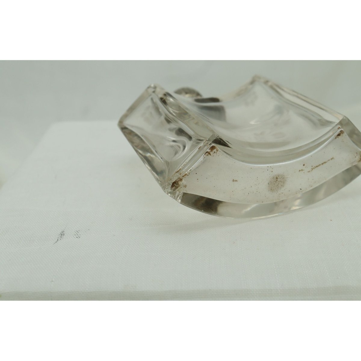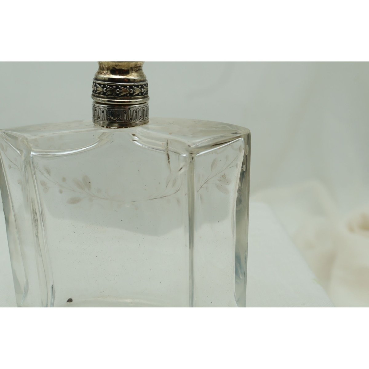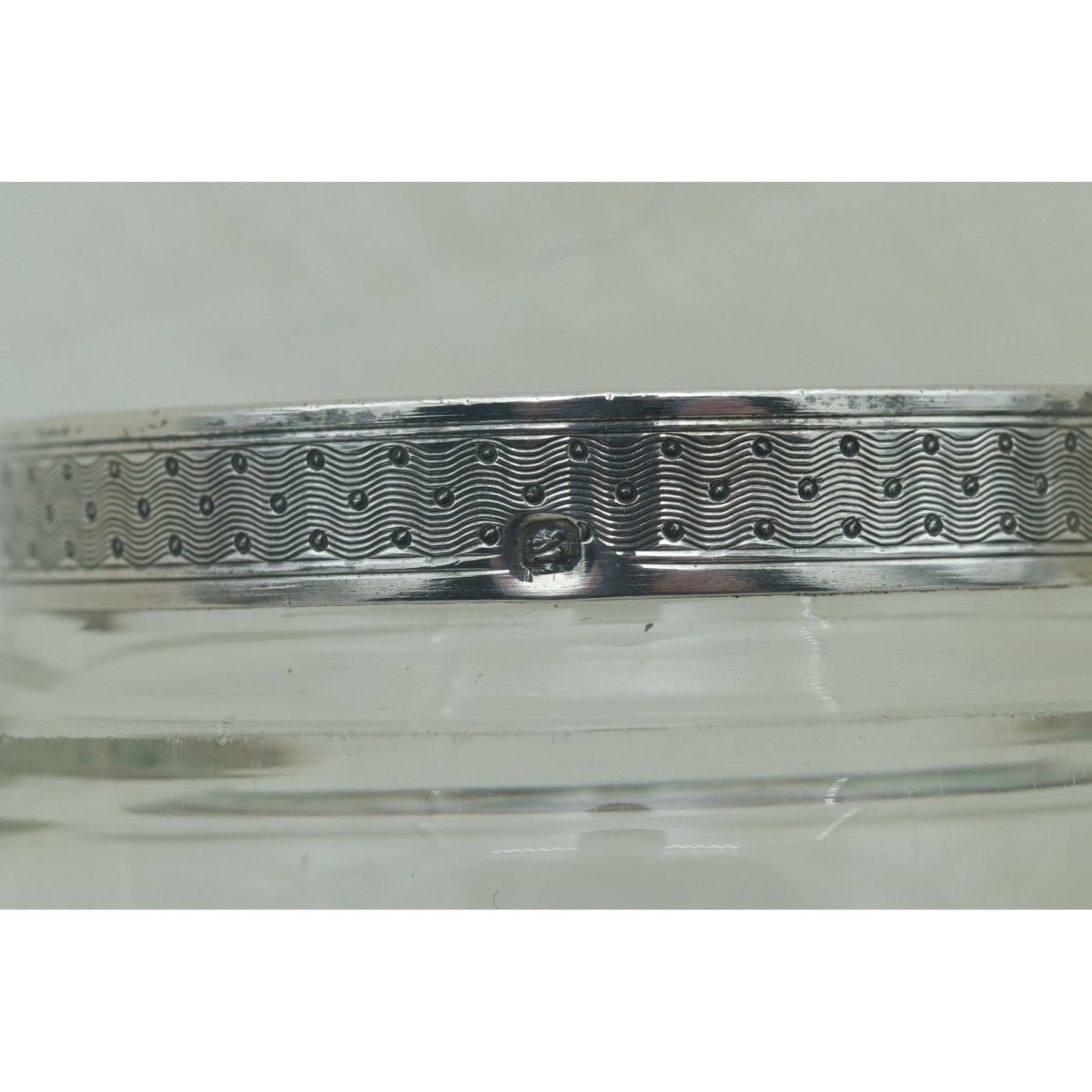 This delightful French scent bottle or dressing table stand was made by Antony Salomon in Paris in around 1905. It comprises four etched quarter circle scent bottles with silver gilt collars and tops. They are arranged around a central powder bottle with a silver gilt collar and domed lid topped with an acorn like finial. These are housed in a round silver gilt stand. All the silverwork features a wavy engine turned pattern enhanced with punched stippling and applied silver mounts. Salomon has applied his own stamp to the piece and there are several French control marks featuring the head of Minerva which indicates the silver is of .950 quality which is slightly higher than the English sterling silver standard. Each of the bottles has an engraved ribbon and leaf motif to the outside, with stylised flowers to the shoulders. The piece is 123 mm (4 7/8ths inches) in diameter and stands 130 mm (5 1/8th inches) high. There is some minor damage to three of the bottles. One has a chip to the base, one chips to the side, corner and shoulder and the third has a very minor chip to the shoulder.