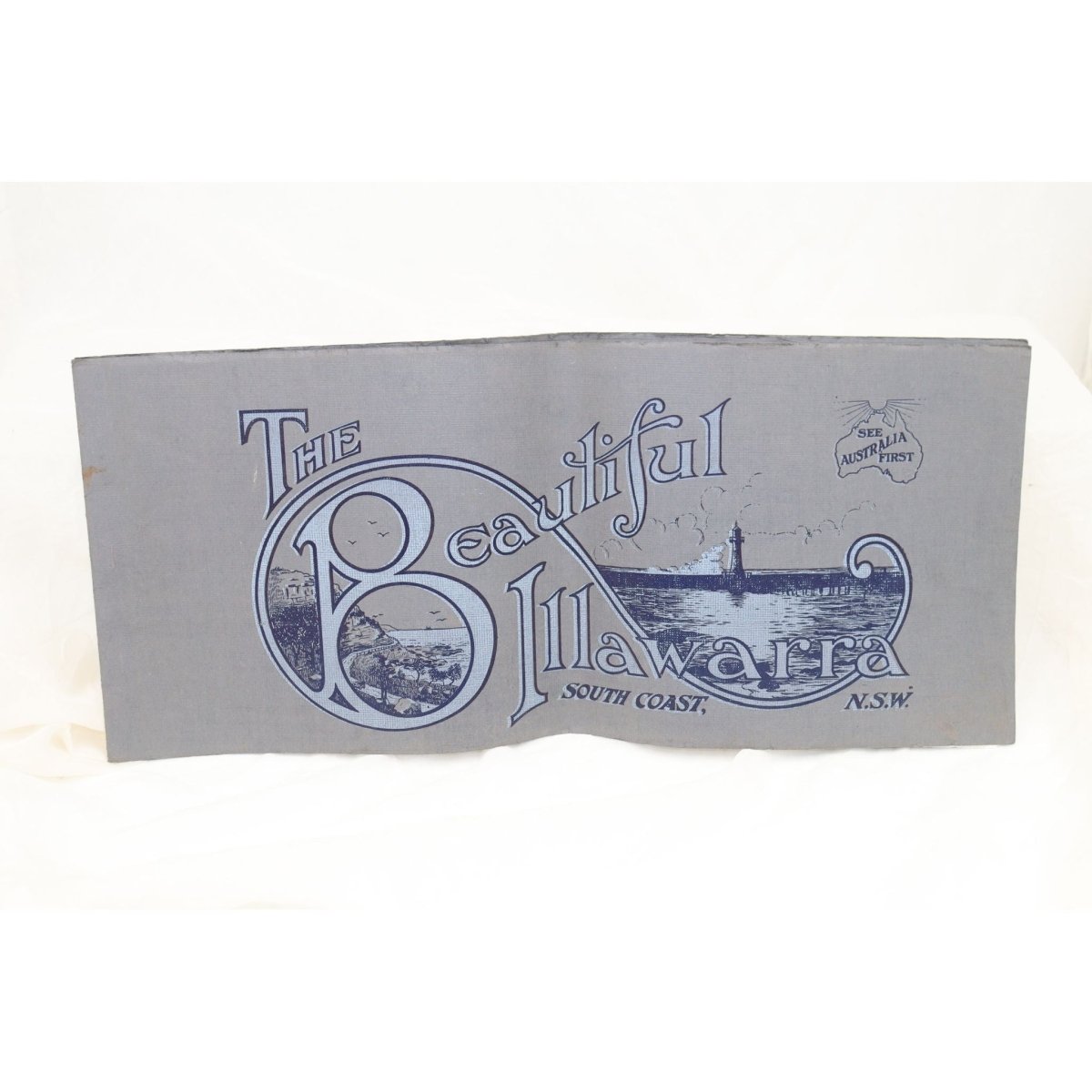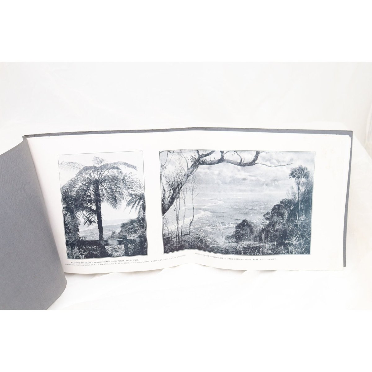 This late 1920's souvenir photo album of the Illawarra was printed by the photographer, printer and publisher, H Phillips of 99 Victoria Ave., Willoughby, NSW and contains 24 pages of black and white photos of the Illawarra coast and hinterland. It is 520 mm wide and 230 mm high, and is in very good condition.