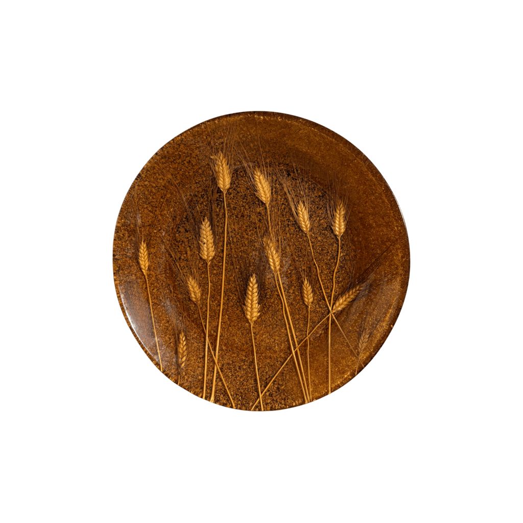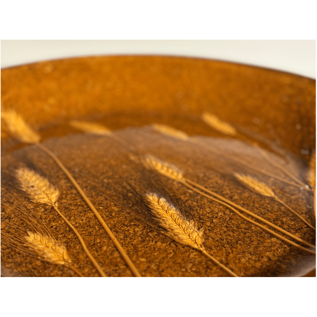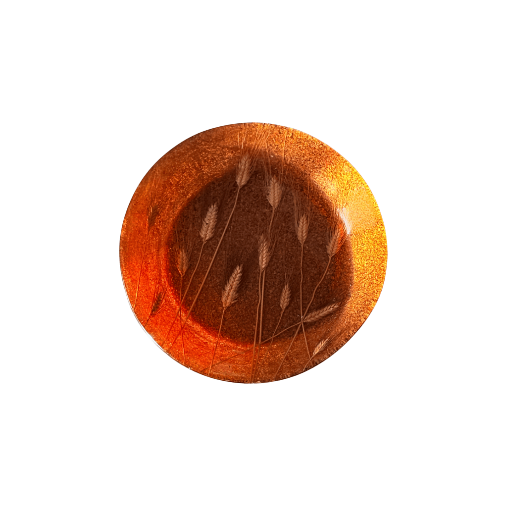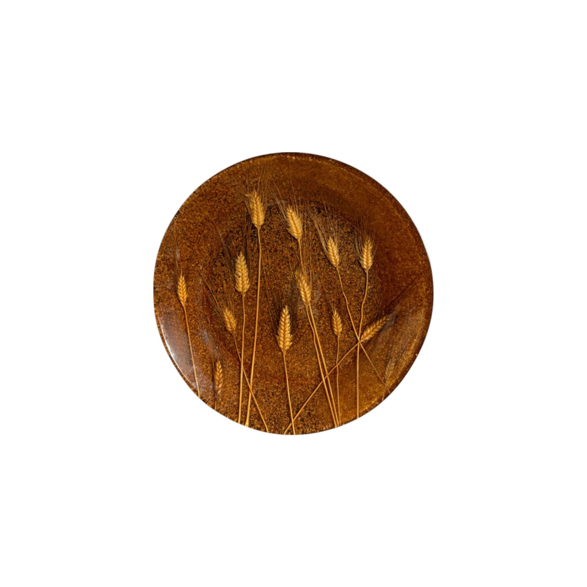 A striking example of 1970s Italian design, this shallow circular platter is crafted from a rich, toffee-hued acrylic embedded with natural wheat straw stems. The stippled, autumnal ground adds depth with its organic effect that varies with the light.