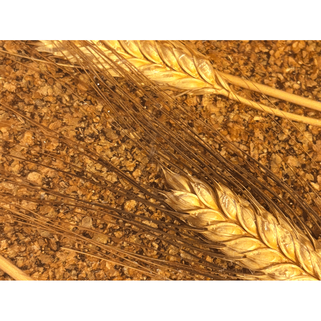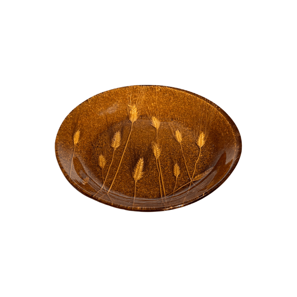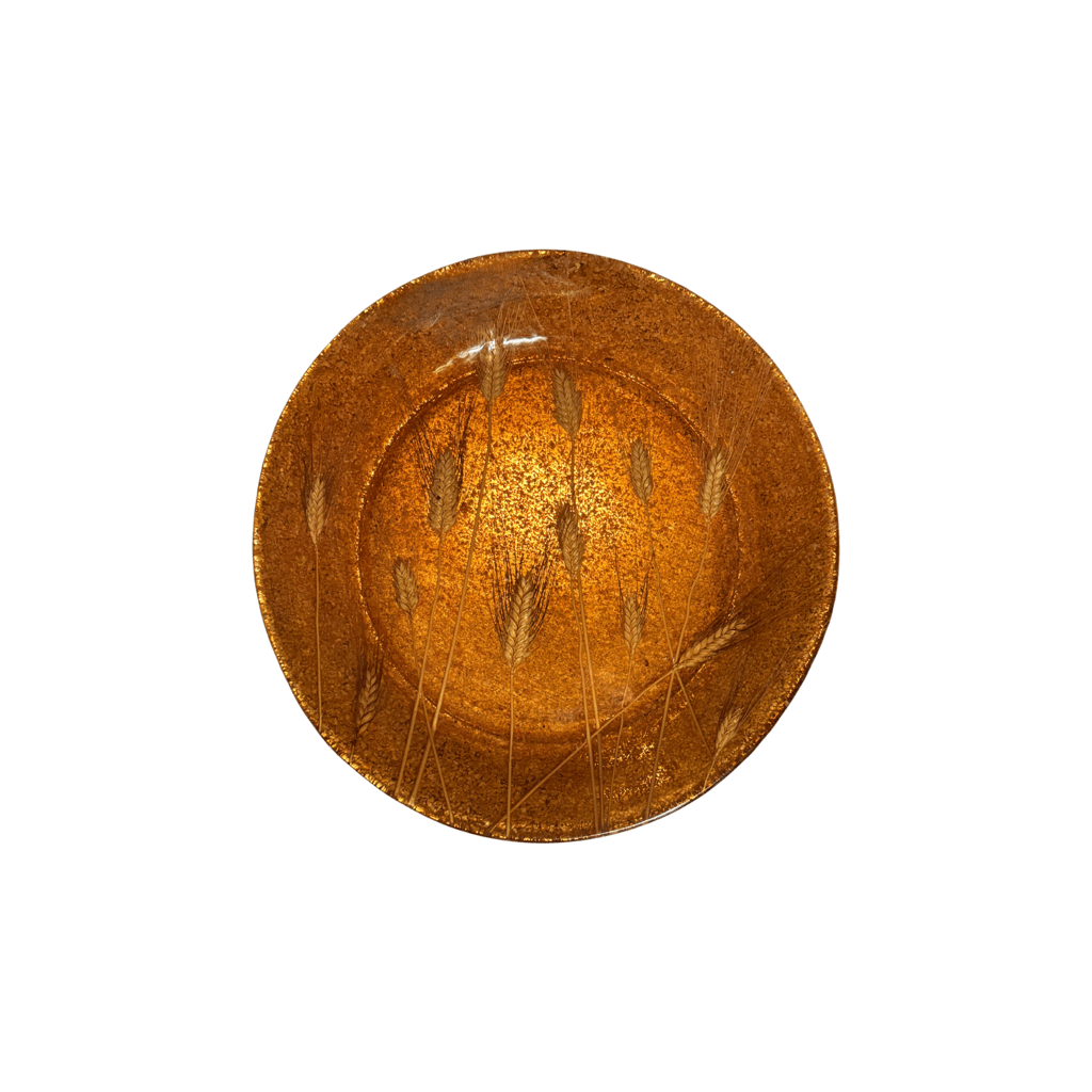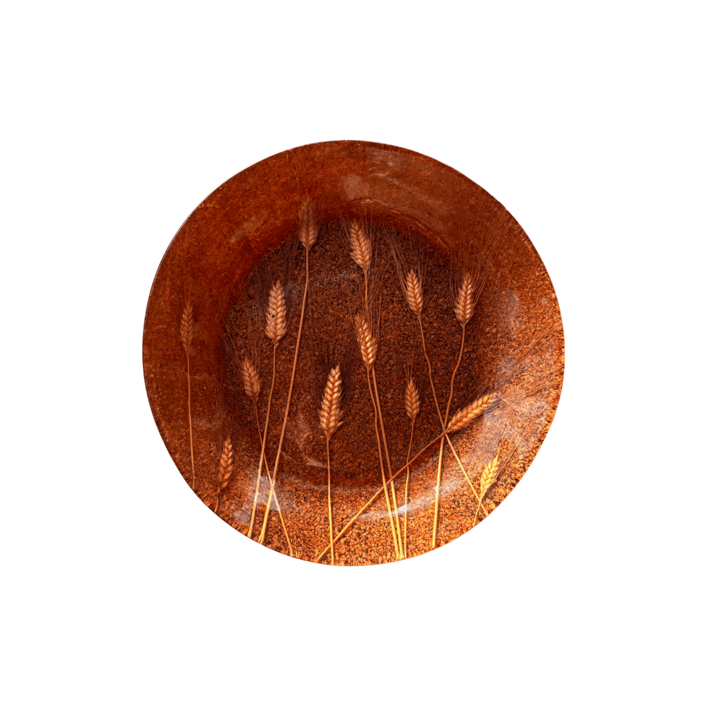 A striking example of 1970s Italian design, this shallow circular platter is crafted from a rich, toffee-hued acrylic embedded with natural wheat straw stems. The stippled, autumnal ground adds depth with its organic effect that varies with the light.