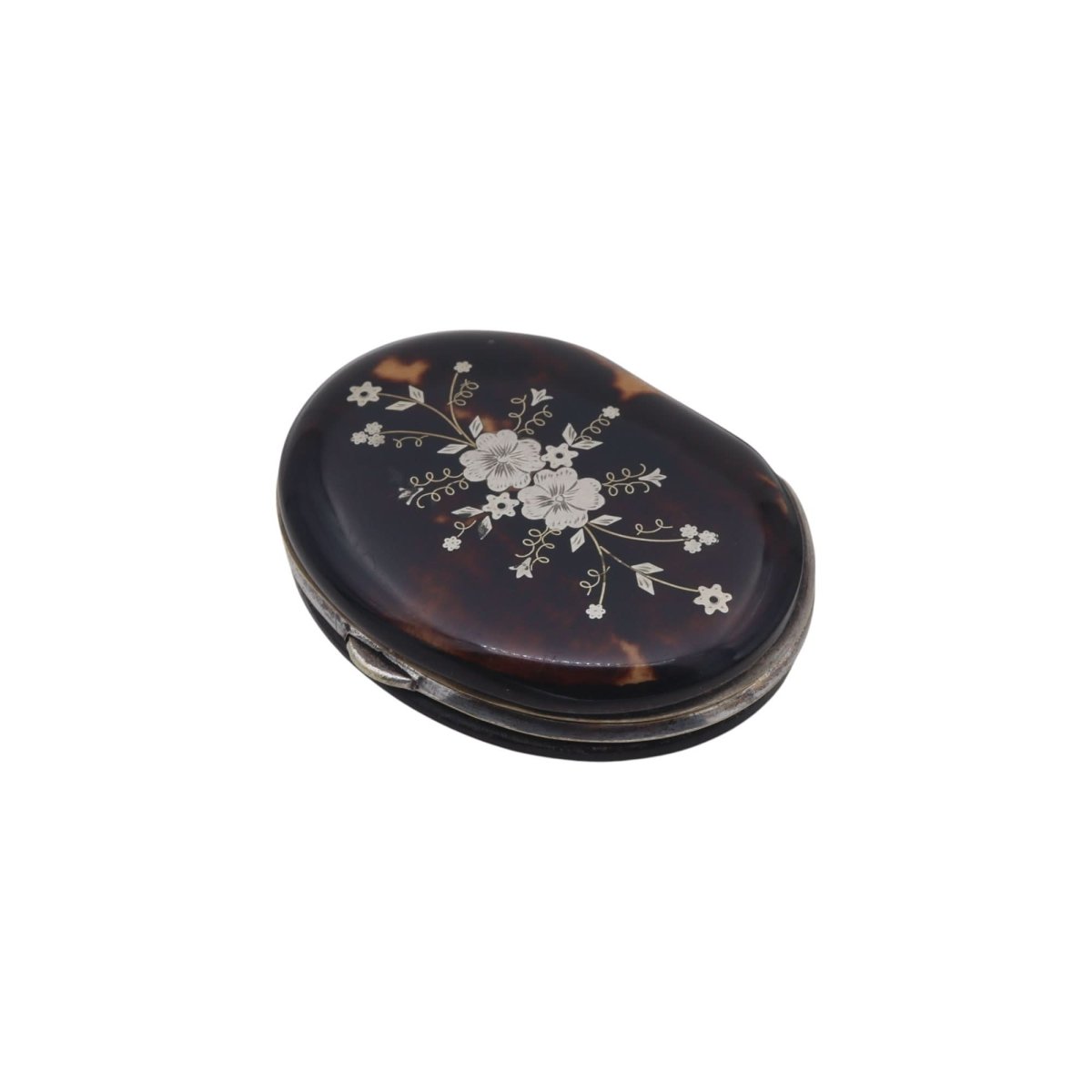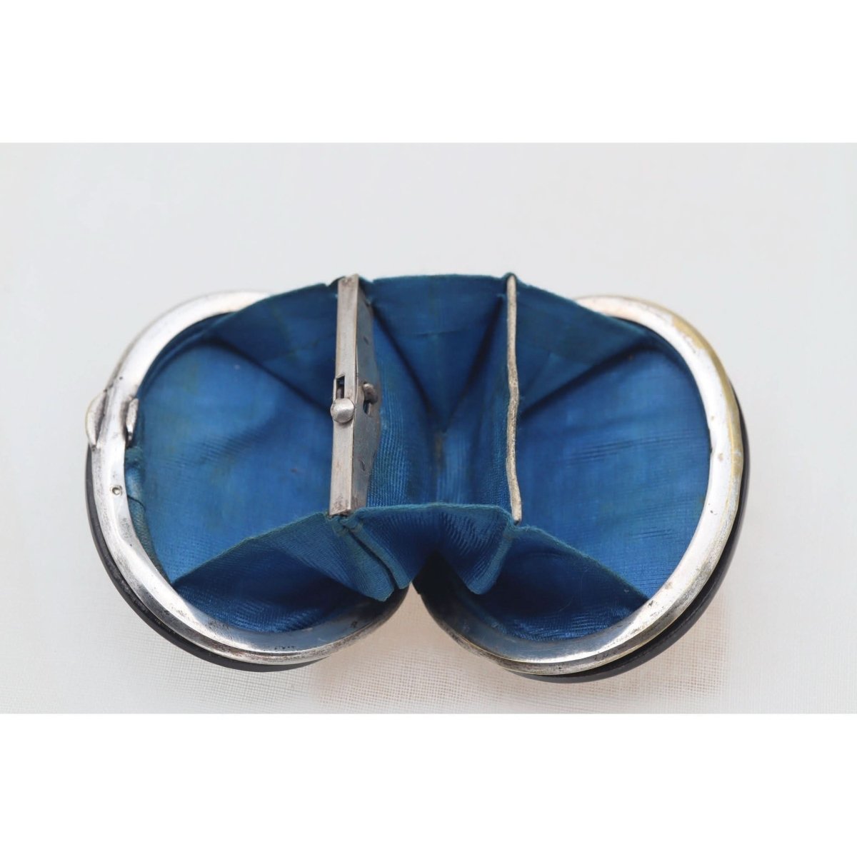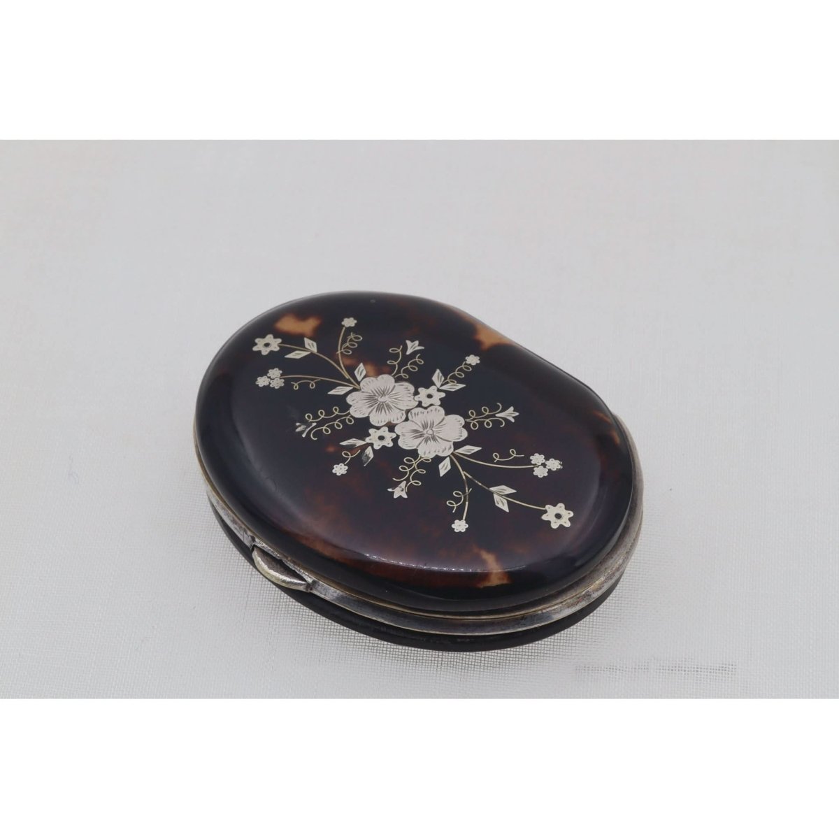 This pretty ladies tortoiseshell coin purse has the front decorated with an inlaid spray of silver flowers. This one is of good quality and well designed. Normally the tortoiseshell is attached to the silver plated frame, but in this case the tortoiseshell outer is attached by a strong and flexible gusset which allows a degree of expansion so as not to crack the shell if the purse is overloaded. The interior is lined with a blue watered or moire silk and features four compartments for coins or notes. one of which closes with a simple locking mechanism. It measures 70 mm (2.75 inches) long, 50 mm ( 2 inches) wide and 20 mm (.75 of an inch) thick. Overall it is in very good condition, but there is some slight loss of the silver to the frame. C 1865.