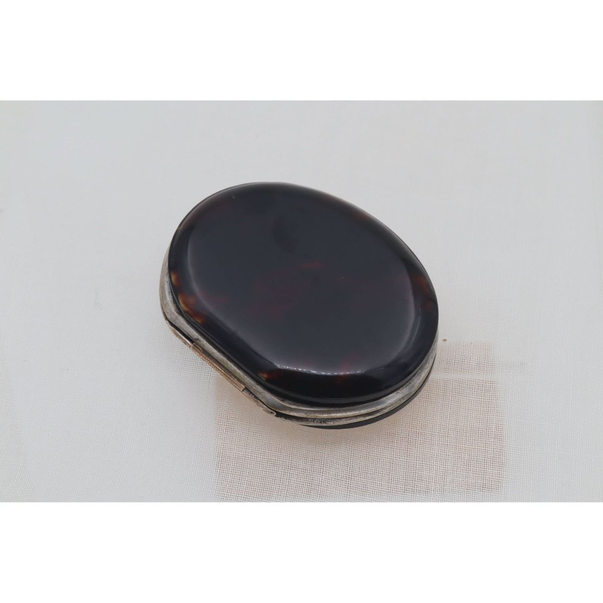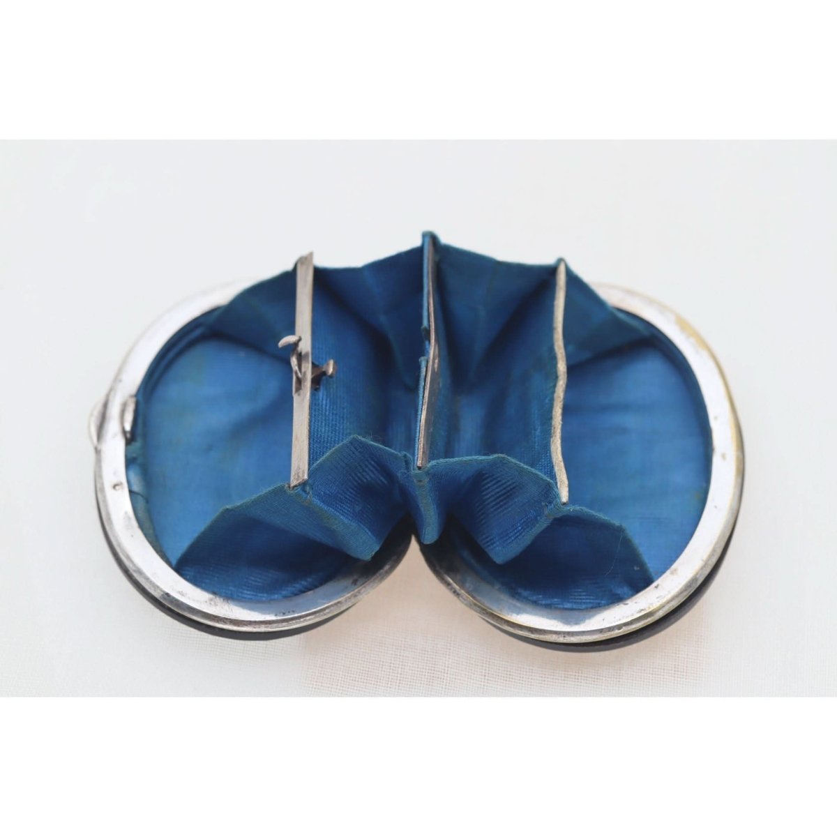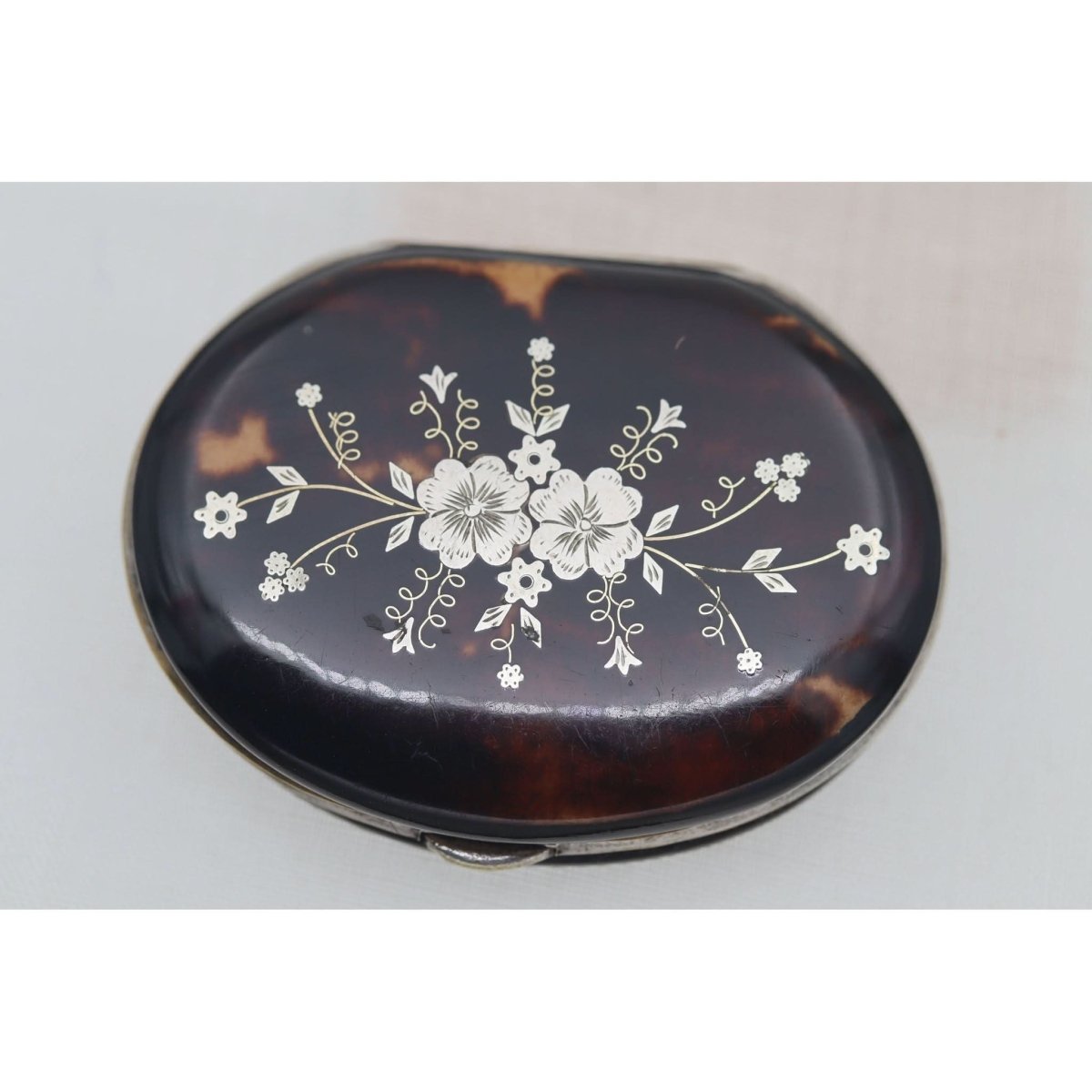 This pretty ladies tortoiseshell coin purse has the front decorated with an inlaid spray of silver flowers. This one is of good quality and well designed. Normally the tortoiseshell is attached to the silver plated frame, but in this case the tortoiseshell outer is attached by a strong and flexible gusset which allows a degree of expansion so as not to crack the shell if the purse is overloaded. The interior is lined with a blue watered or moire silk and features four compartments for coins or notes. one of which closes with a simple locking mechanism. It measures 70 mm (2.75 inches) long, 50 mm ( 2 inches) wide and 20 mm (.75 of an inch) thick. Overall it is in very good condition, but there is some slight loss of the silver to the frame. C 1865.