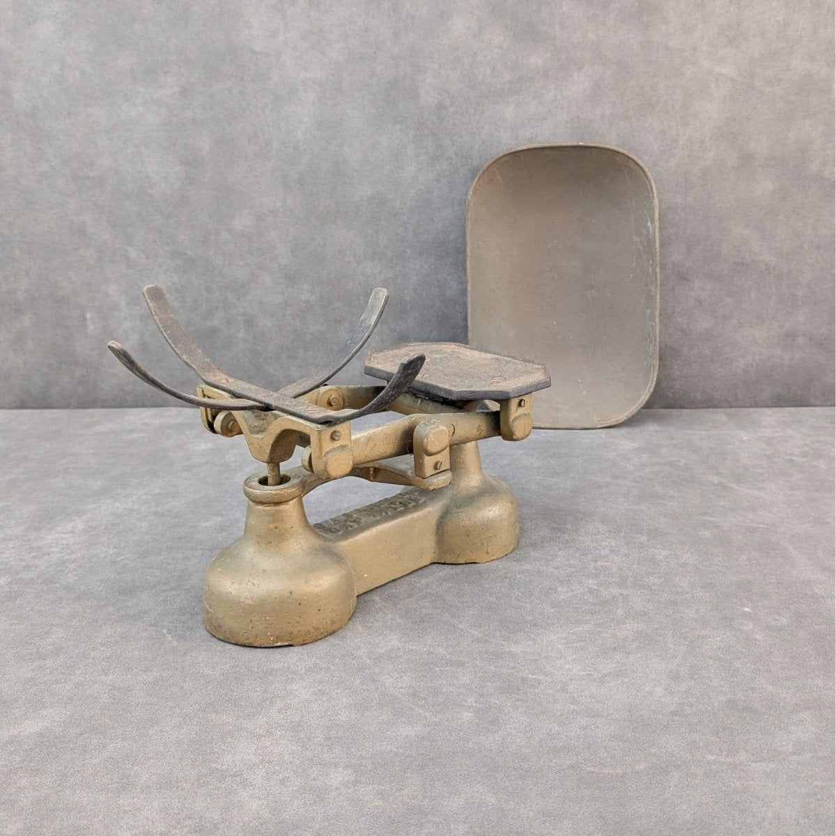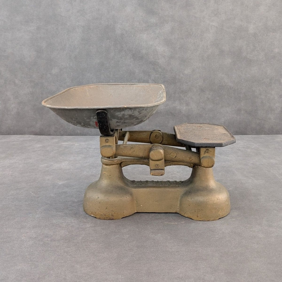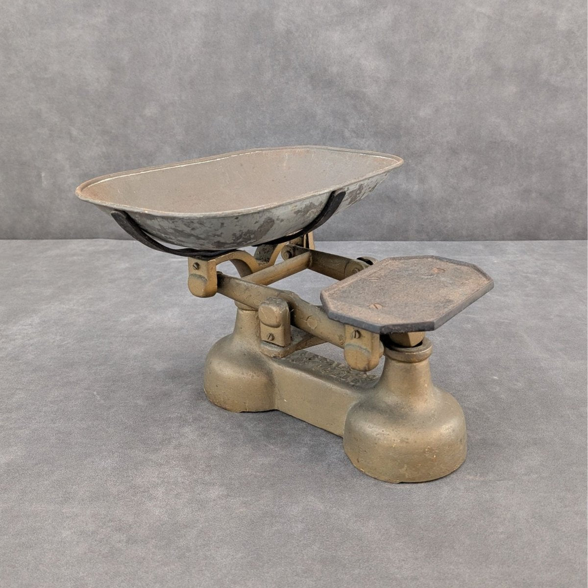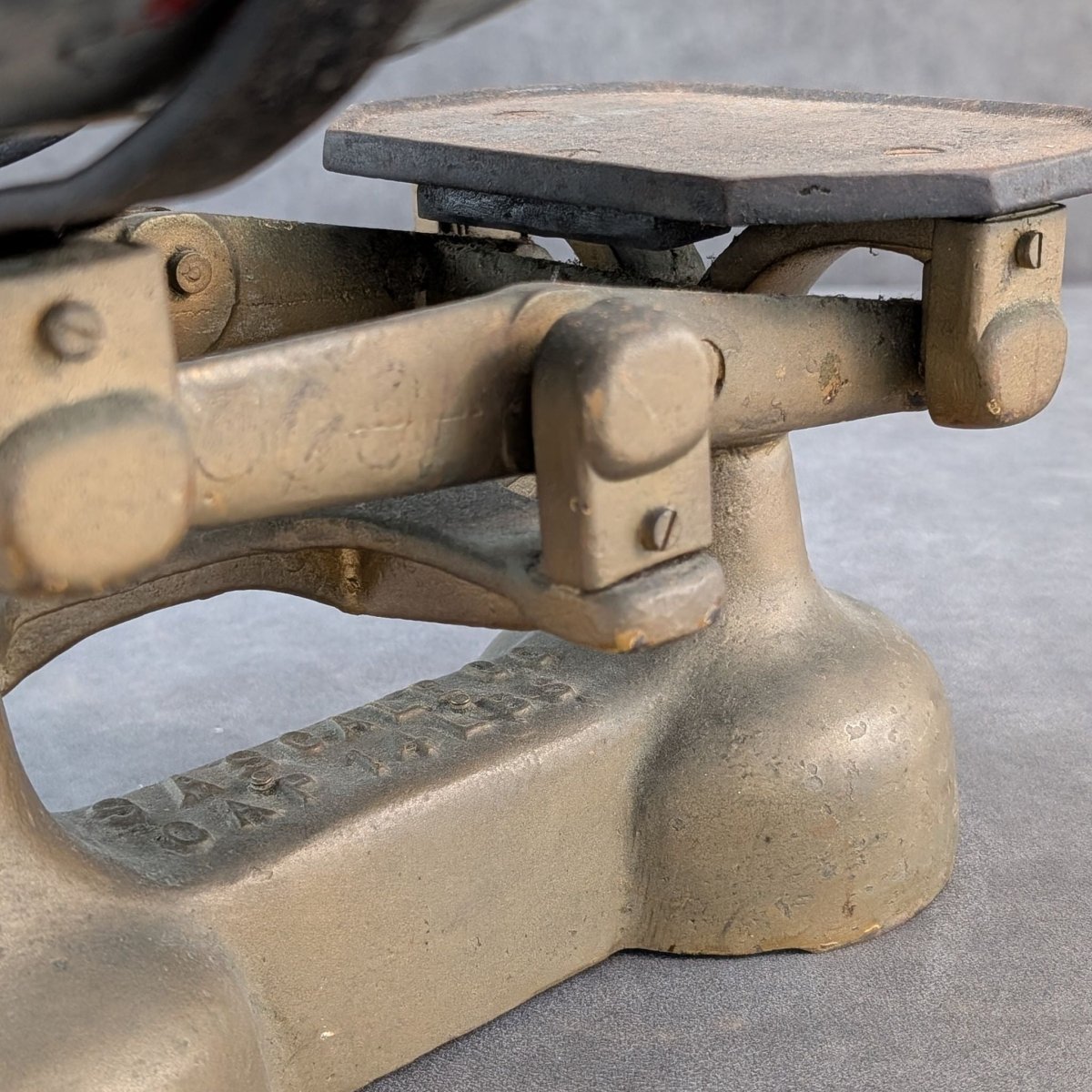 Weight and presence in a single object. Made by SA Scale Co these early twentieth century scales were built for accuracy and daily use holding their place on a counter with calm authority. Cast in brass with a deep mottled patina they carry the character of years in service. The branding CAP 14LBS remains clear across the beam a reminder of the work they once performed. An object that brings substance to a room the kind of piece that sits easily in kitchens studios and collector spaces where history matters.