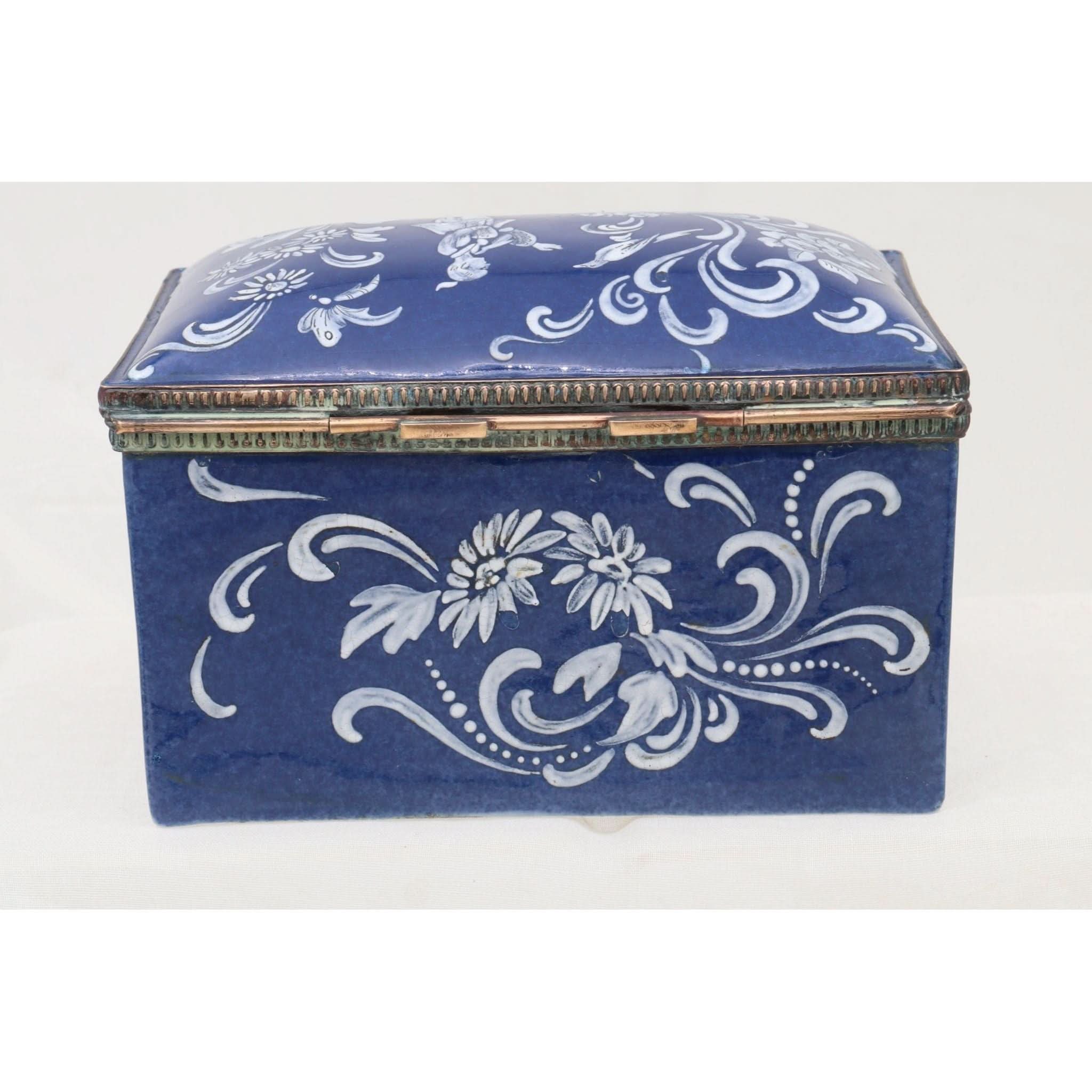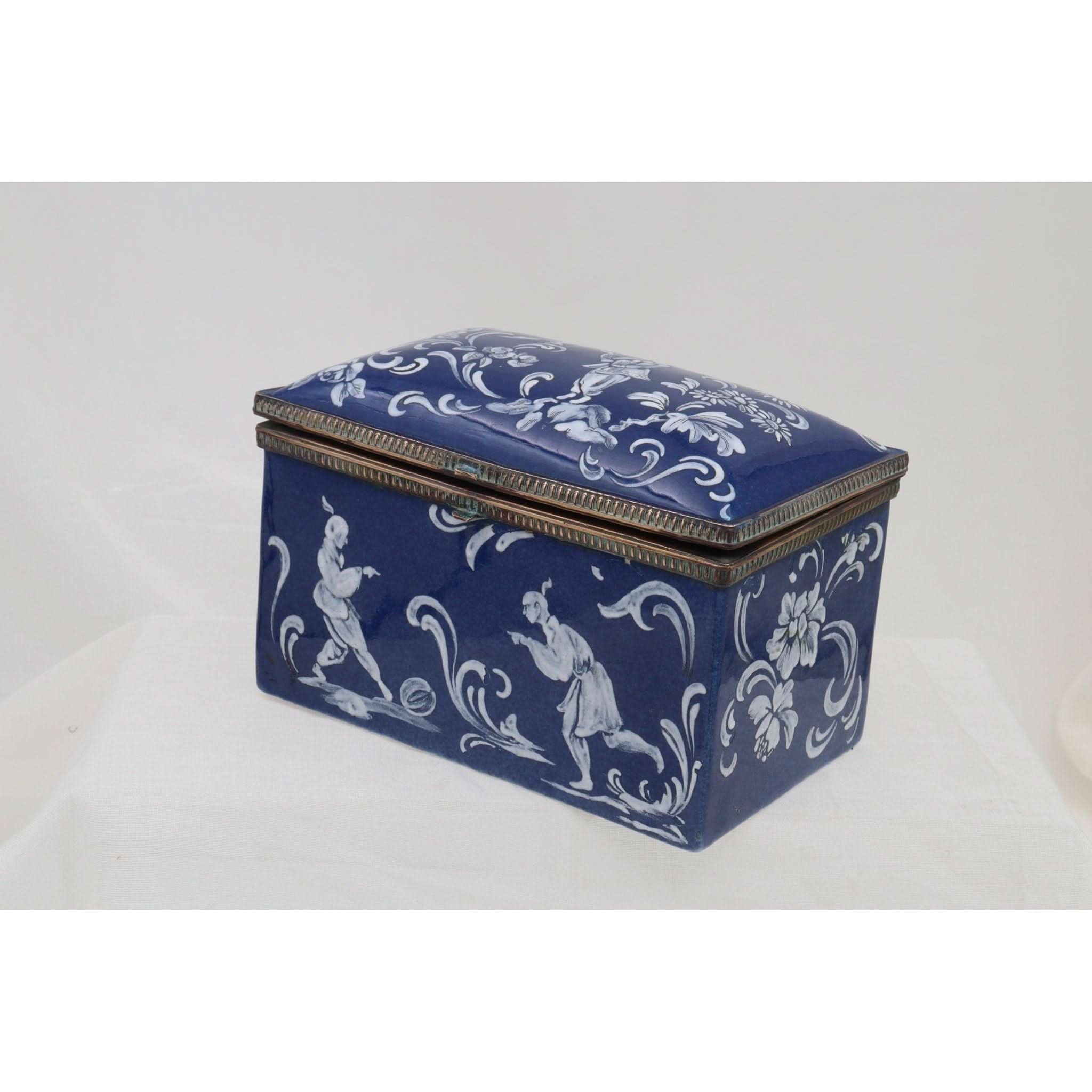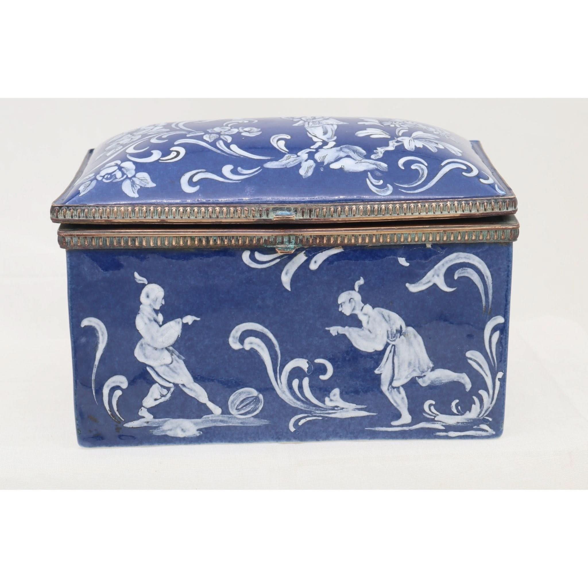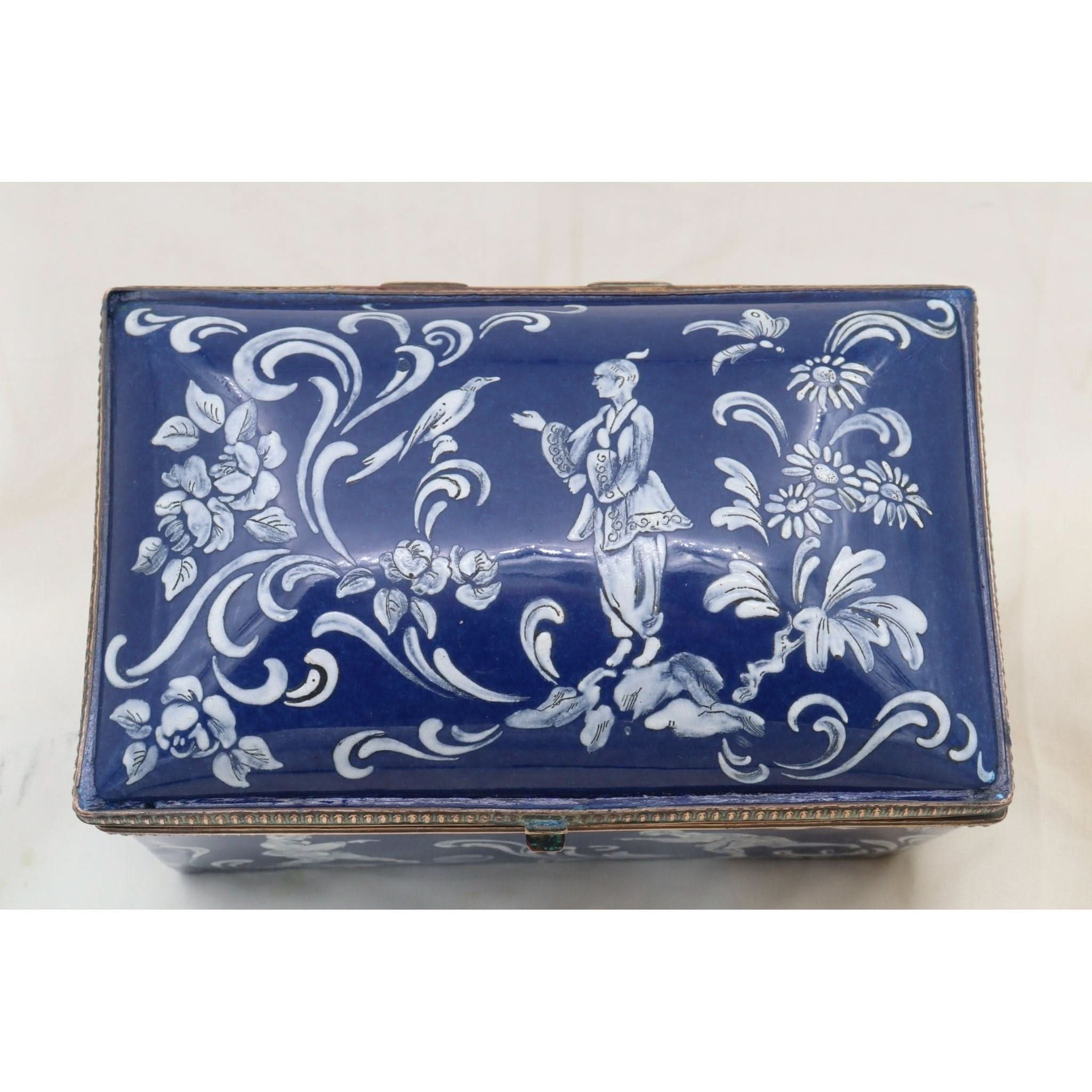 This large enamelled porcelain box by Samson of Paris, is decorated on the lid and front with hand painted Chinoiserie style scenes copying similar English and European depictions of Chinese life from the late 1700's. The two ends, and the back feature hand painted flowers and arabesques, all on a dark blue ground. The inner part of the lid carries a hand gilded spray of flowers. Edme Samson had a porcelain factory which specialised in copies (or fakes if you are feeling less than generous), of items from the previous century. Today his items have become collectable in their own right. It measures 183 mm (7.25 inches) in width, 115 mm (4.5 inches) in depth and stands 121 mm (4.75 inches) high. It has lost a small amount of the white enamel and the clip that held the lid to the body is also missing. It would date from around 1890.
