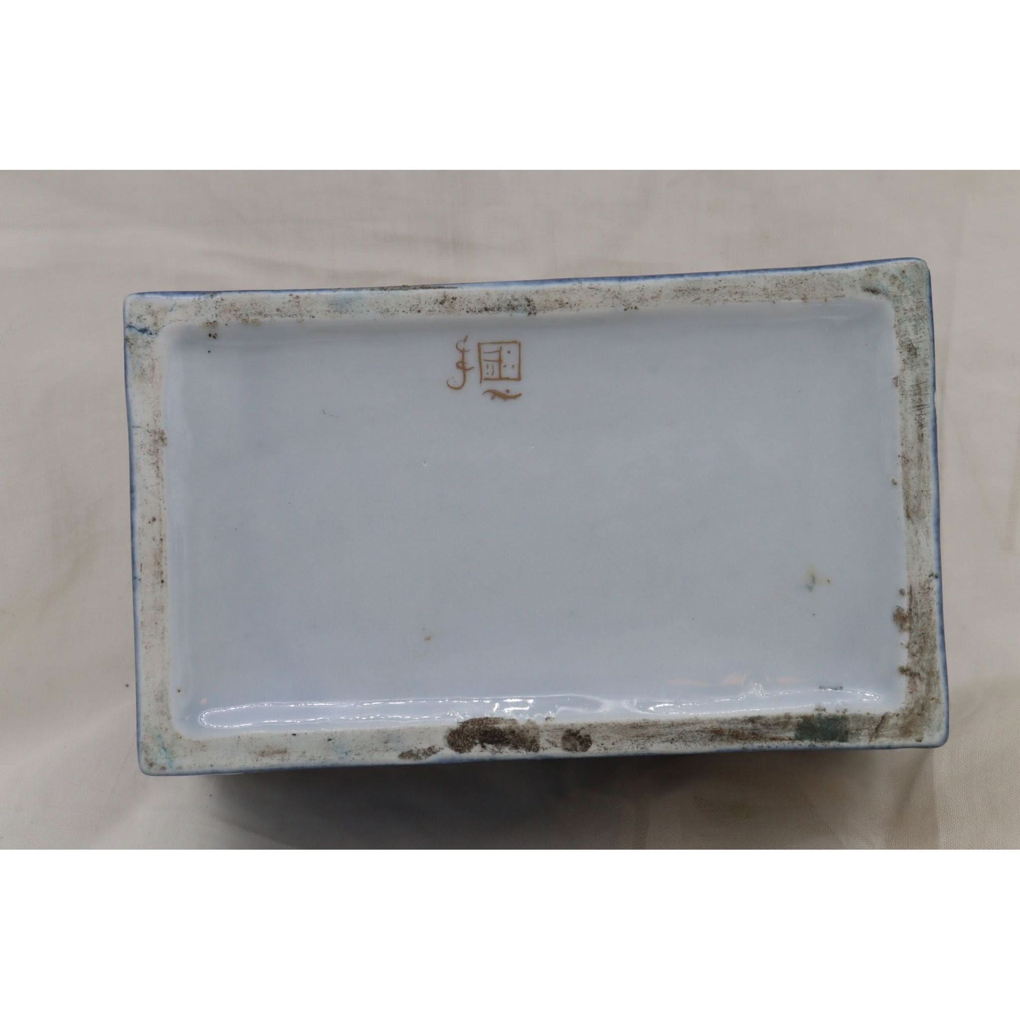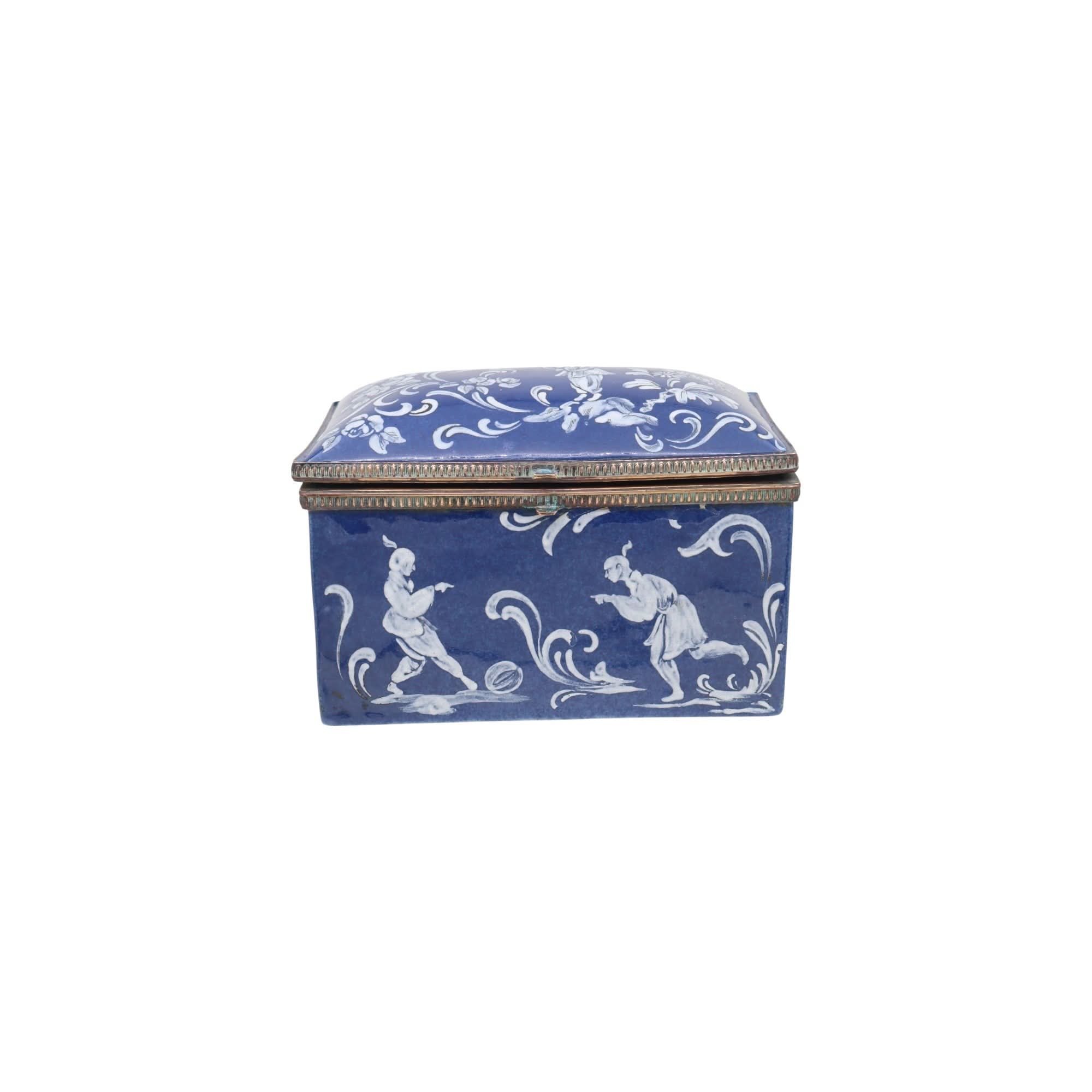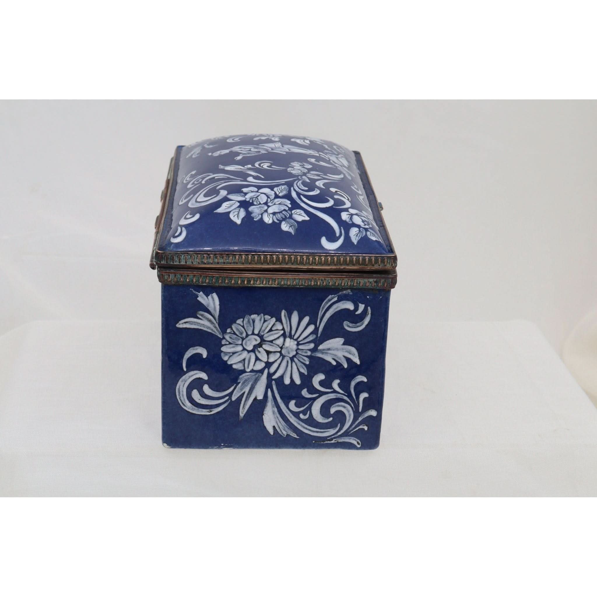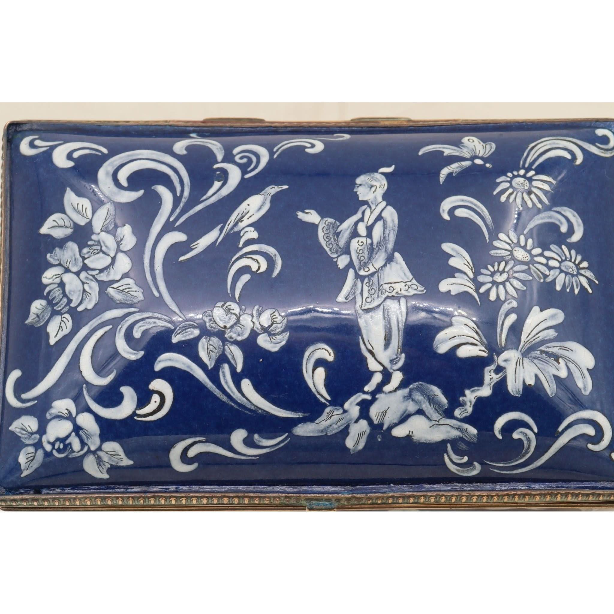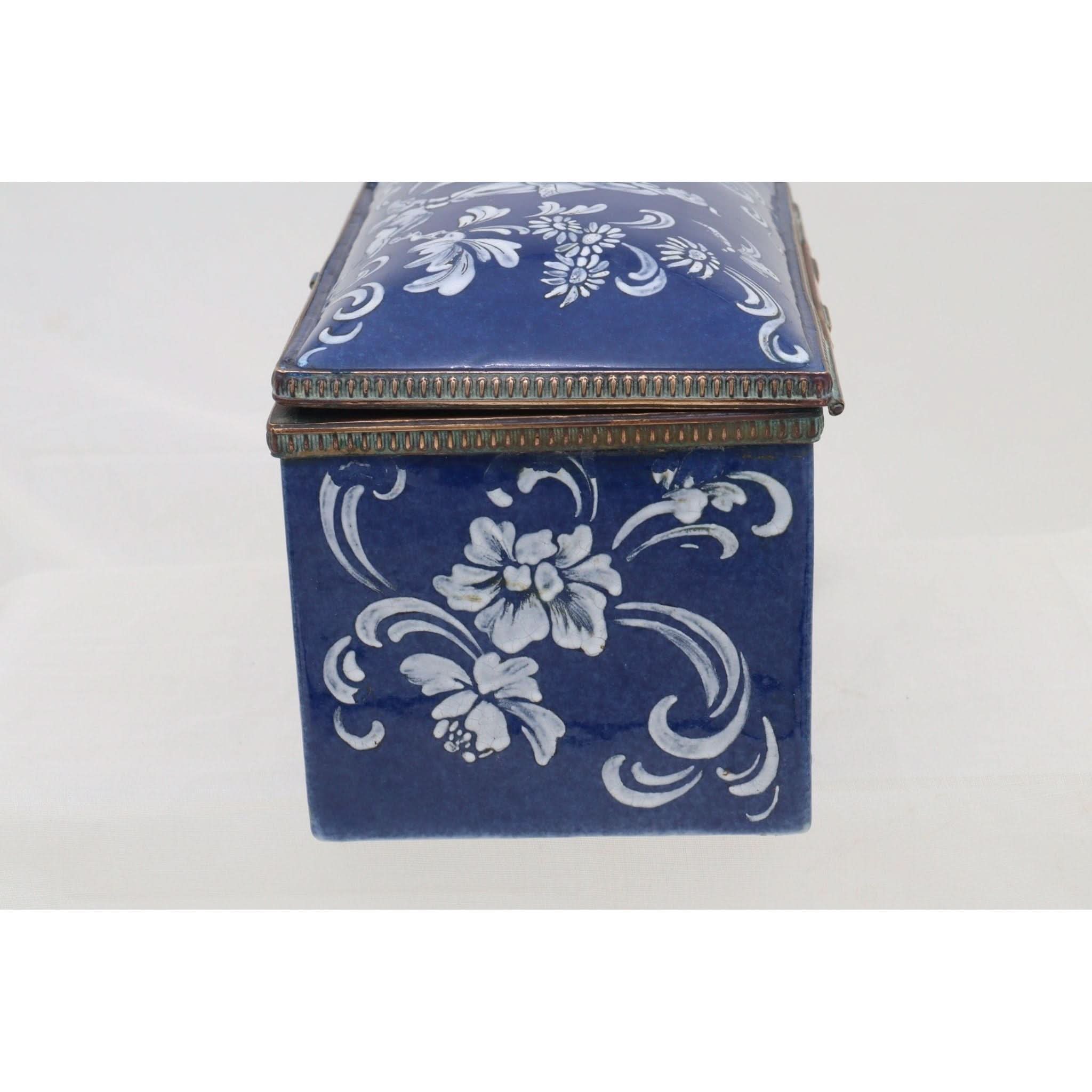 This large enamelled porcelain box by Samson of Paris, is decorated on the lid and front with hand painted Chinoiserie style scenes copying similar English and European depictions of Chinese life from the late 1700's. The two ends, and the back feature hand painted flowers and arabesques, all on a dark blue ground. The inner part of the lid carries a hand gilded spray of flowers. Edme Samson had a porcelain factory which specialised in copies (or fakes if you are feeling less than generous), of items from the previous century. Today his items have become collectable in their own right. It measures 183 mm (7.25 inches) in width, 115 mm (4.5 inches) in depth and stands 121 mm (4.75 inches) high. It has lost a small amount of the white enamel and the clip that held the lid to the body is also missing. It would date from around 1890.