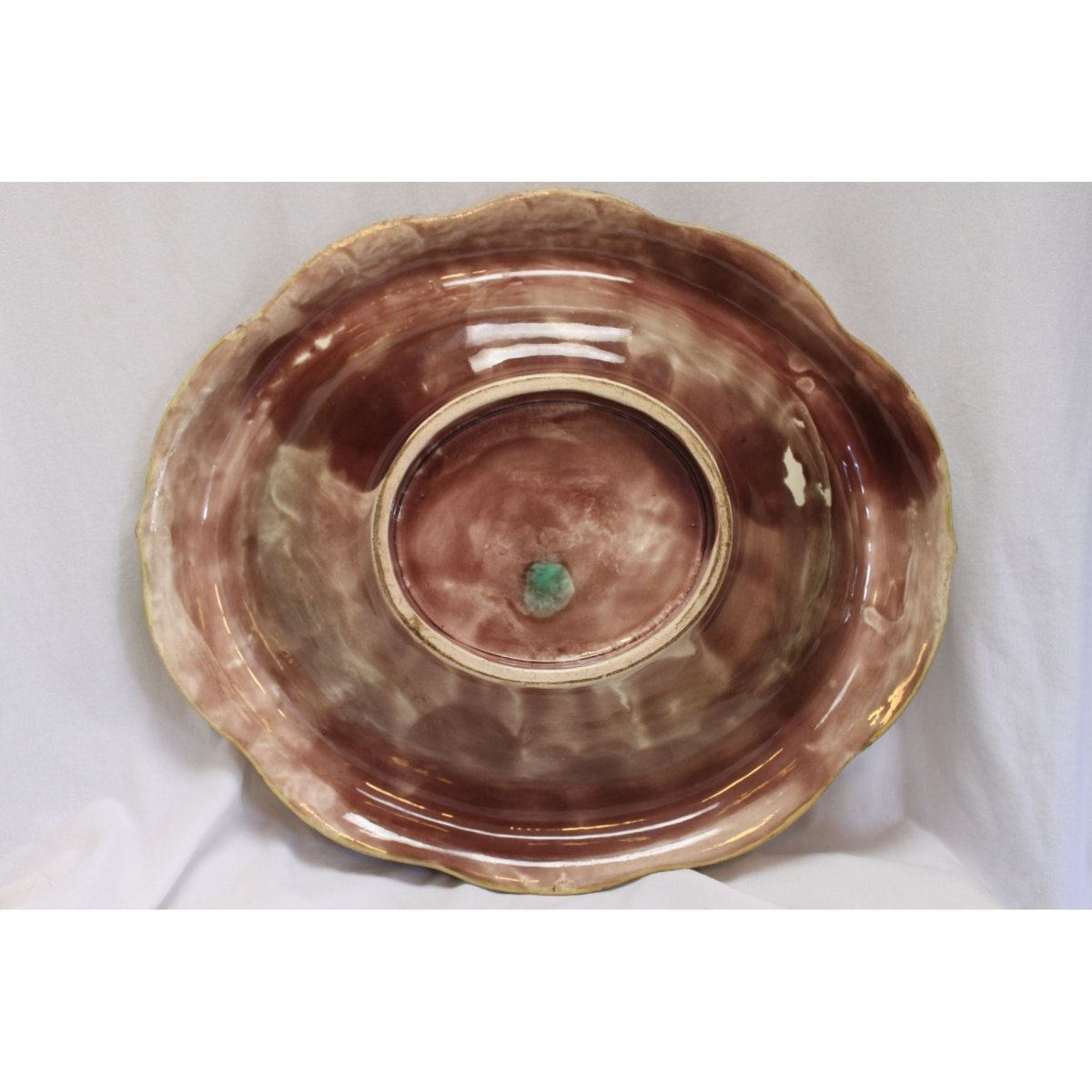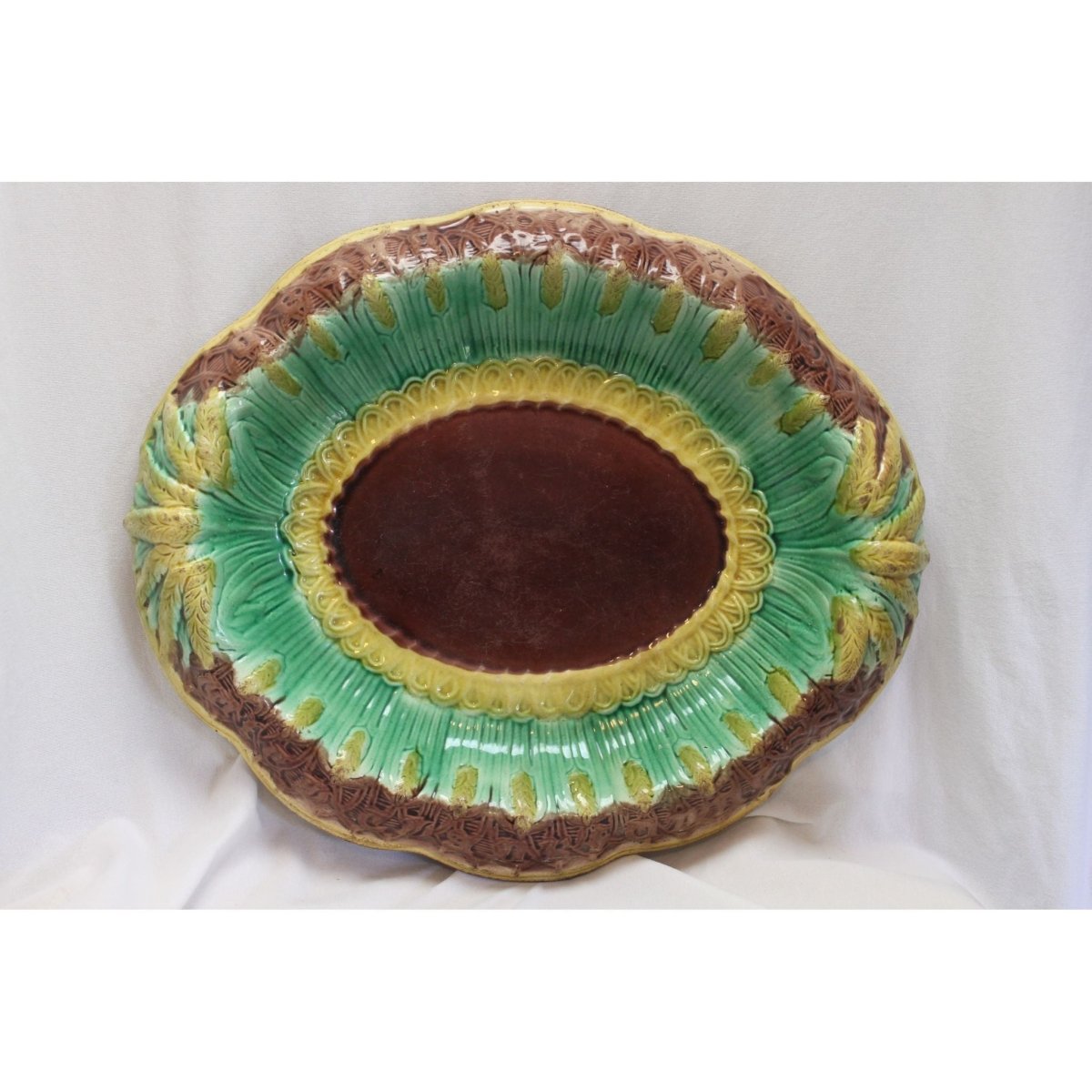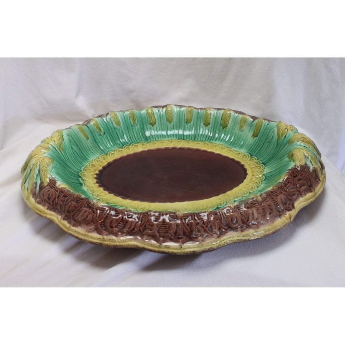 The outside of this majolica bread plate or tray is encircled with the motto "Eat thy bread with thankfulness". Central to this plate is a representation of a basket which is surrounded by ears of wheat and foliage. It has been used with the central basket showing signs of use, and there are some slightly rough areas to the rim, but just imagine the conversations it has heard over the last 140 or so years. The width is 335 mm (13.25 inches), the depth is 287 mm (11.25 inches) and it stands 45 mm (1.75 inches) high. C 1880.